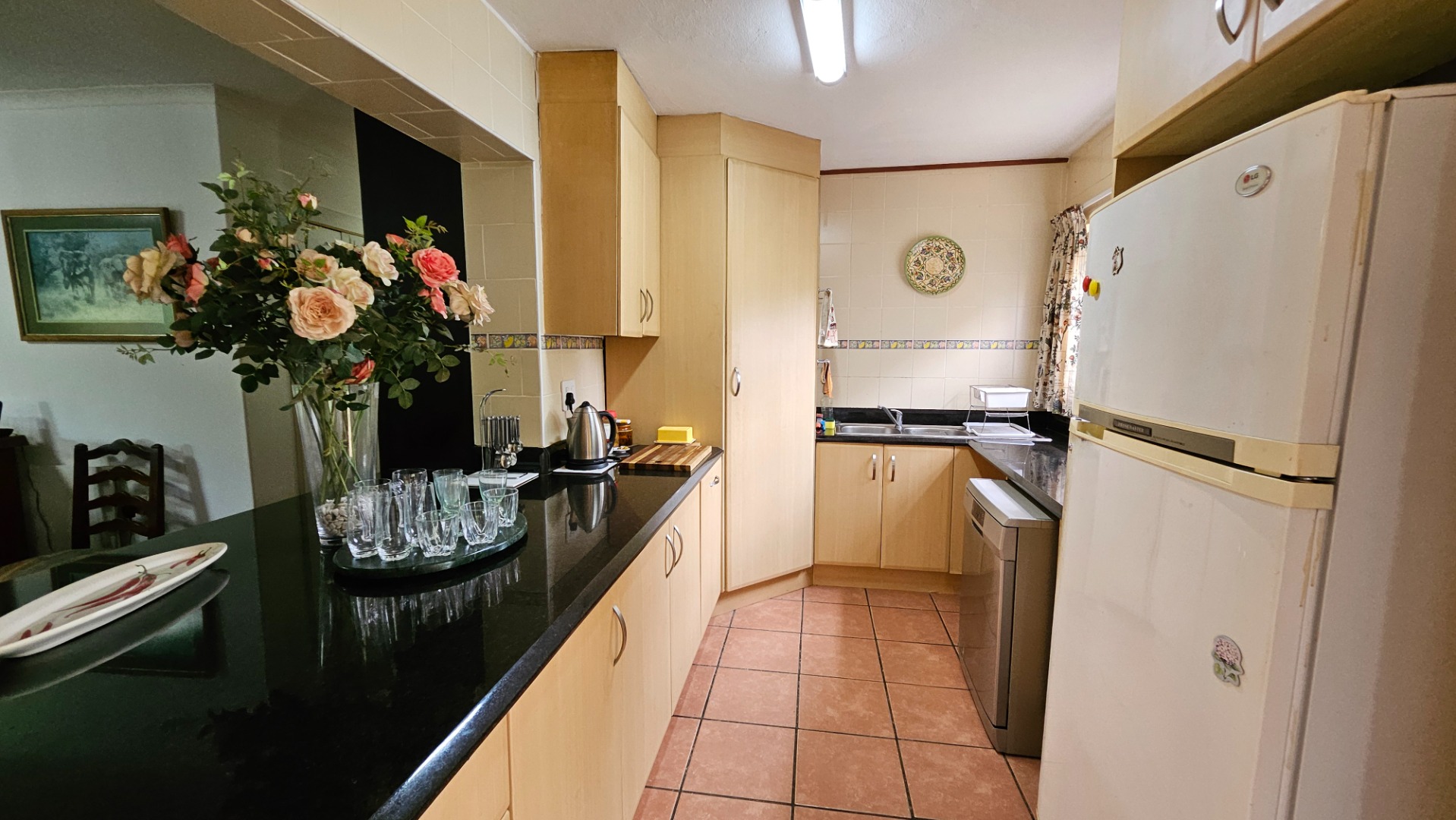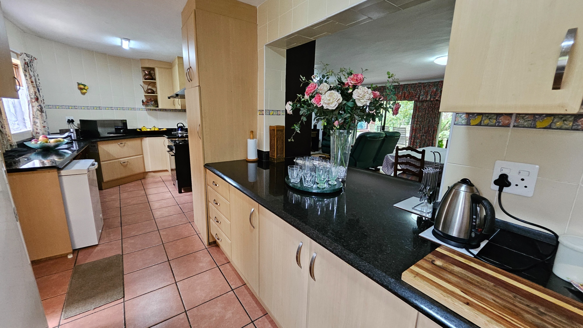 The beautifully appointed granite top kitchen offers plenty of storage space, and the combined open plan living room opens onto a covered patio with garden views.