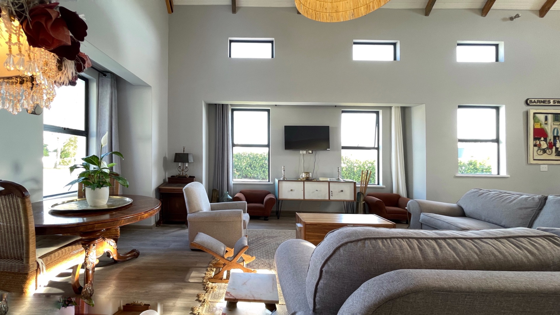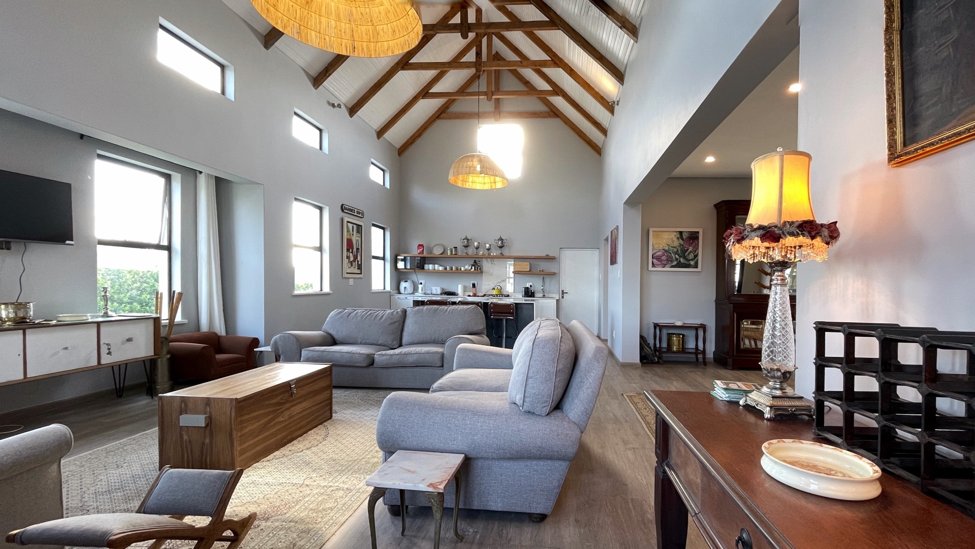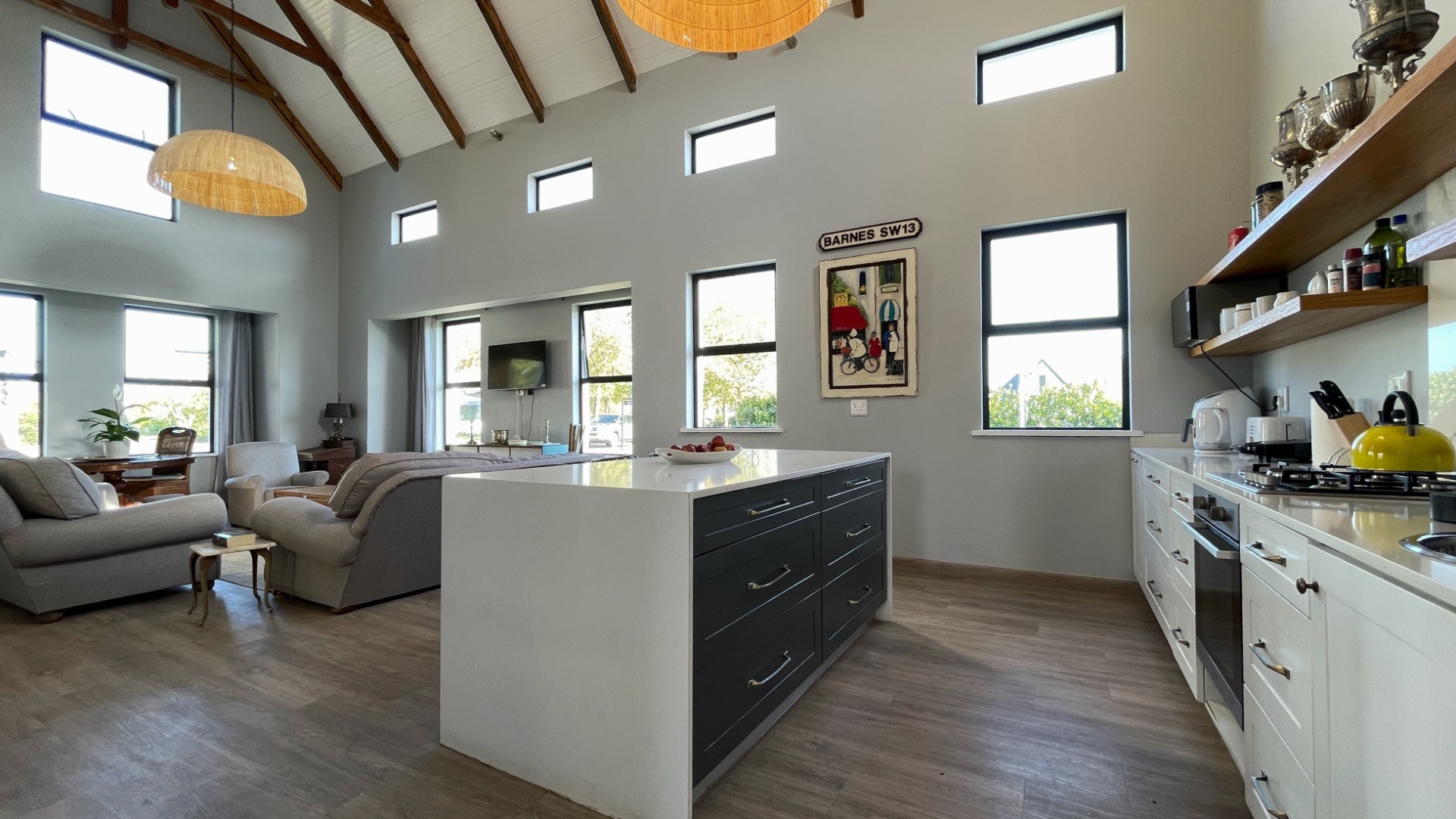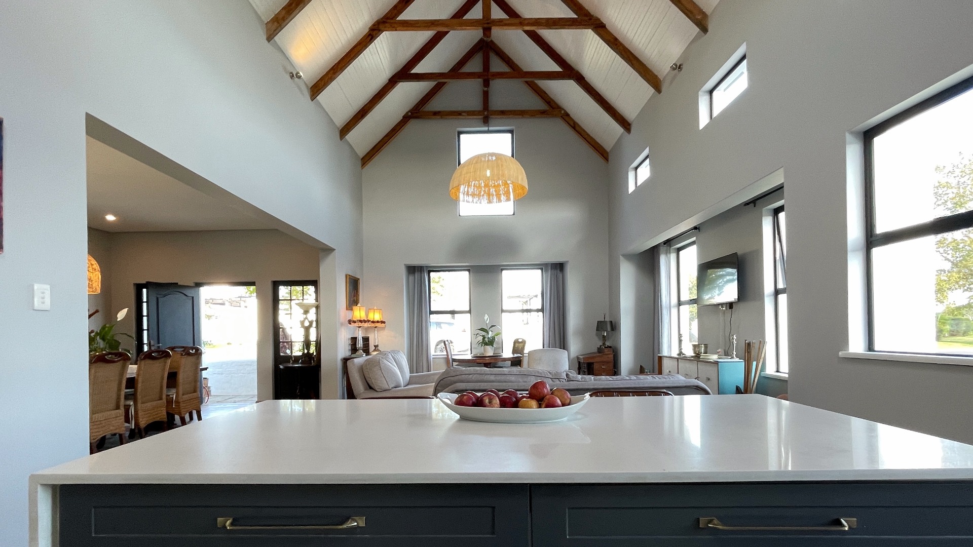 High ceilings with exposed reclaimed yellowwood beams and contemporary lighting add charm to the lounge, while the modern kitchen features white Caesarstone countertops, sleek cabinetry, and a striking central island. A separate scullery provides added convenience.