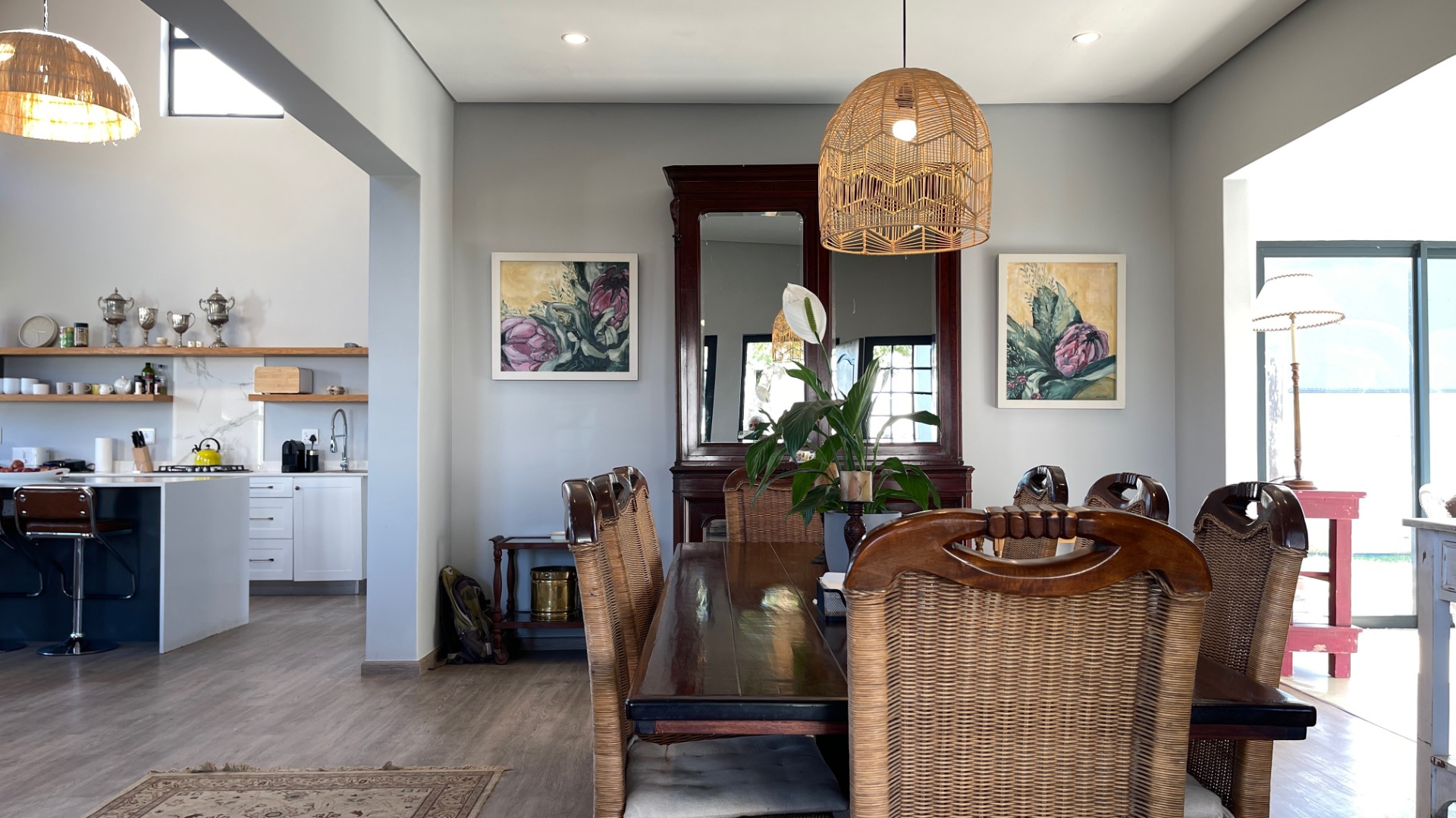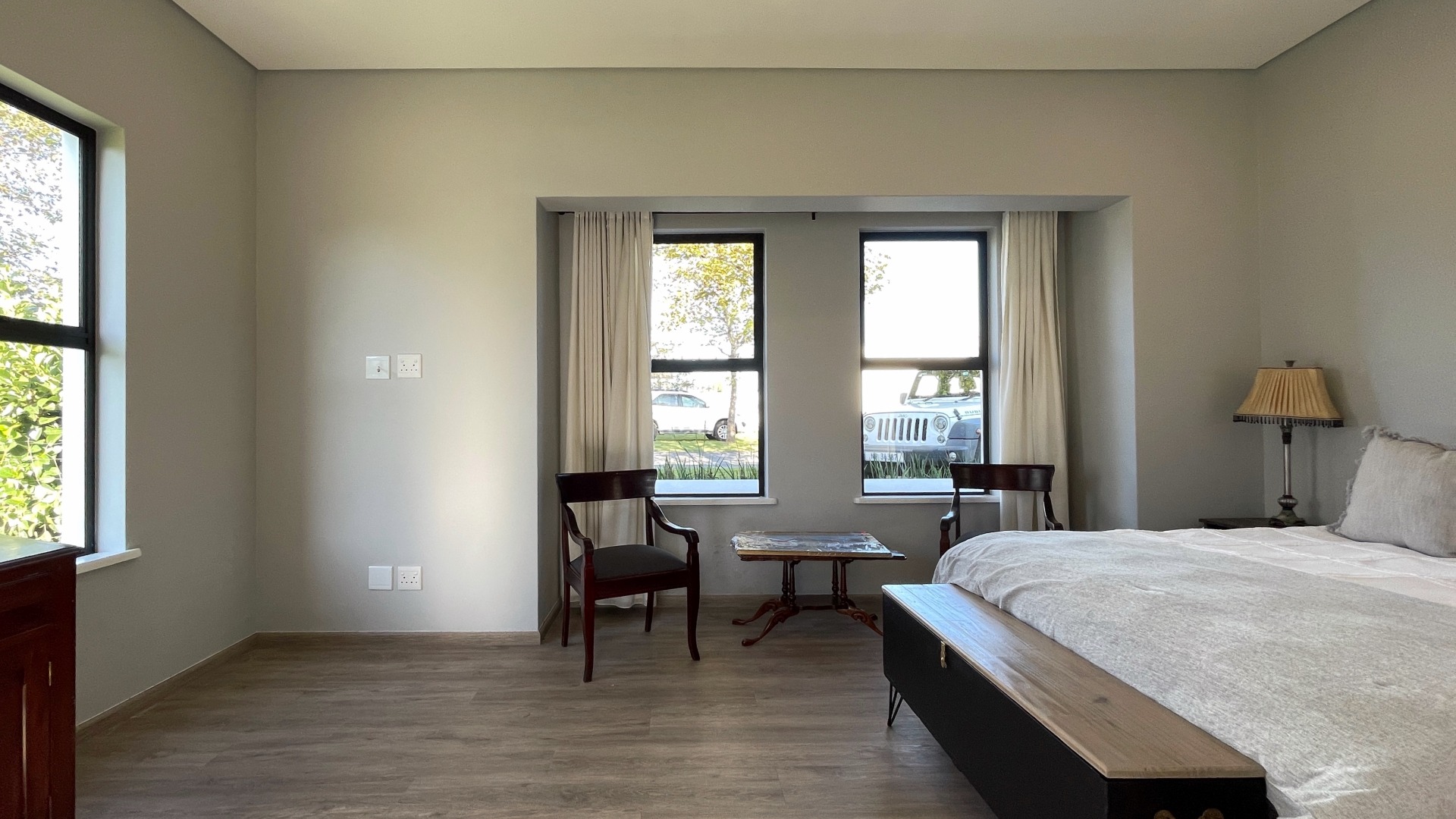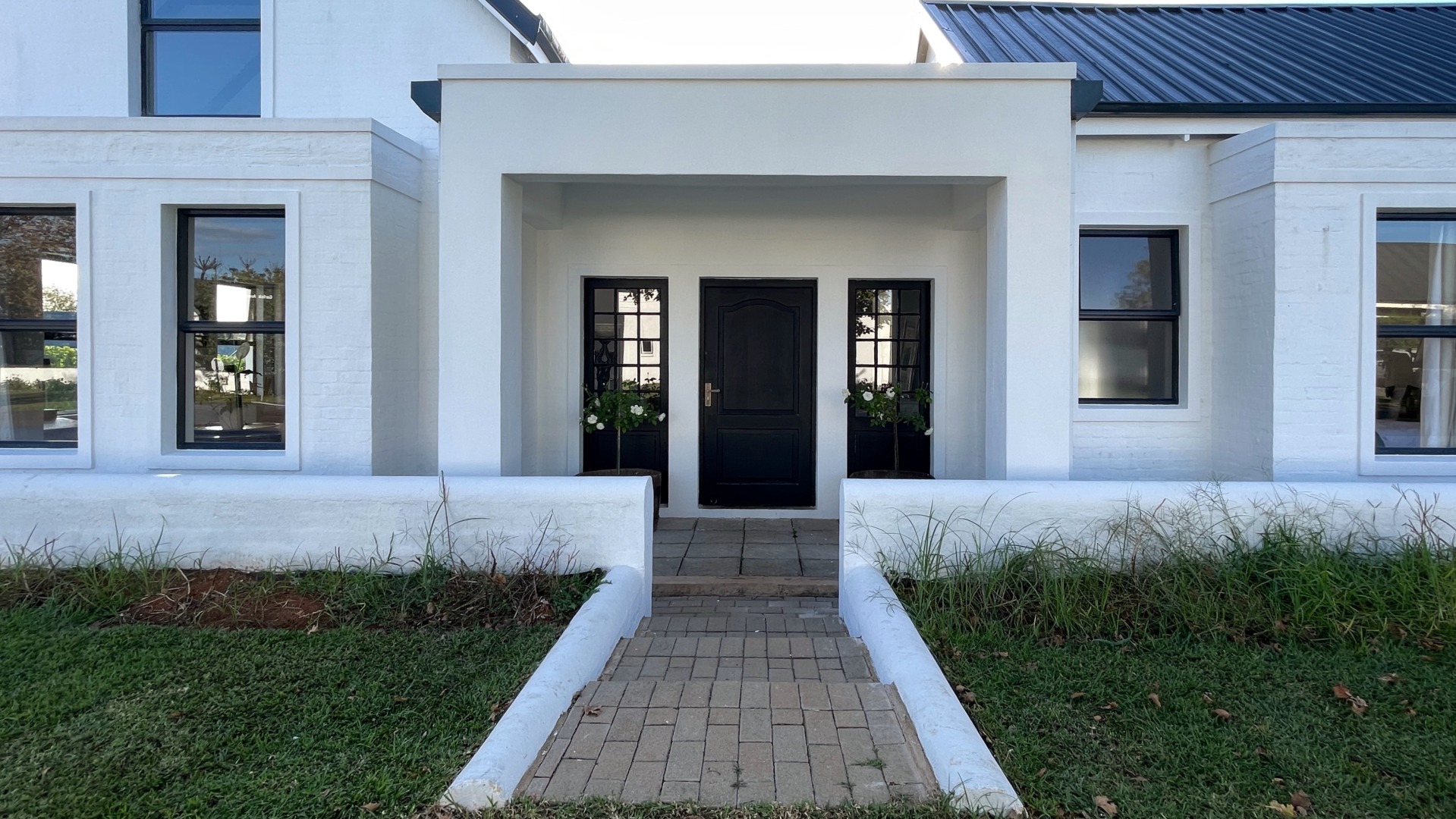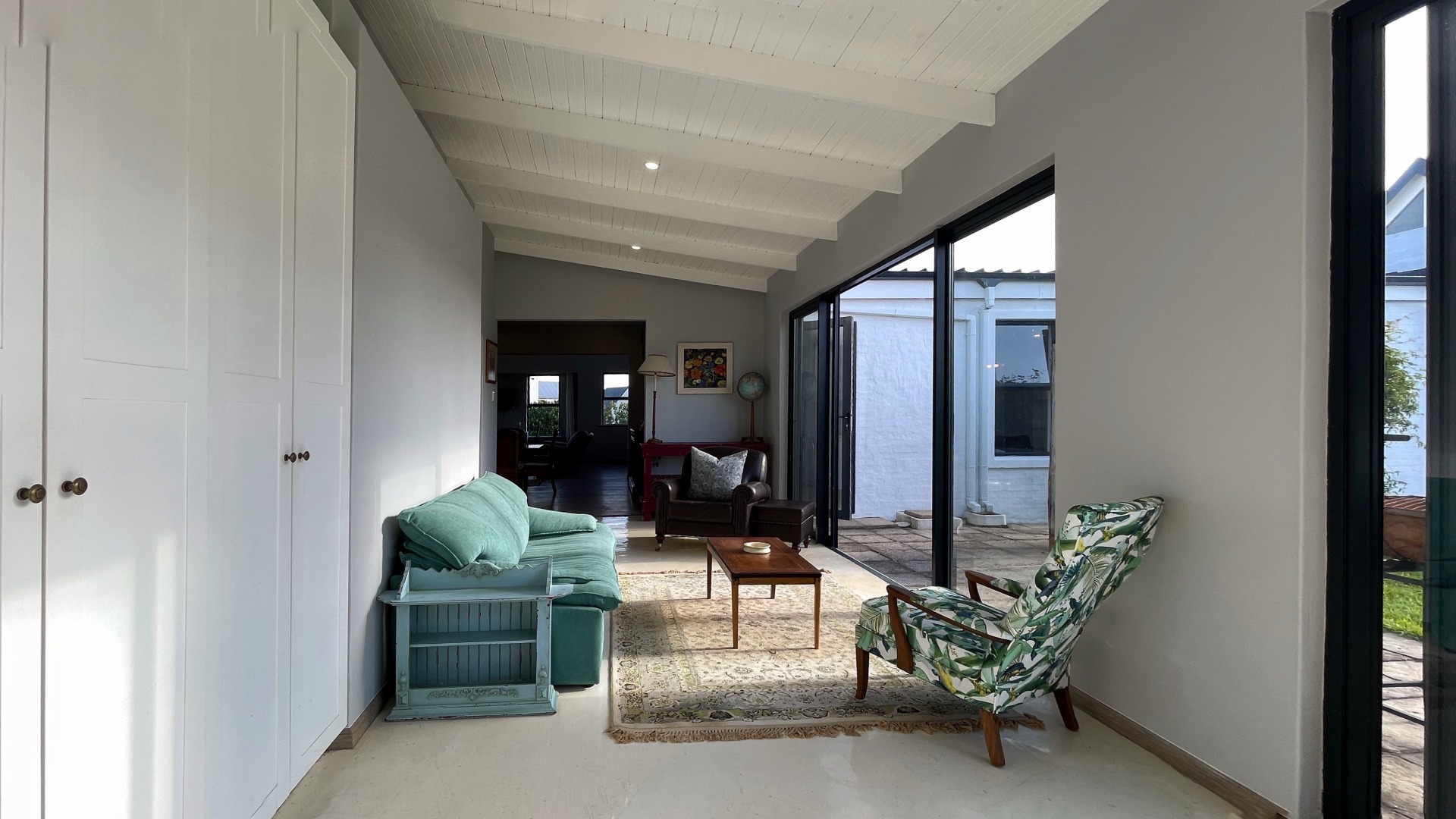 High ceilings with exposed reclaimed yellowwood beams and contemporary lighting add charm to the lounge, while the modern kitchen features white Caesarstone countertops, sleek cabinetry, and a striking central island. A separate scullery provides added convenience.