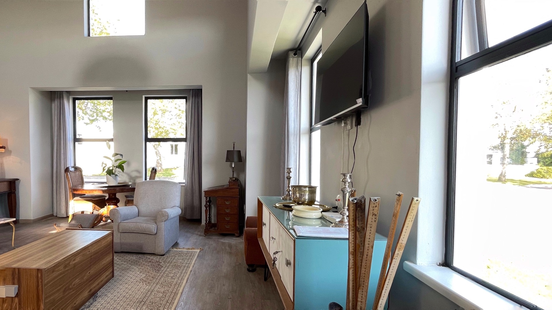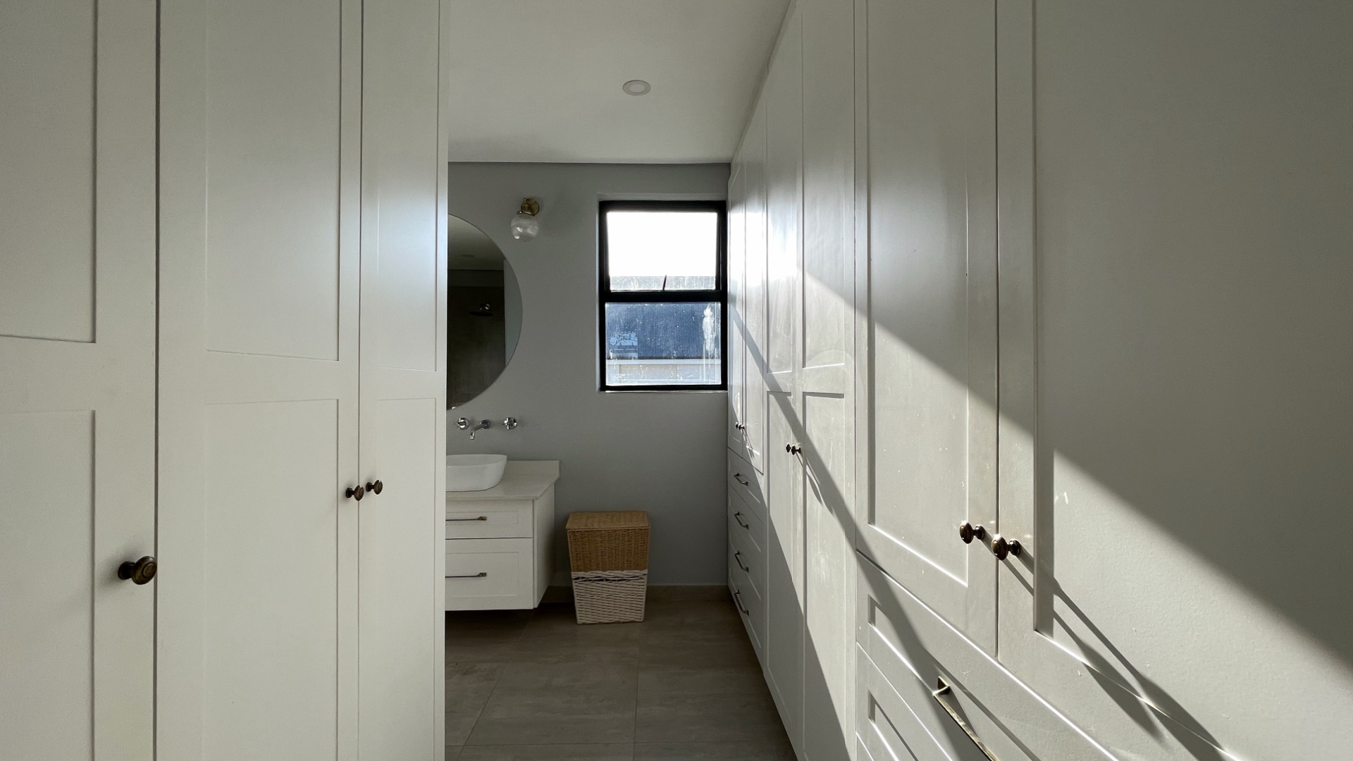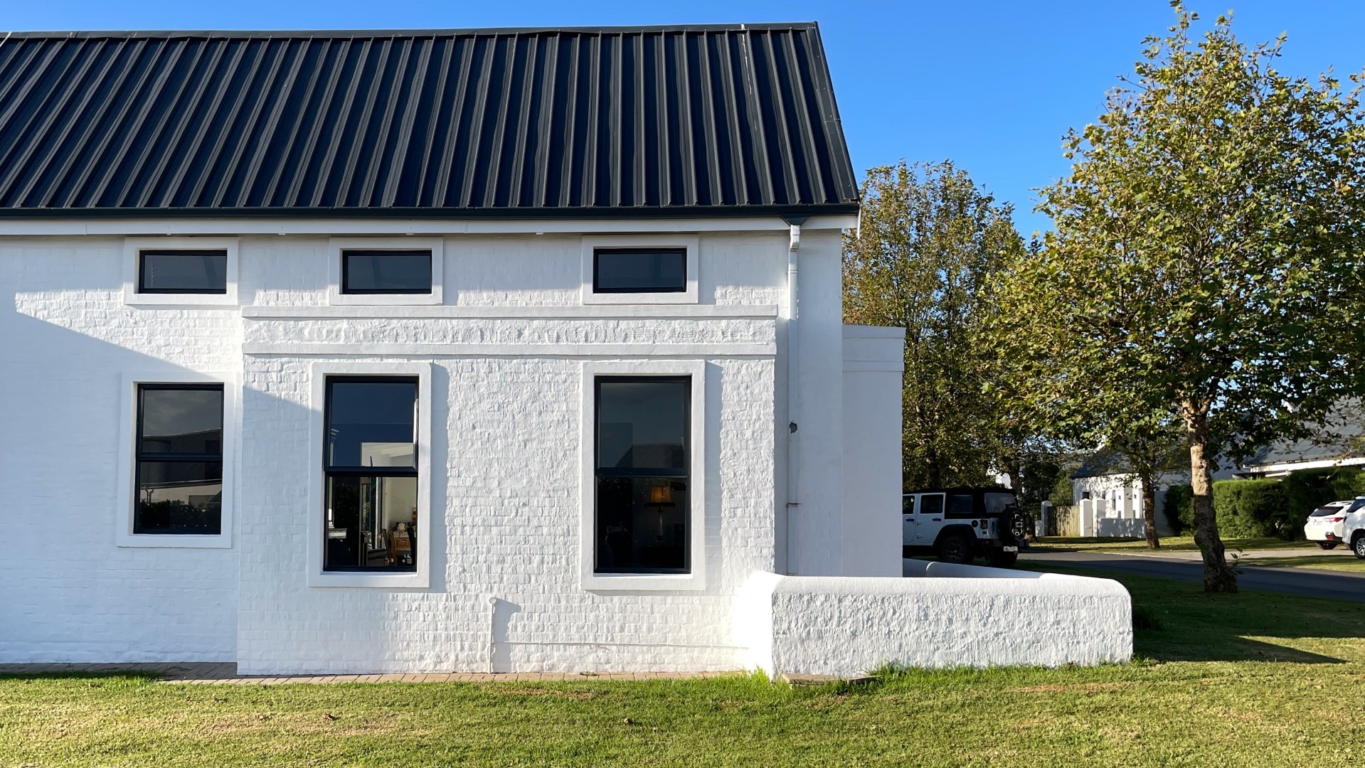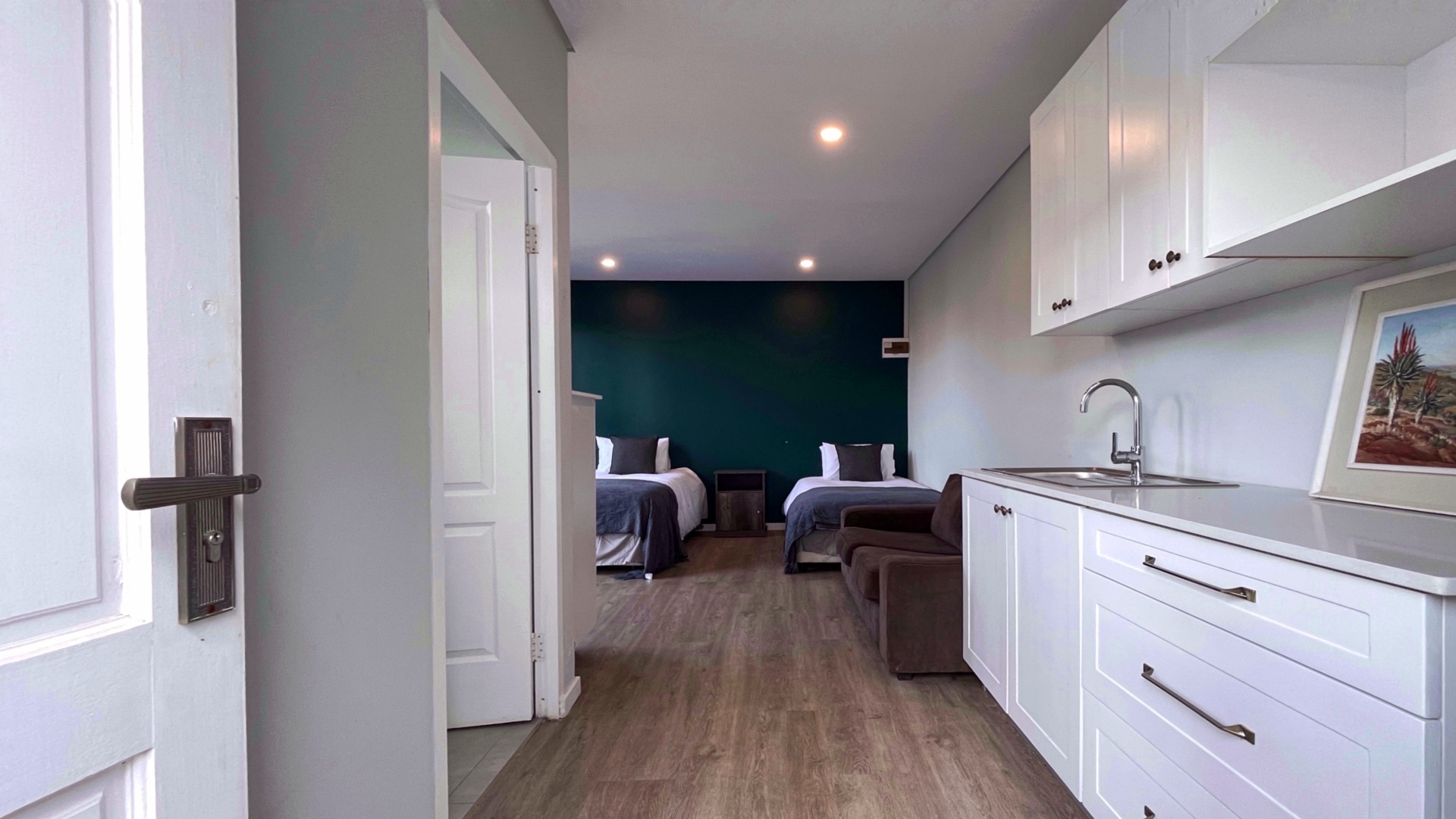 High ceilings with exposed reclaimed yellowwood beams and contemporary lighting add charm to the lounge, while the modern kitchen features white Caesarstone countertops, sleek cabinetry, and a striking central island. A separate scullery provides added convenience.
