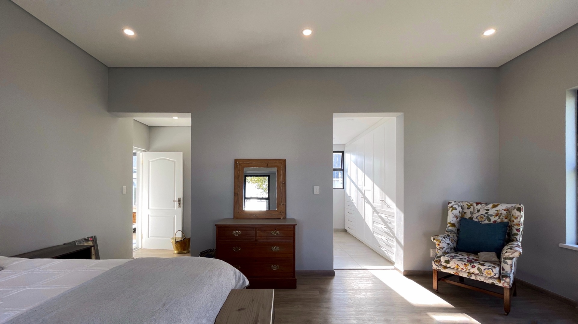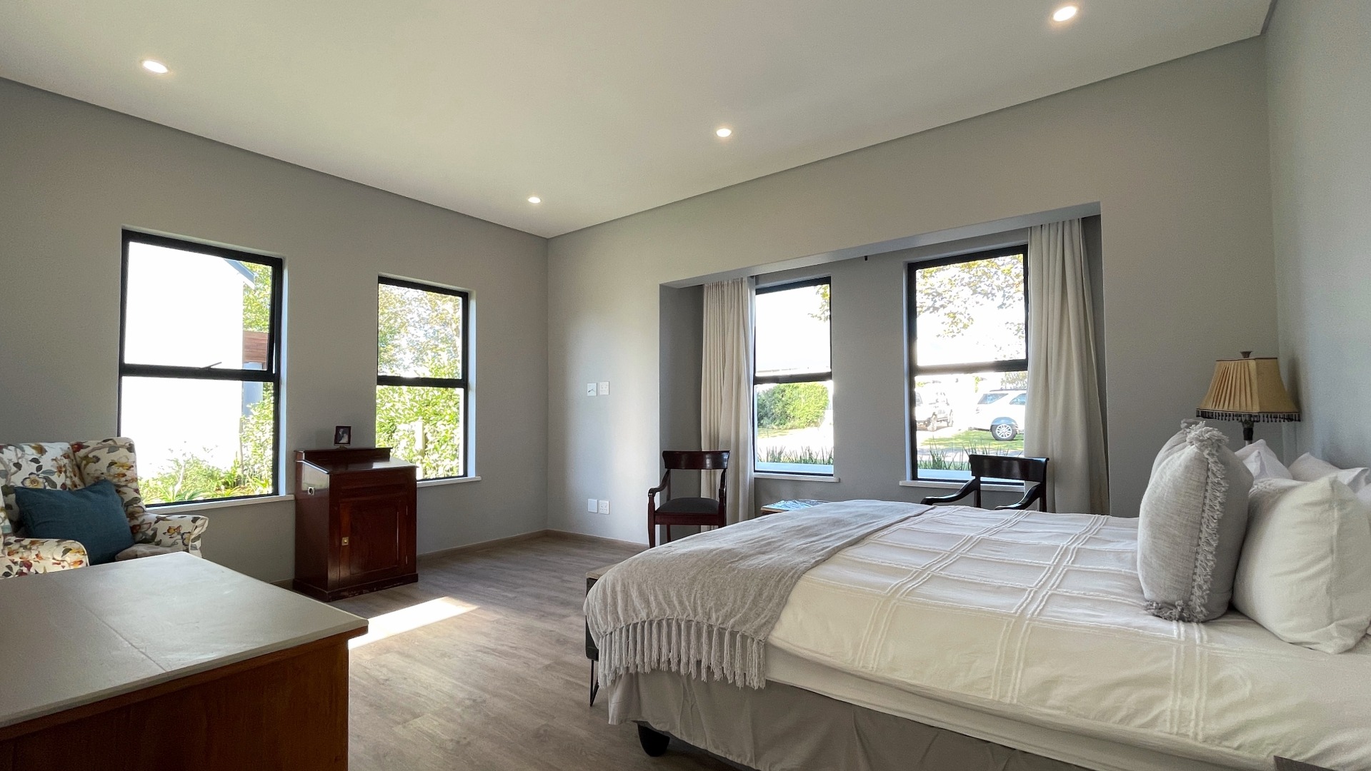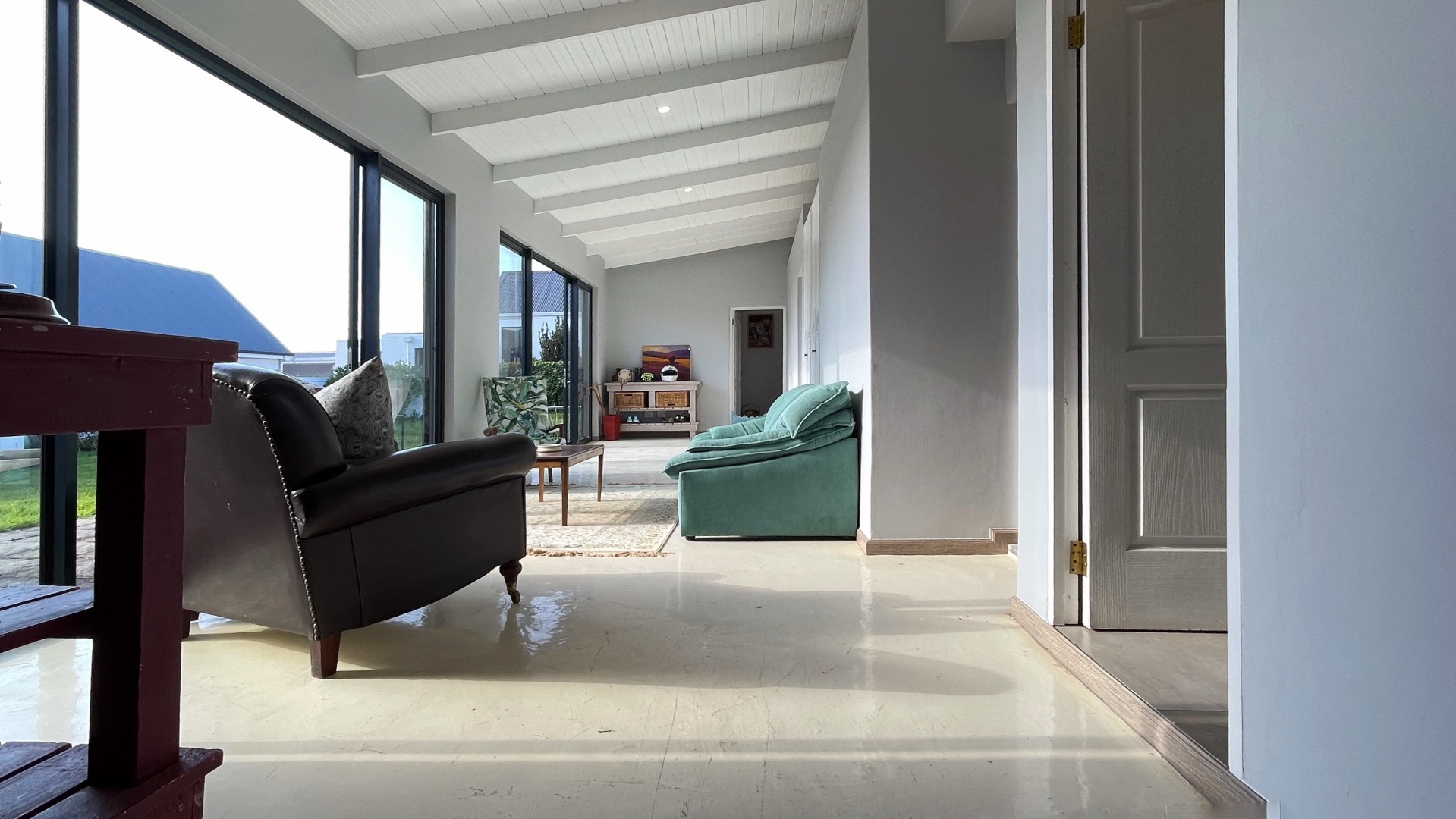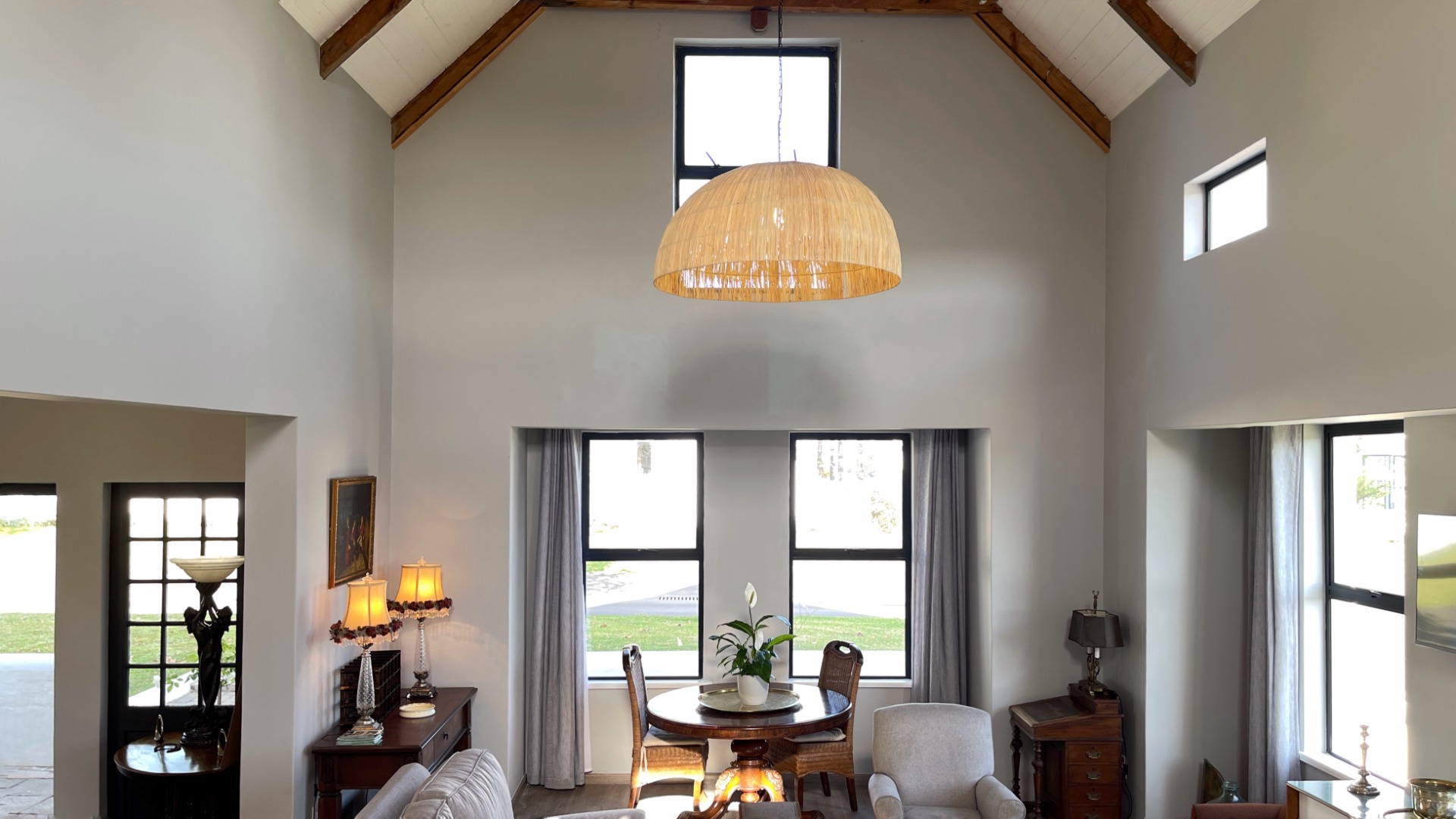 High ceilings with exposed reclaimed yellowwood beams and contemporary lighting add charm to the lounge, while the modern kitchen features white Caesarstone countertops, sleek cabinetry, and a striking central island. A separate scullery provides added convenience.