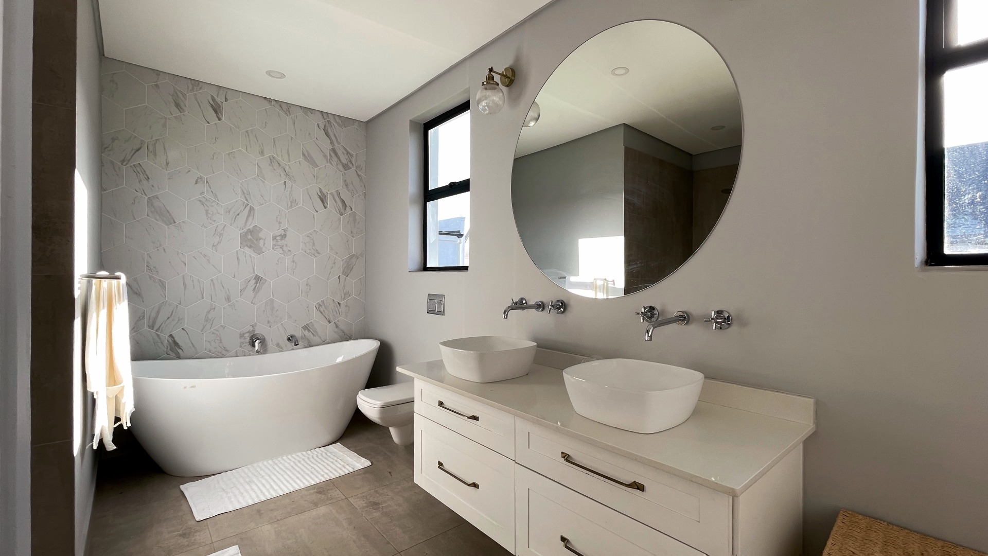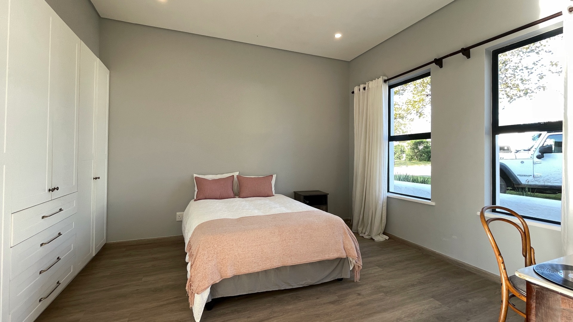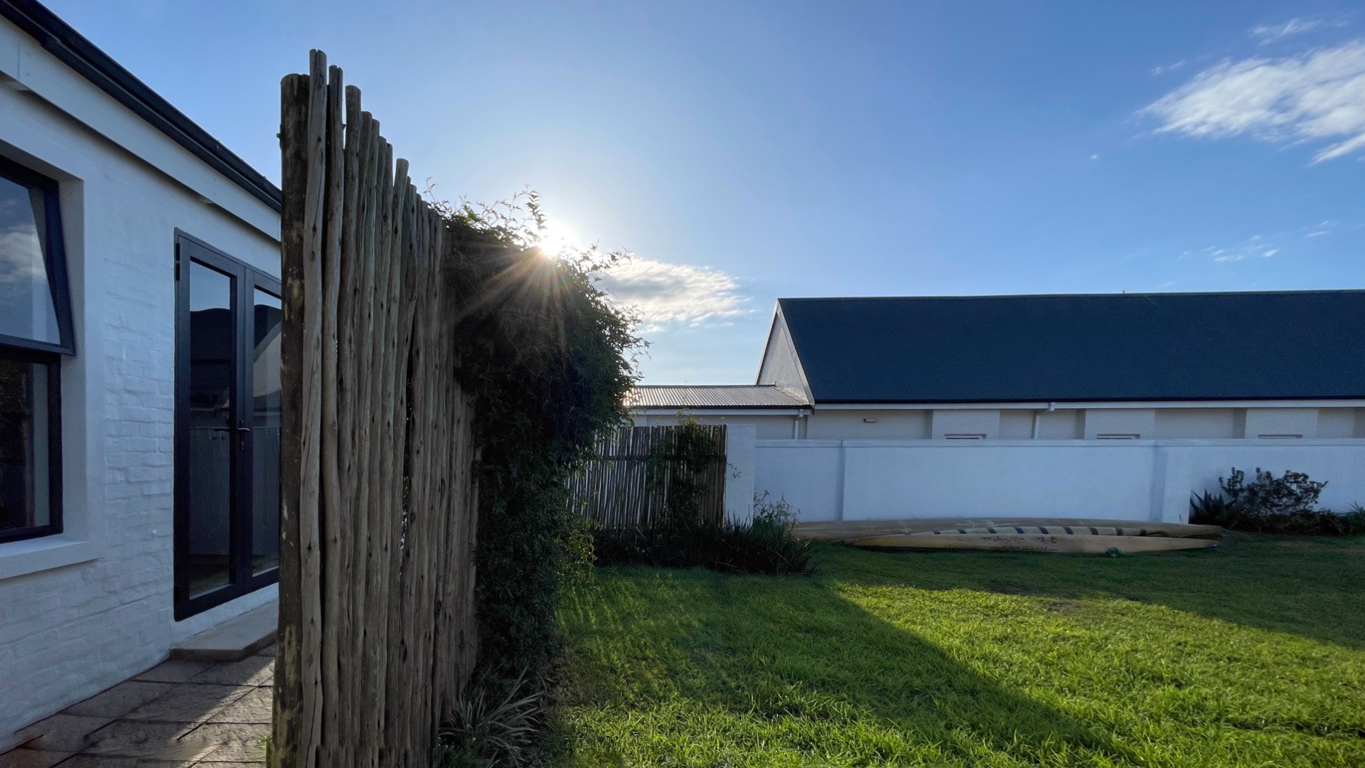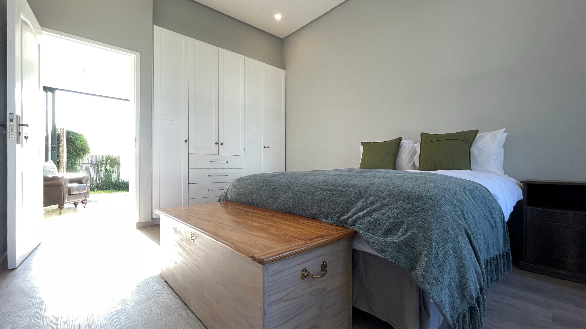 High ceilings with exposed reclaimed yellowwood beams and contemporary lighting add charm to the lounge, while the modern kitchen features white Caesarstone countertops, sleek cabinetry, and a striking central island. A separate scullery provides added convenience.