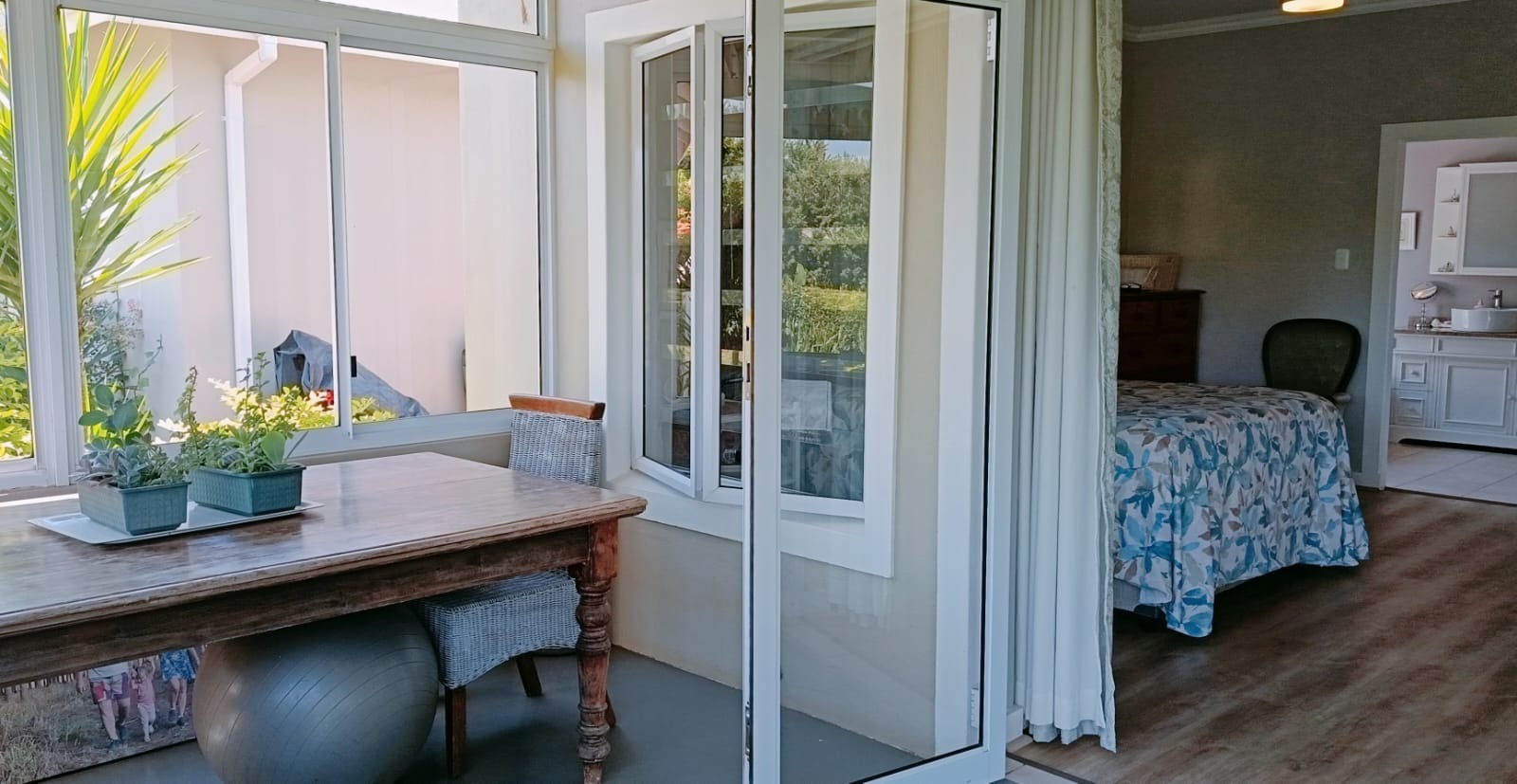 Outward opening doors from the lounge and bedrooms onto a sunny patio