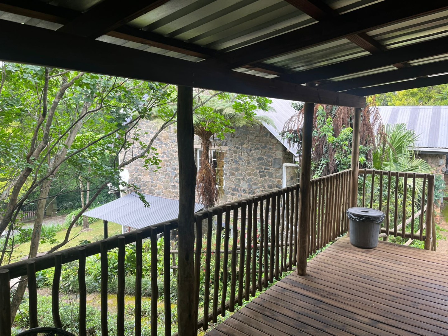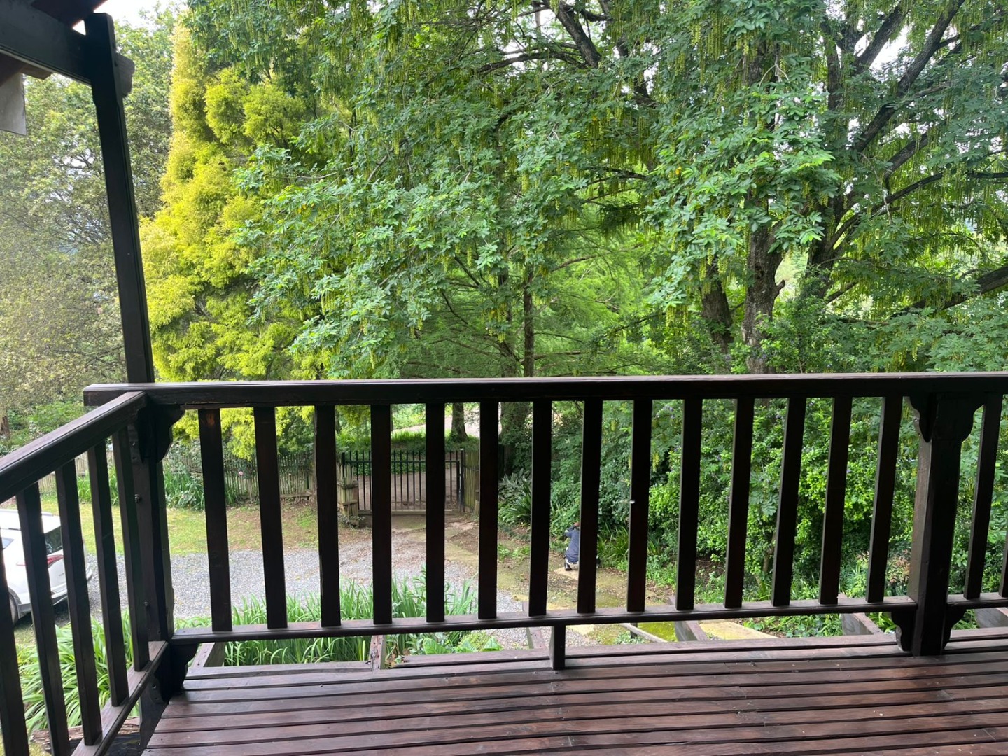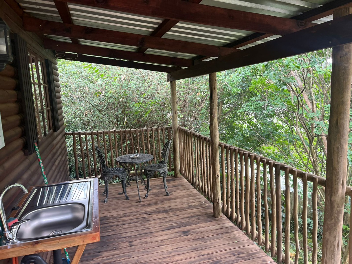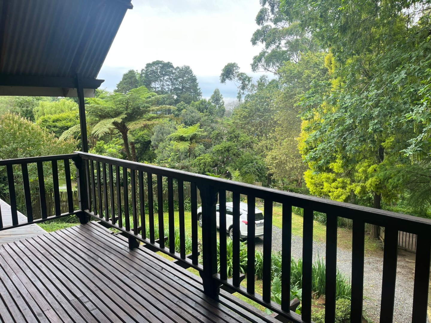 The open-plan layout features a welcoming lounge, dining room, and functional kitchenette, all highlighted by beautiful wooden beams and an inviting natural atmosphere. Multiple balconies, covered porches, and timber decks provide stunning views of the lush treetops and a distant body of water - ideal spots for quiet mornings or sunset unwinding.