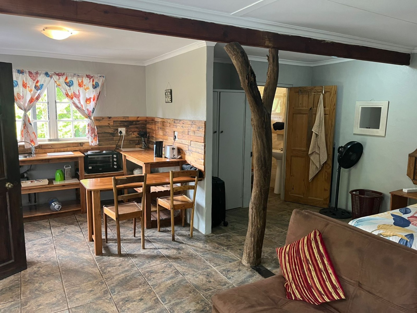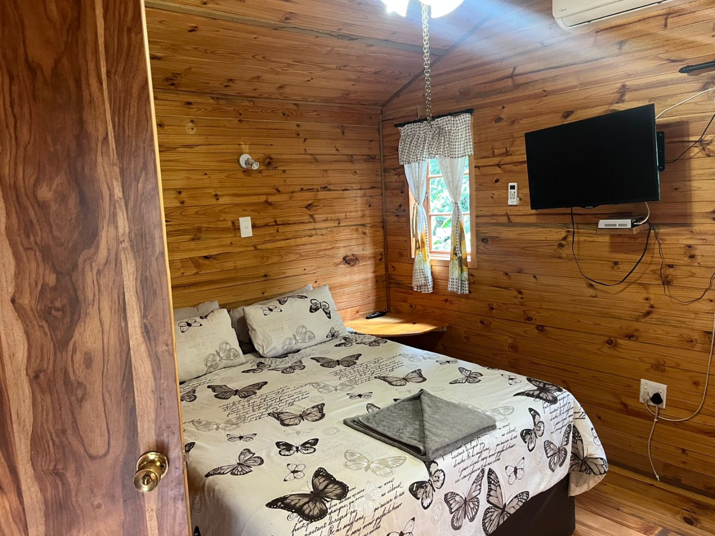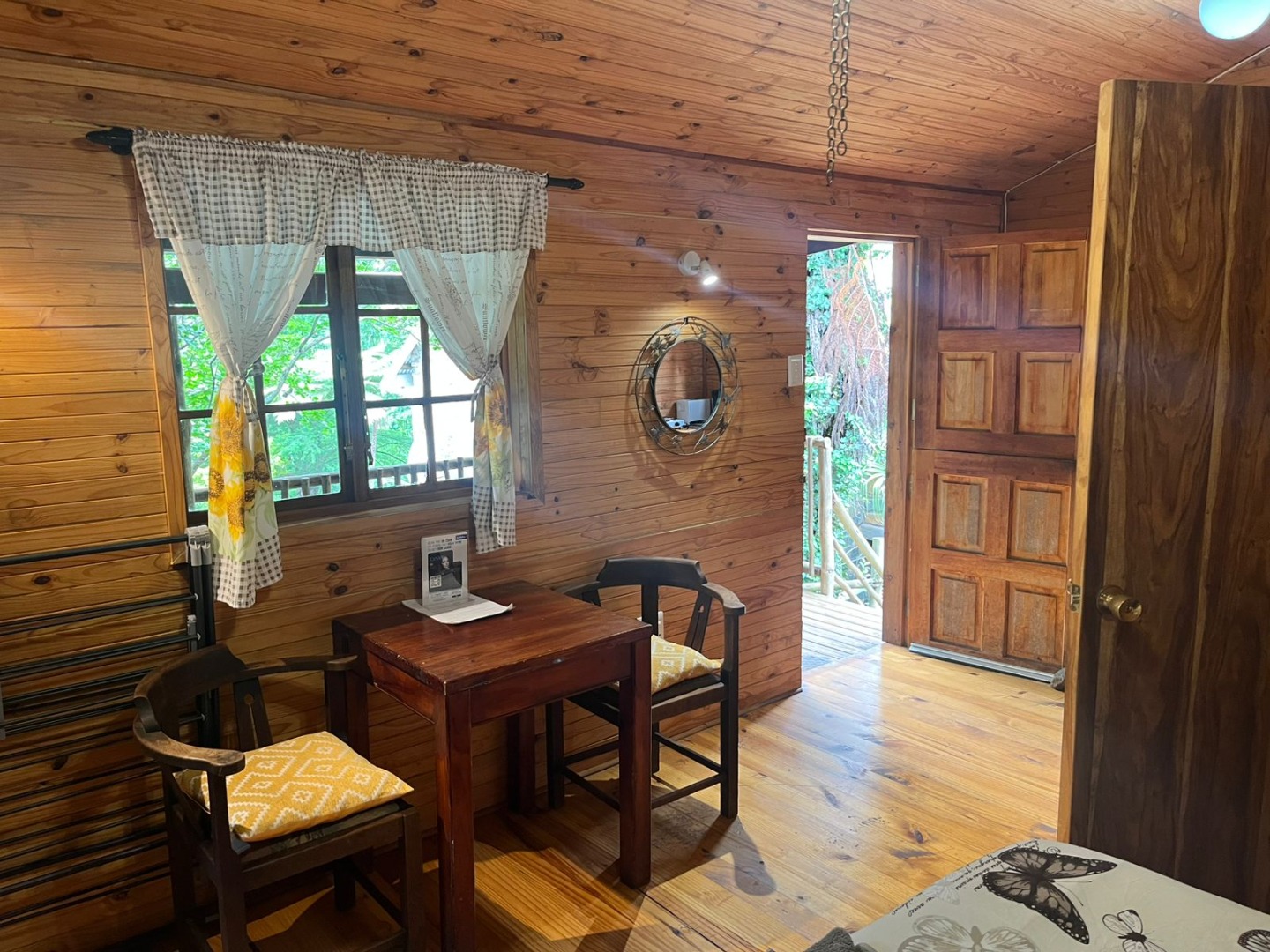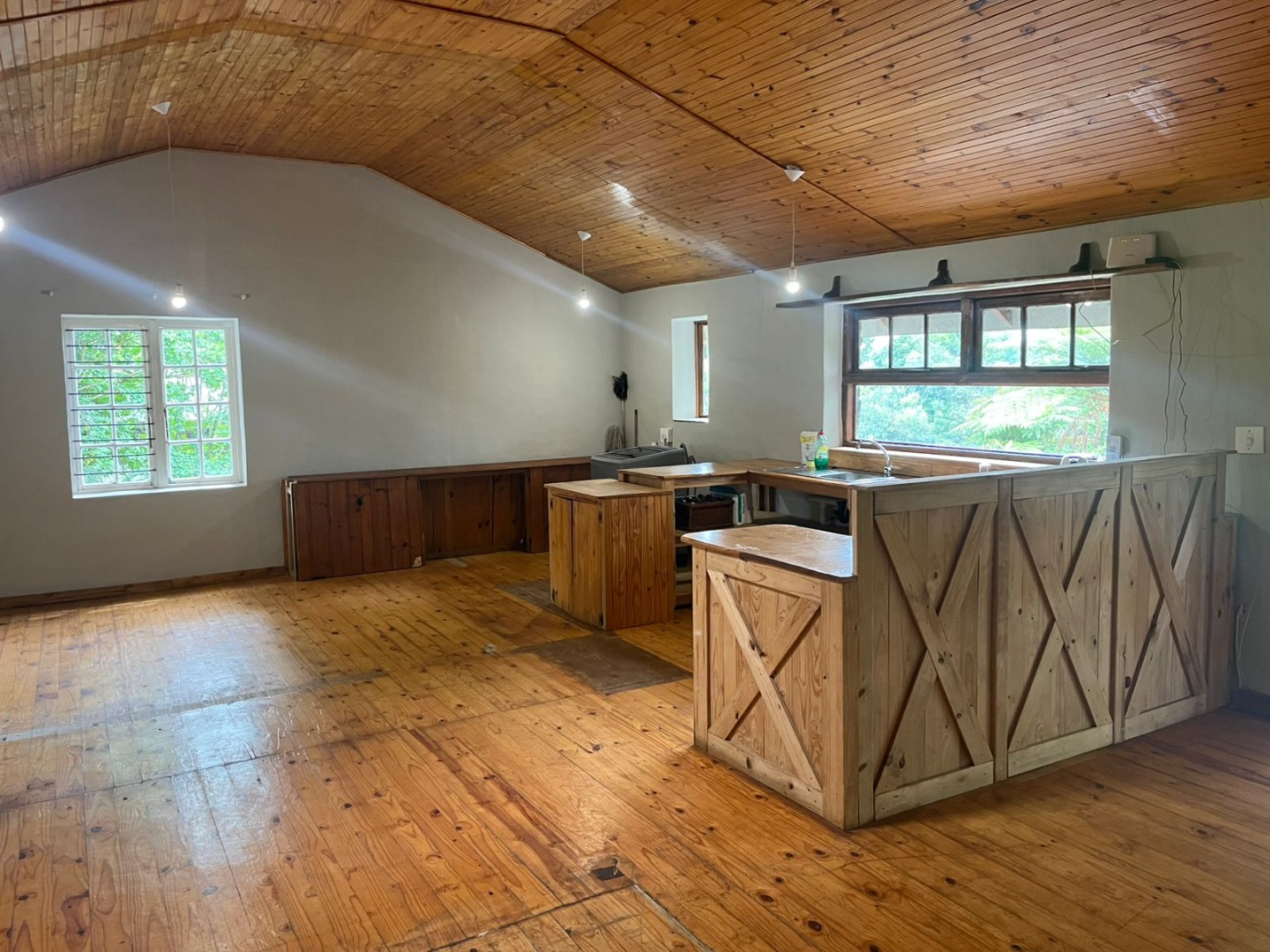 The open-plan layout features a welcoming lounge, dining room, and functional kitchenette, all highlighted by beautiful wooden beams and an inviting natural atmosphere. Multiple balconies, covered porches, and timber decks provide stunning views of the lush treetops and a distant body of water - ideal spots for quiet mornings or sunset unwinding.