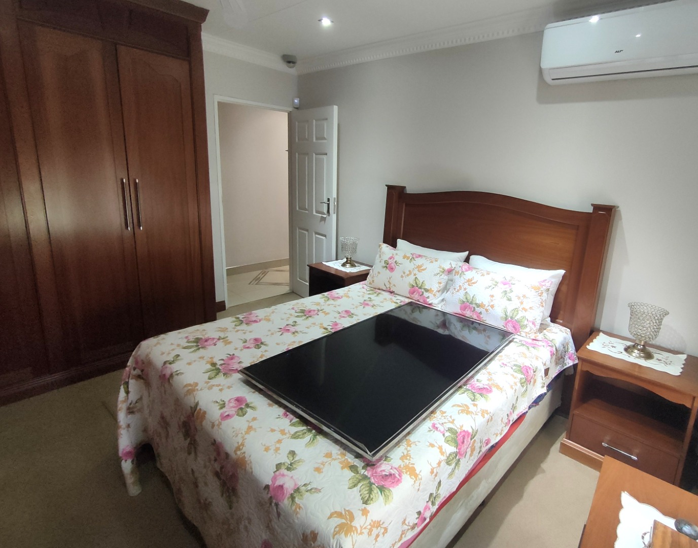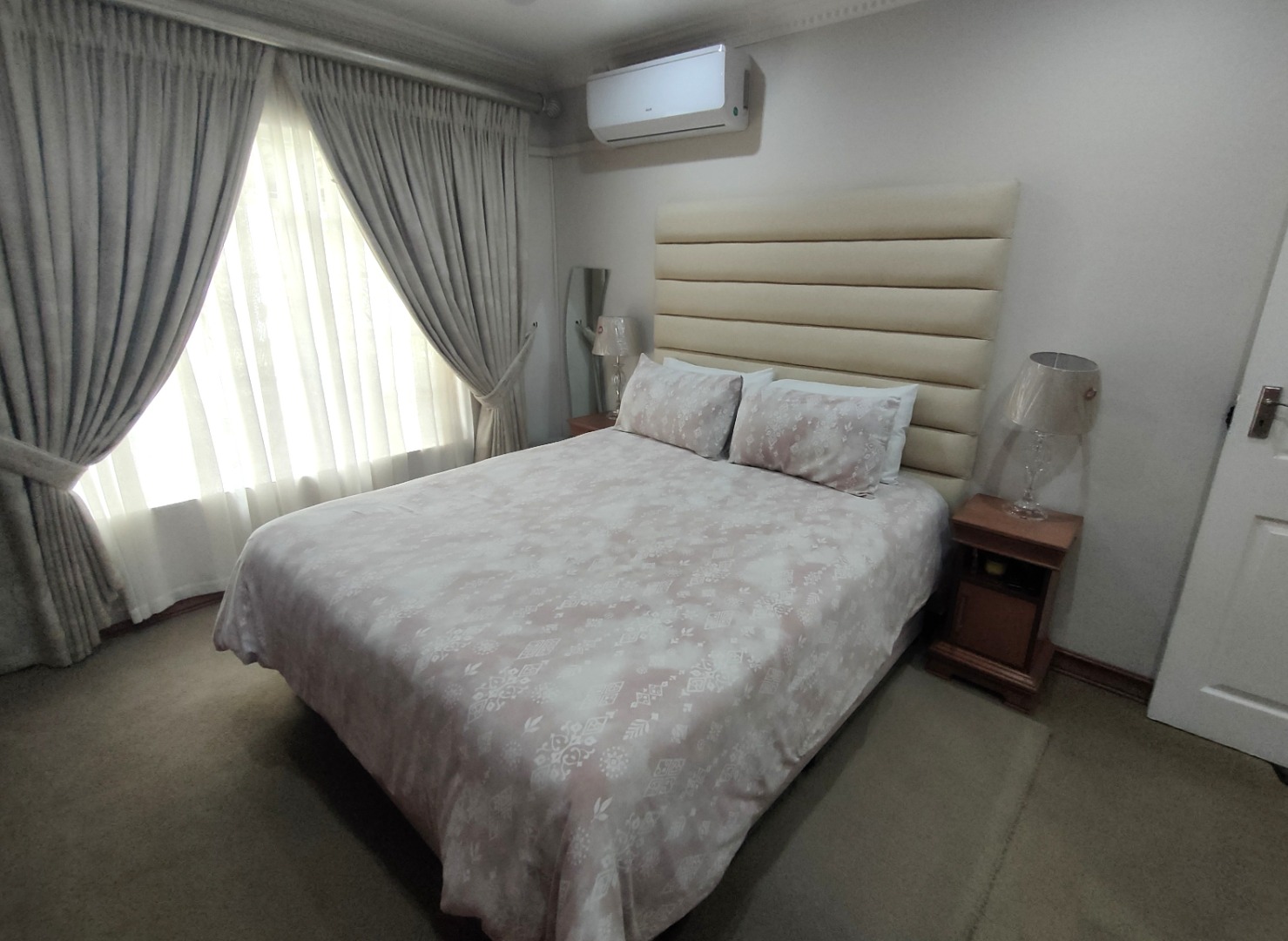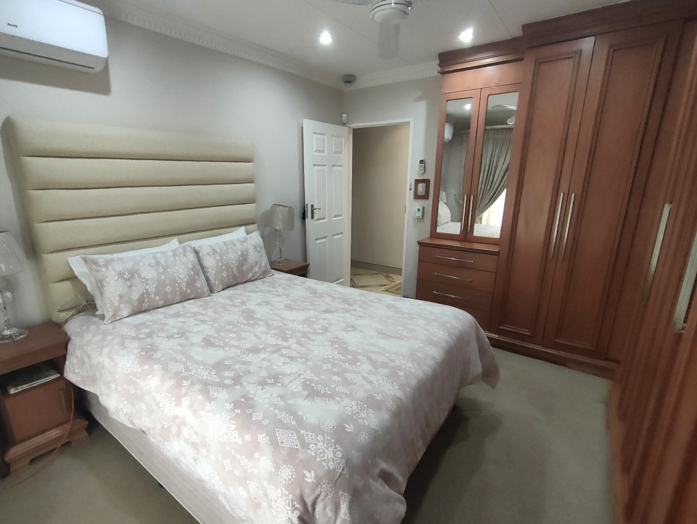 Inside, you’ll find three well-appointed bedrooms, each fitted with air-conditioning and generous built-in cupboards. The main bedroom includes its own ensuite bathroom, complemented by a separate family bathroom. A dedicated prayer room or study adds valuable flexibility.