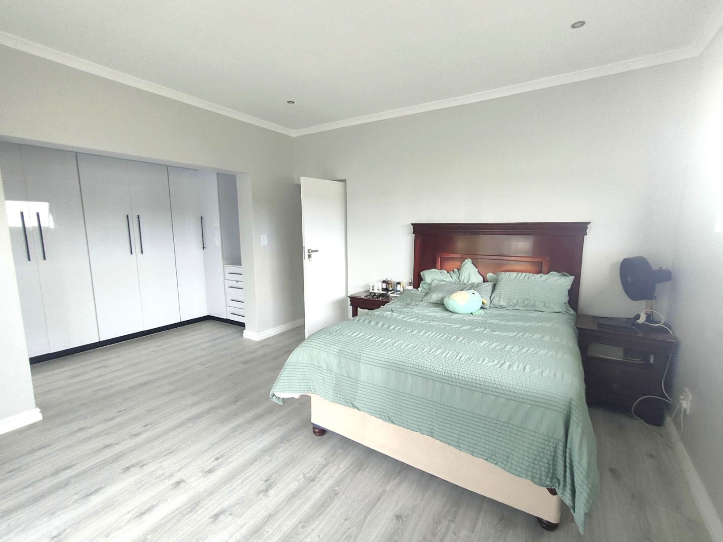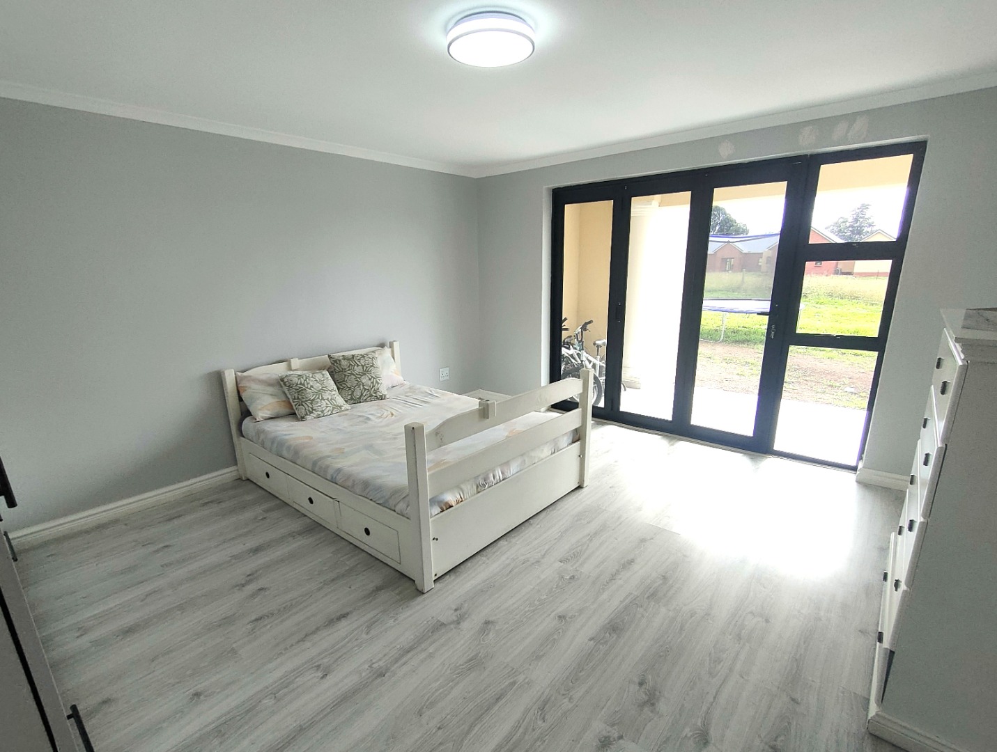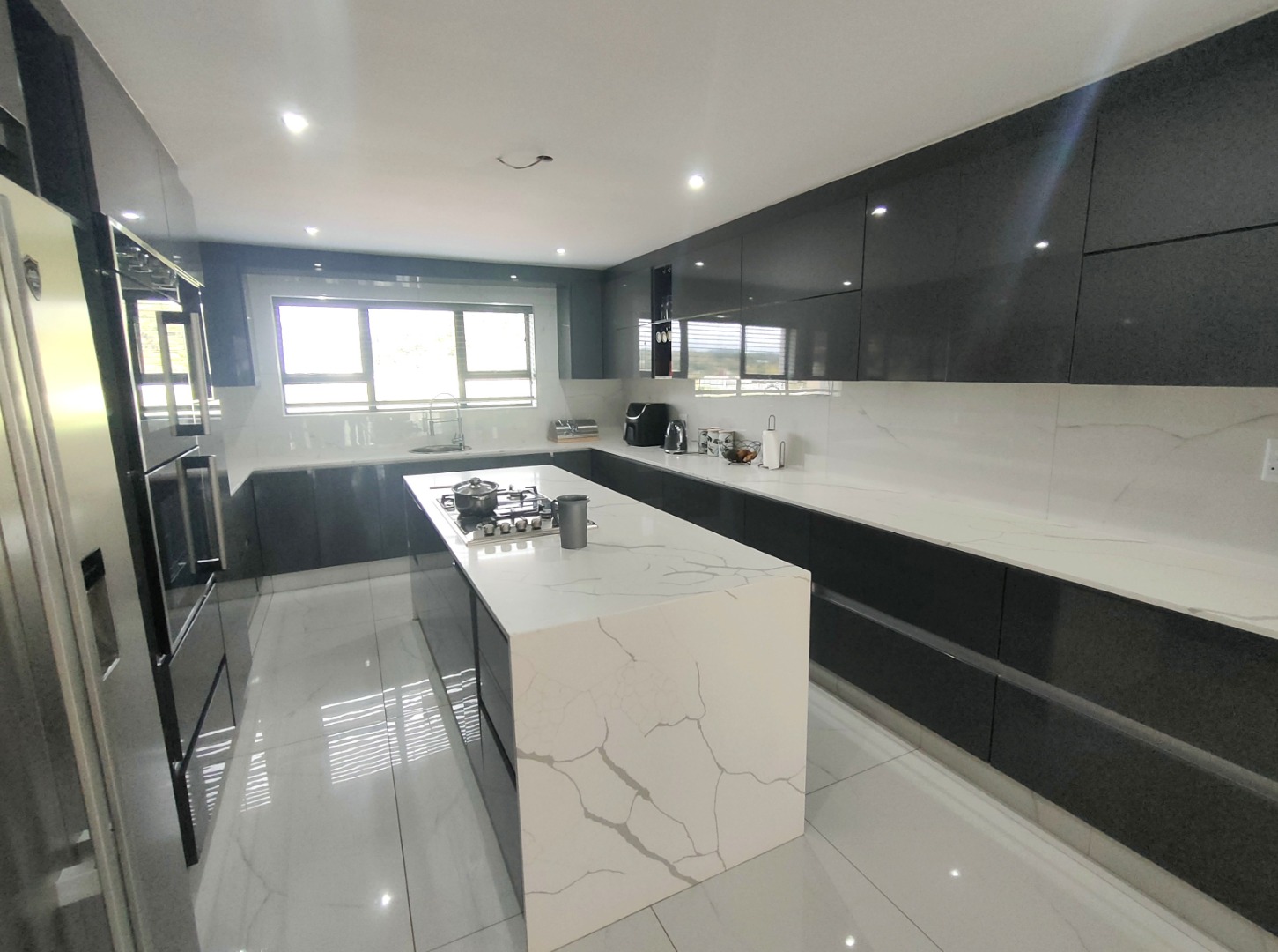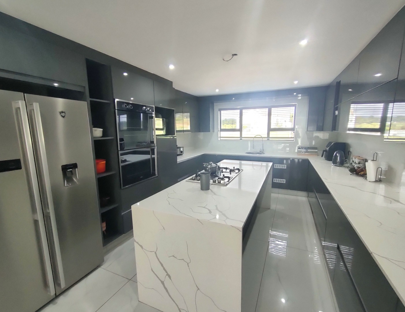 The home features a spacious open-plan living area comprising lounge, dining room, and a stylish modern kitchen. The kitchen is beautifully appointed with Caesarstone countertops, a centre island, double eye-level oven, and gas hob. Entertain effortlessly on the covered veranda with a built-in braai.
