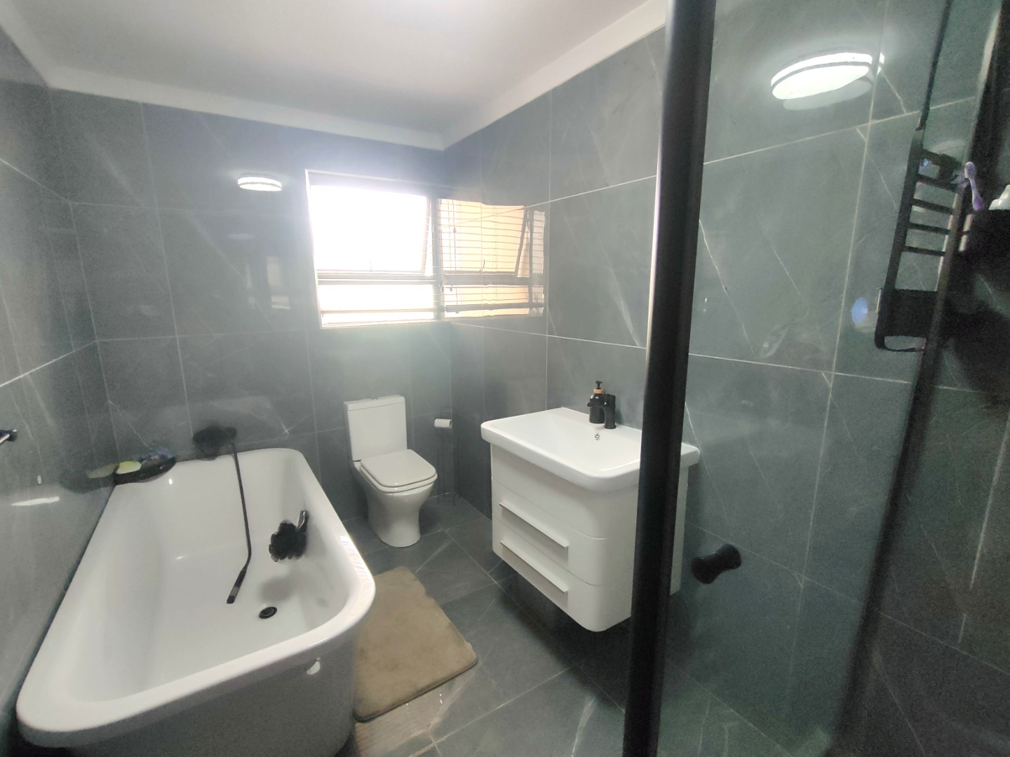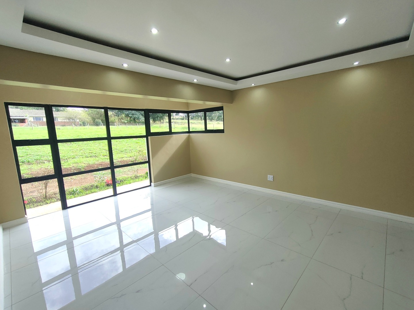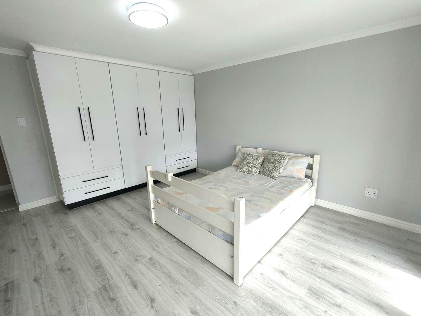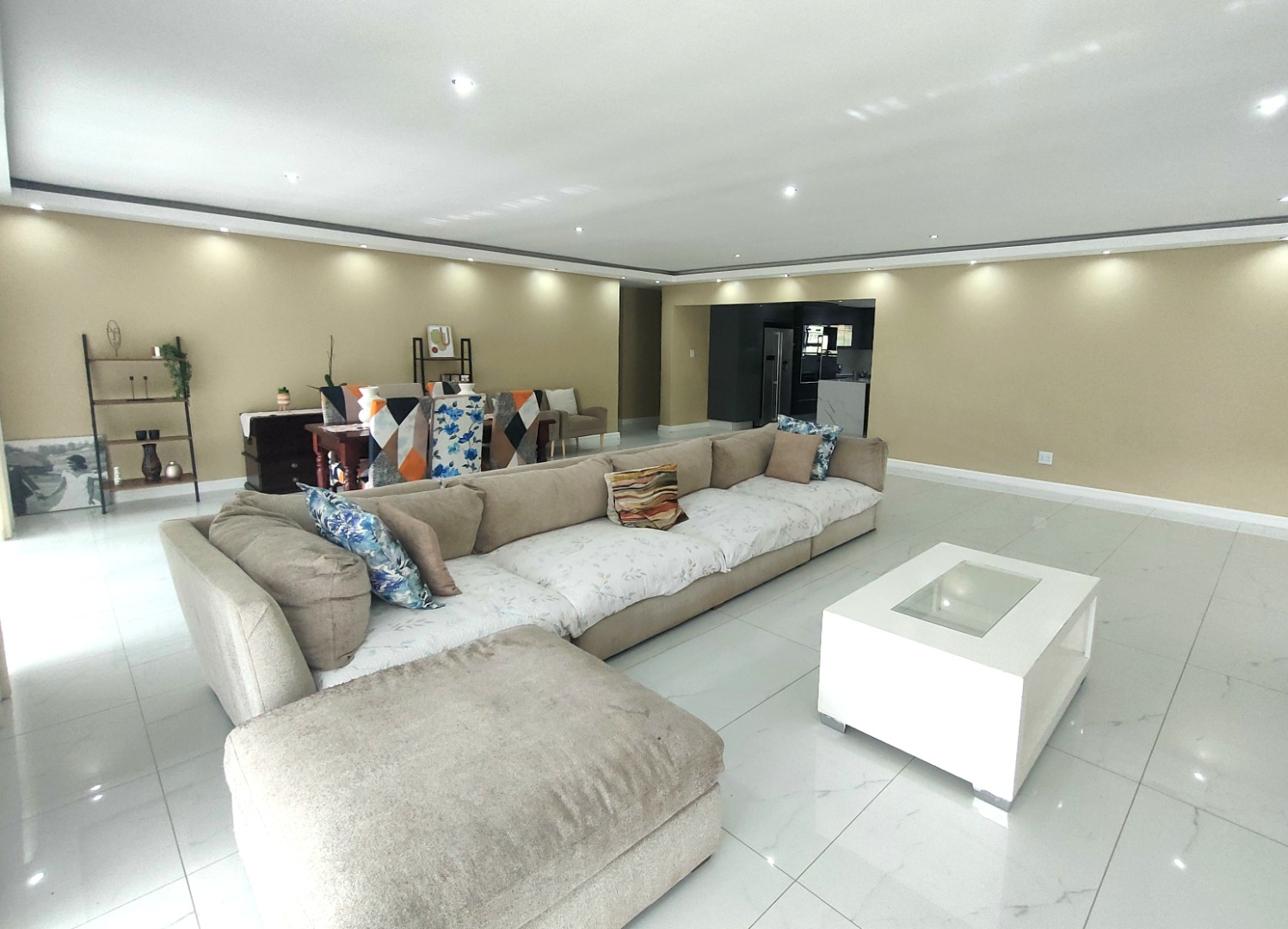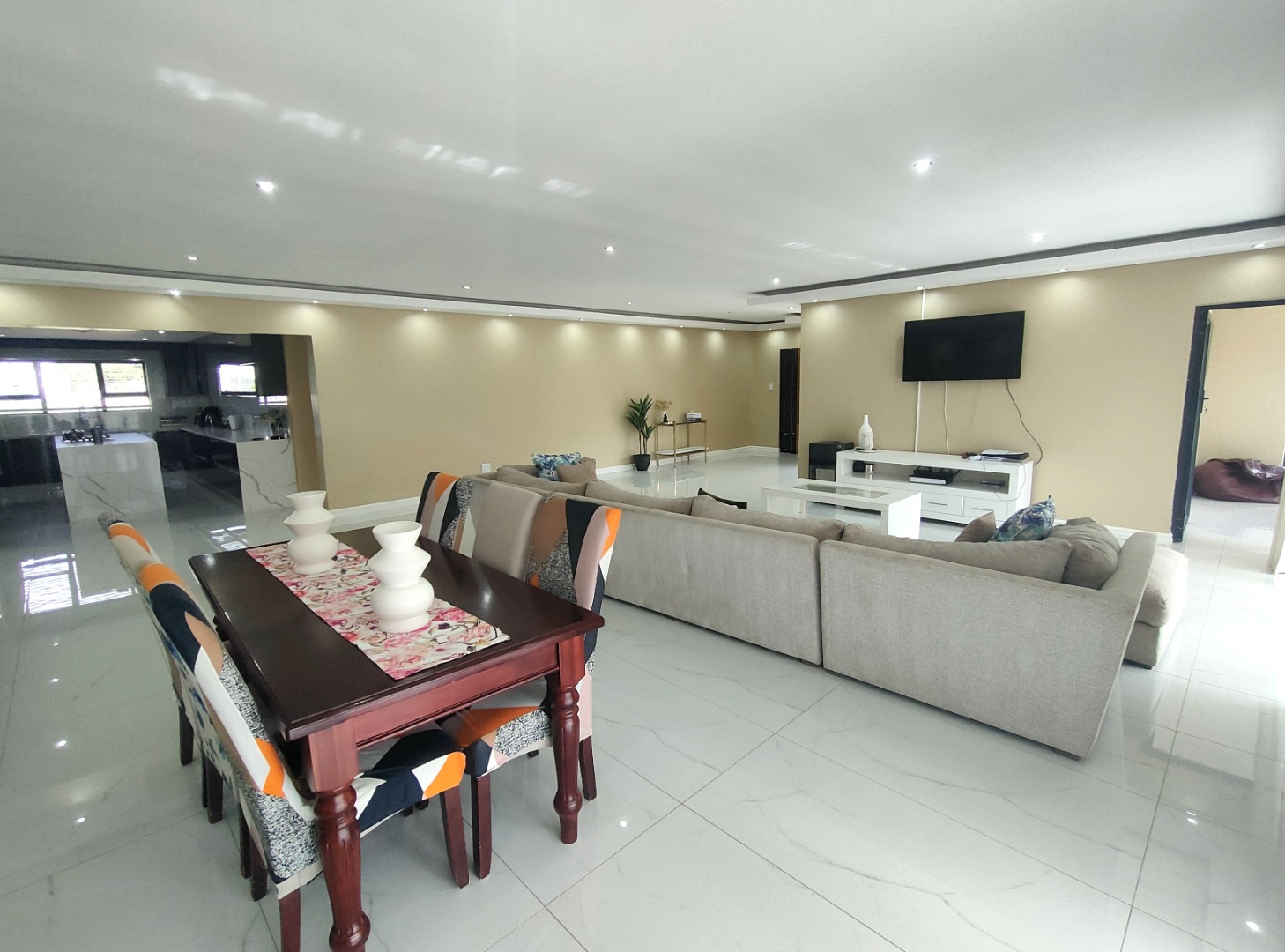 The home features a spacious open-plan living area comprising lounge, dining room, and a stylish modern kitchen. The kitchen is beautifully appointed with Caesarstone countertops, a centre island, double eye-level oven, and gas hob. Entertain effortlessly on the covered veranda with a built-in braai.