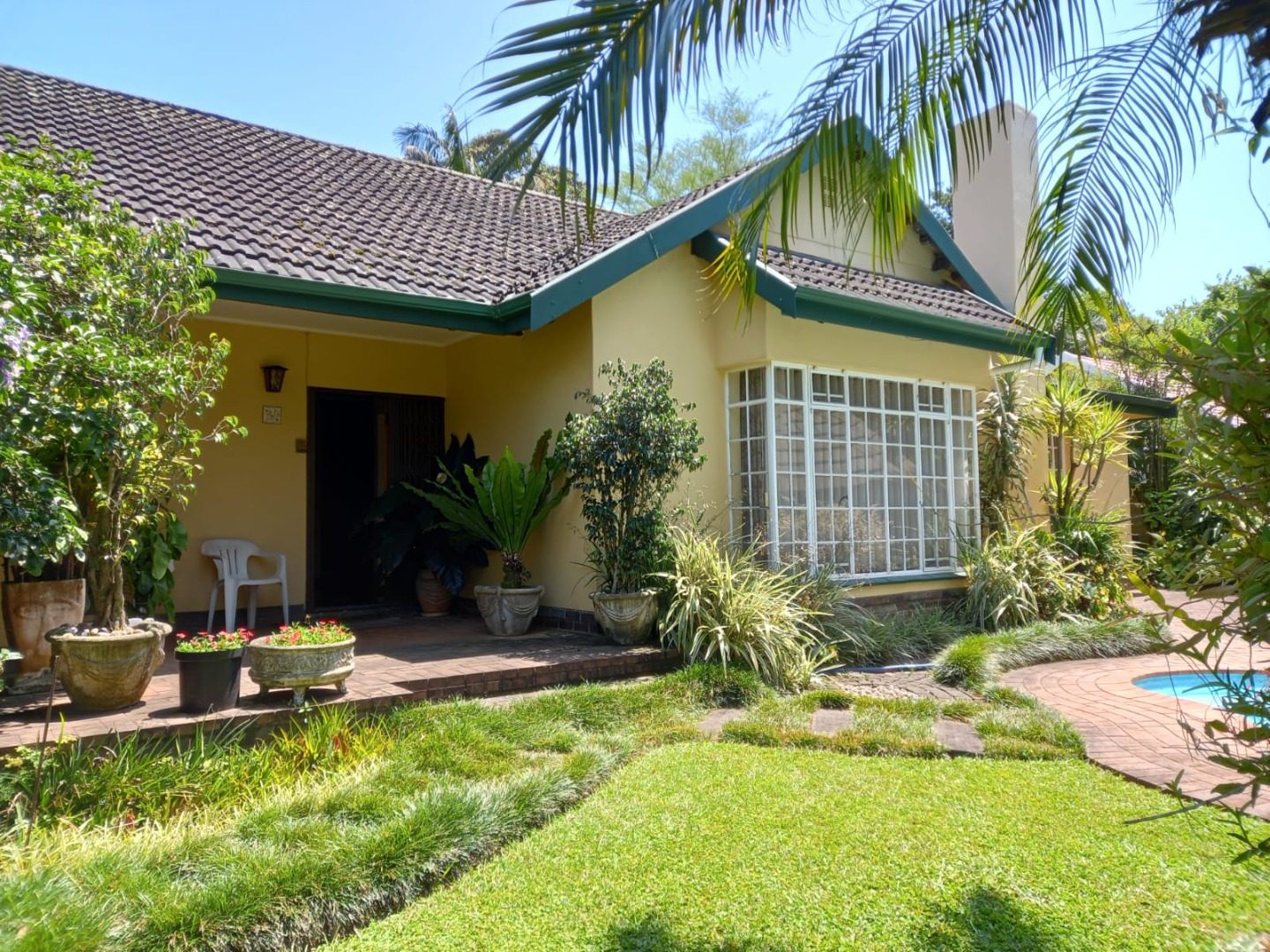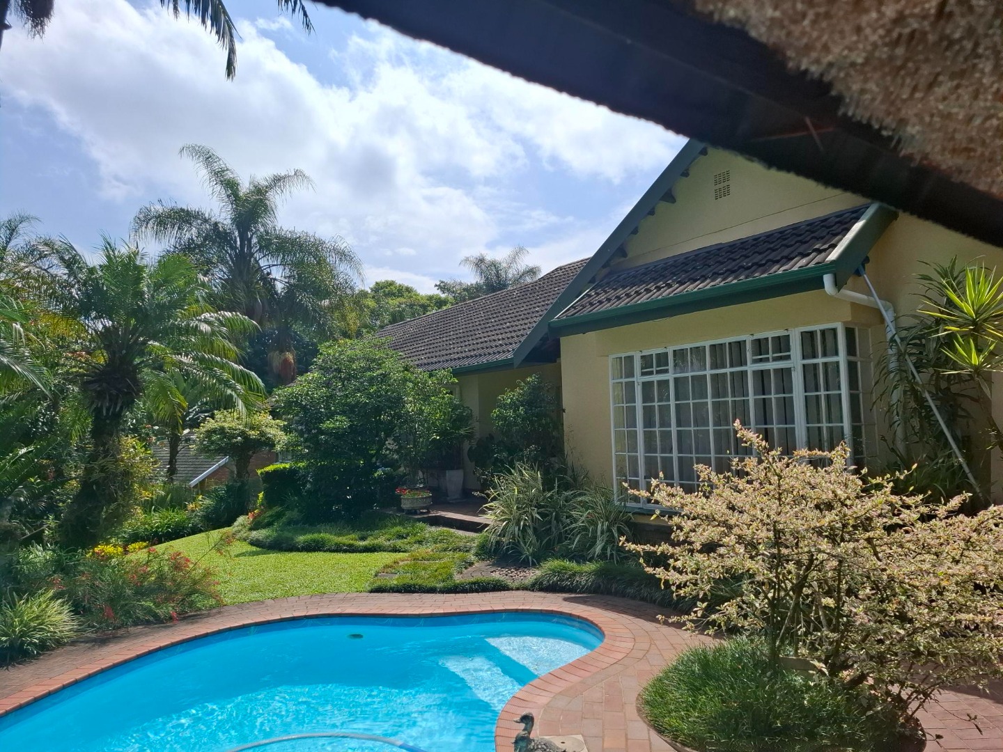Outside, the property truly shines with a sparkling swimming pool, a thatch lapa, and an entertainment area, all set within a beautifully contoured and well-maintained garden. Parking is more than ample, with a double garage, double carport, and an additional single carport. Staff accommodation includes a separate room with a shower and toilet, adding further convenience.