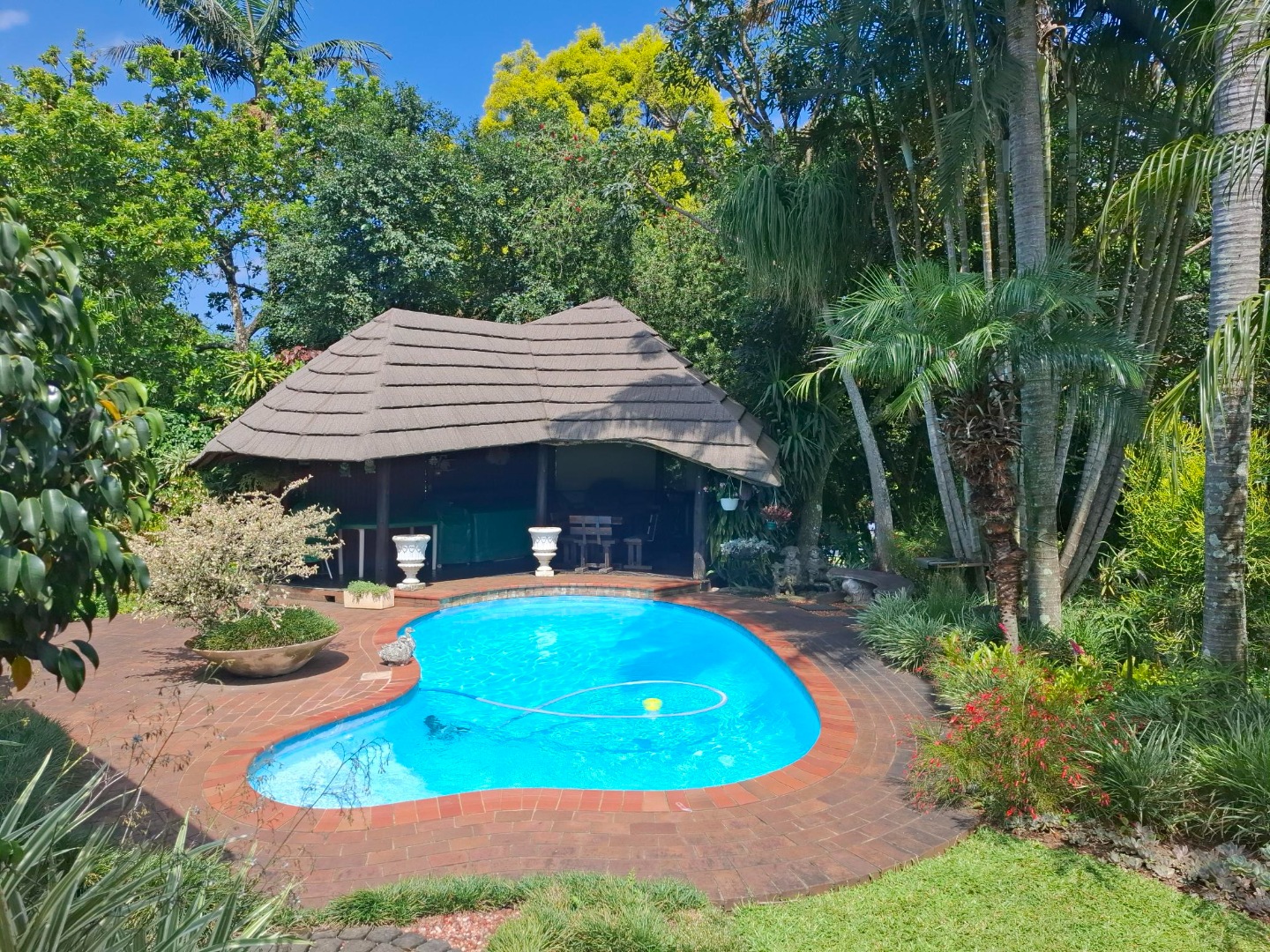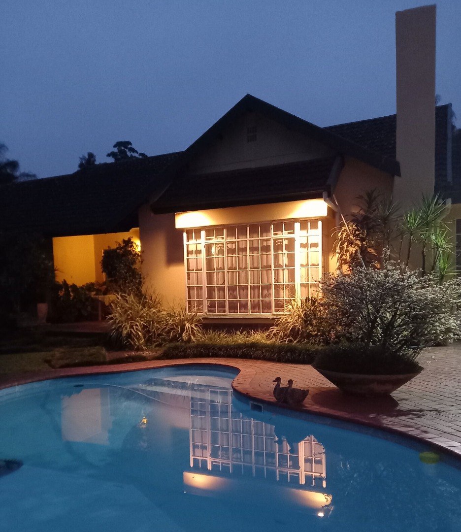 Outside, the property truly shines with a sparkling swimming pool, a thatch lapa, and an entertainment area, all set within a beautifully contoured and well-maintained garden. Parking is more than ample, with a double garage, double carport, and an additional single carport. Staff accommodation includes a separate room with a shower and toilet, adding further convenience.