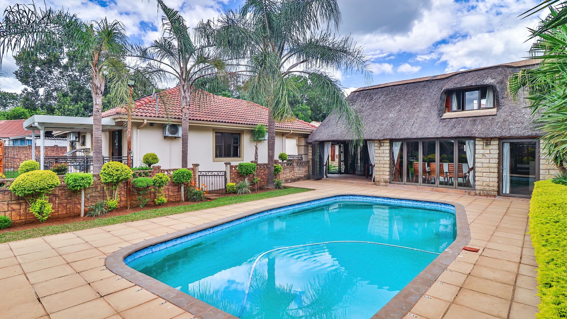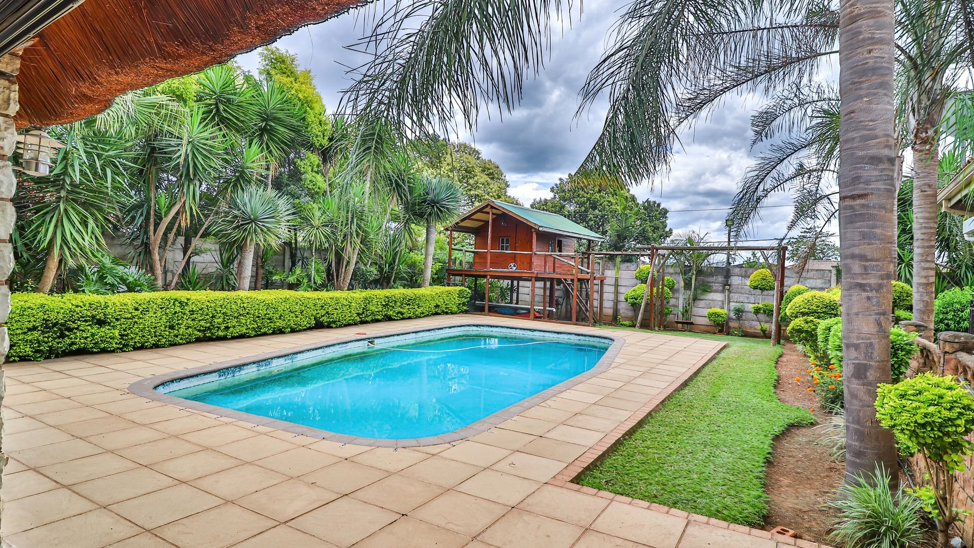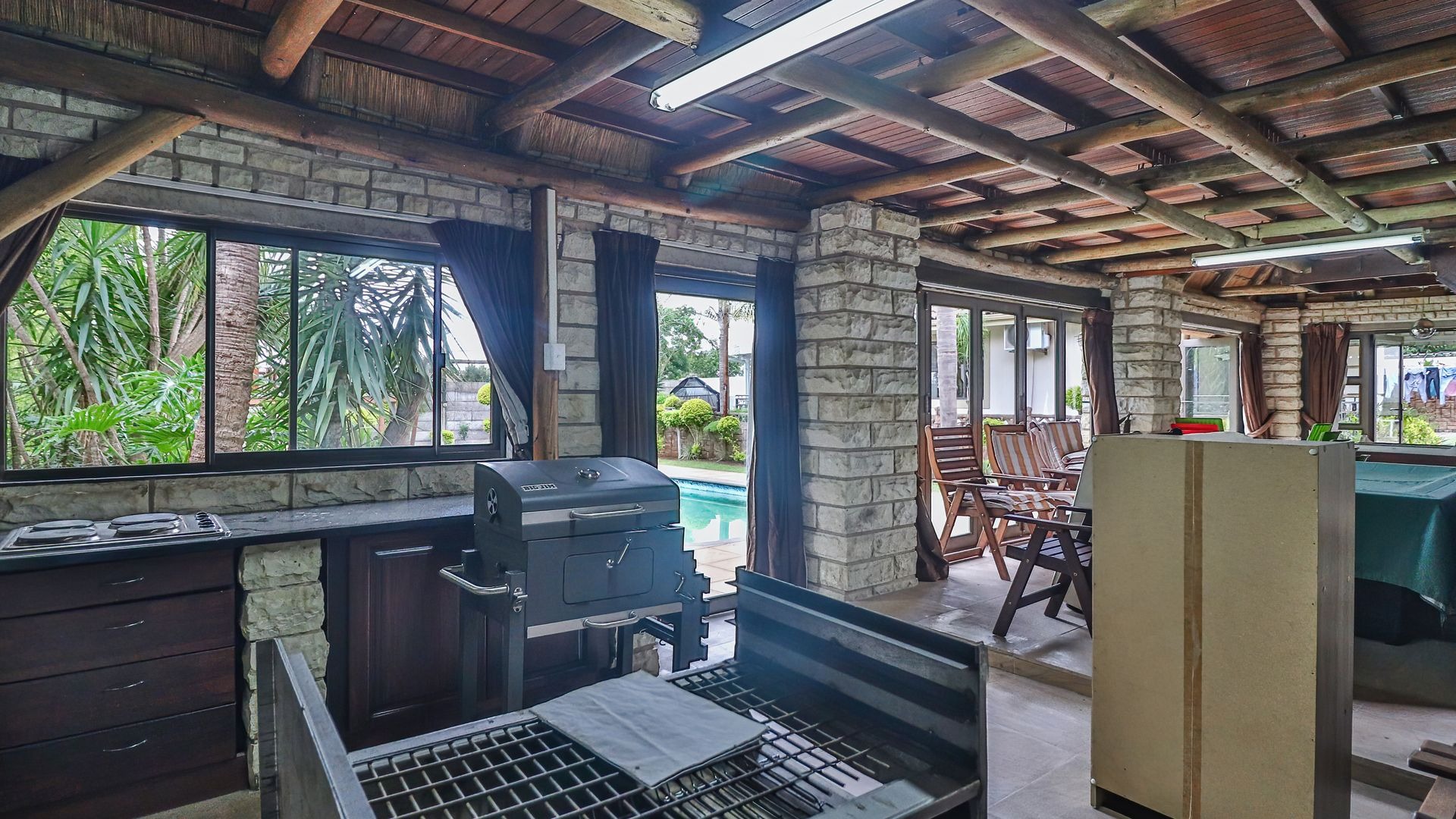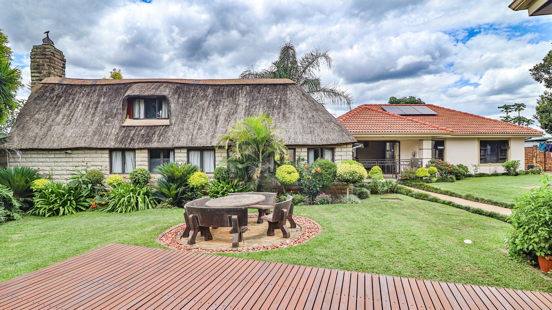 The property also features a charming thatched-roof entertainment lapa, complete with stairs leading up to a spacious loft - an ideal space for entertaining, relaxing, or even a creative retreat.