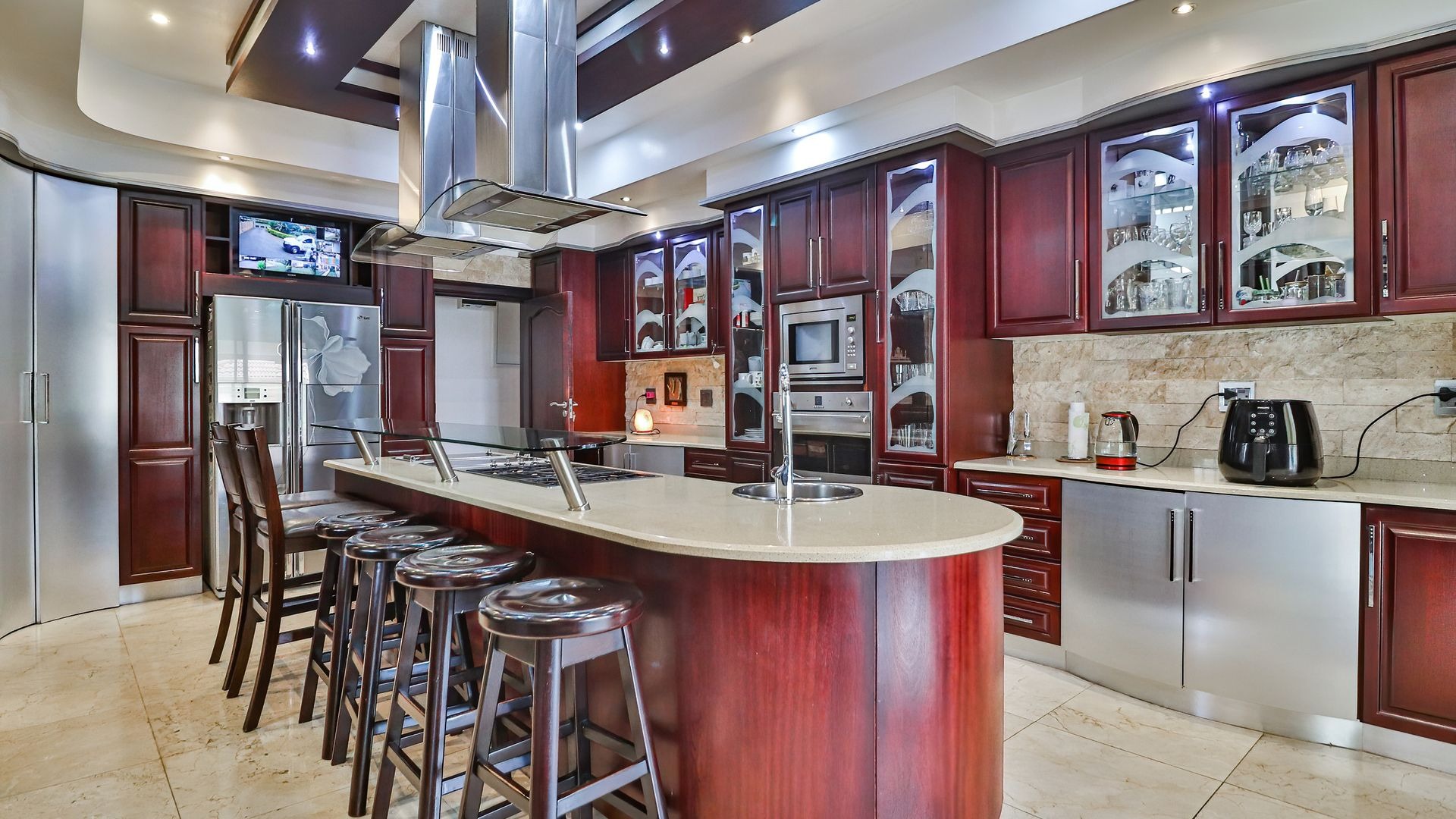 Outdoor living is a true highlight, with an expansive 2,235m2 erf offering a meticulously maintained garden and breathtaking panoramic views. Enjoy leisurely days by the inviting swimming pool, entertain guests on the spacious wooden deck, or relax on the modern covered patio, complete with glass railings and large sliding doors that create an effortless indoor-outdoor flow.
