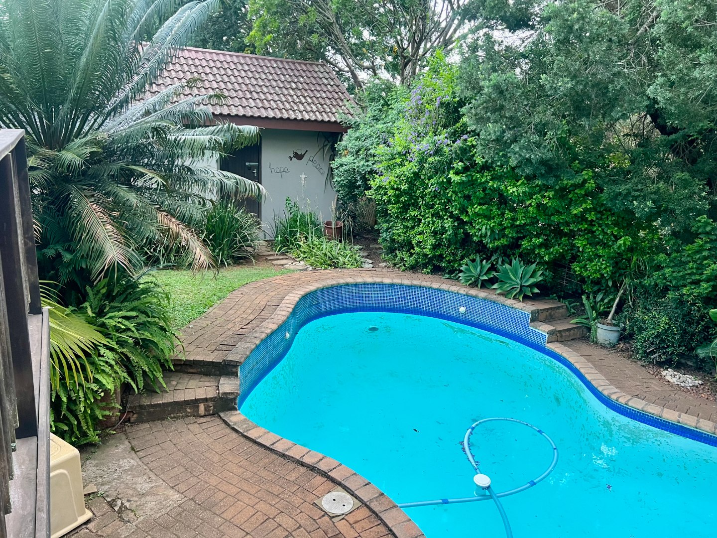 Step outside to a welcoming courtyard and a wooden deck overlooking a refreshing swimming pool, surrounded by a pleasant garden – perfect for relaxing or entertaining family and friends.