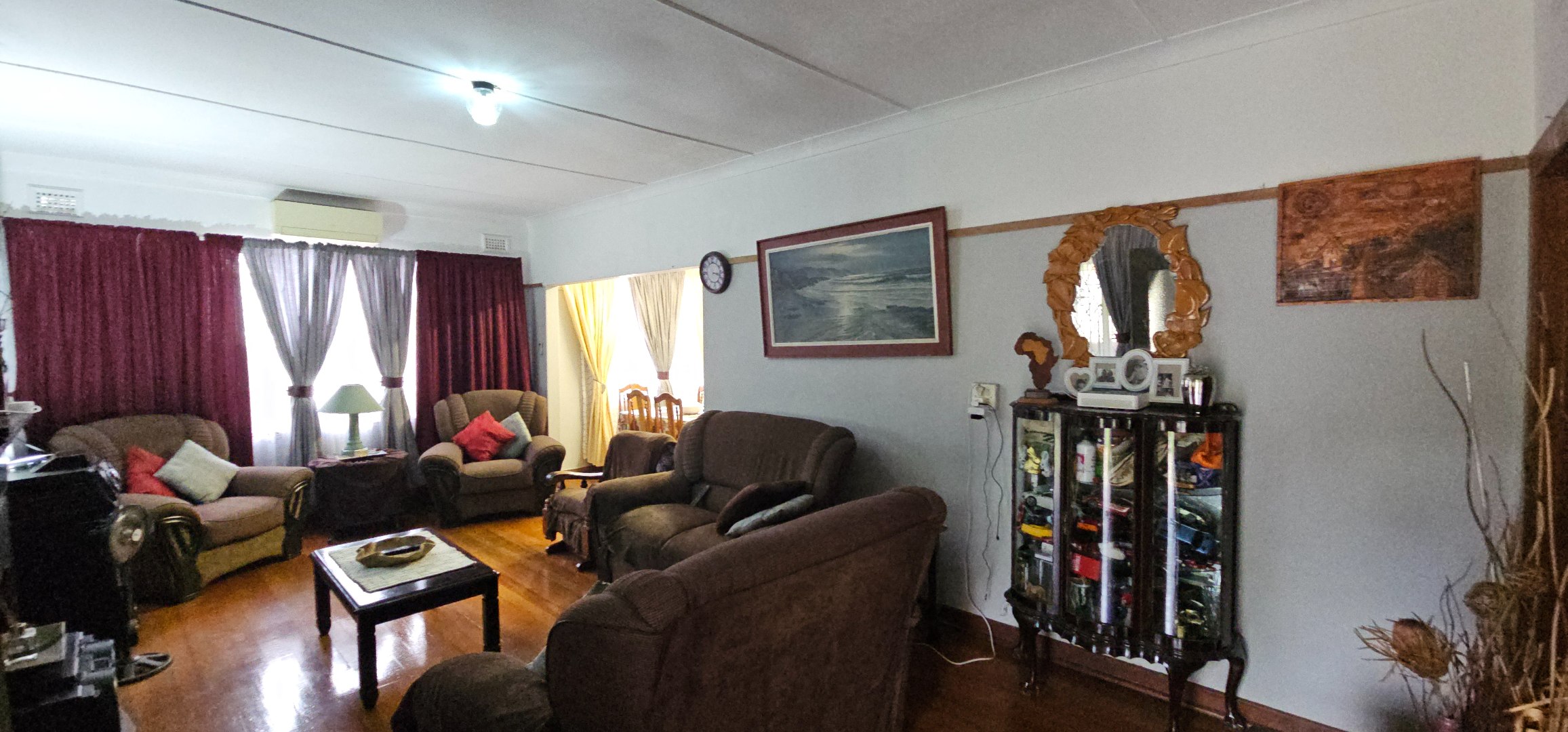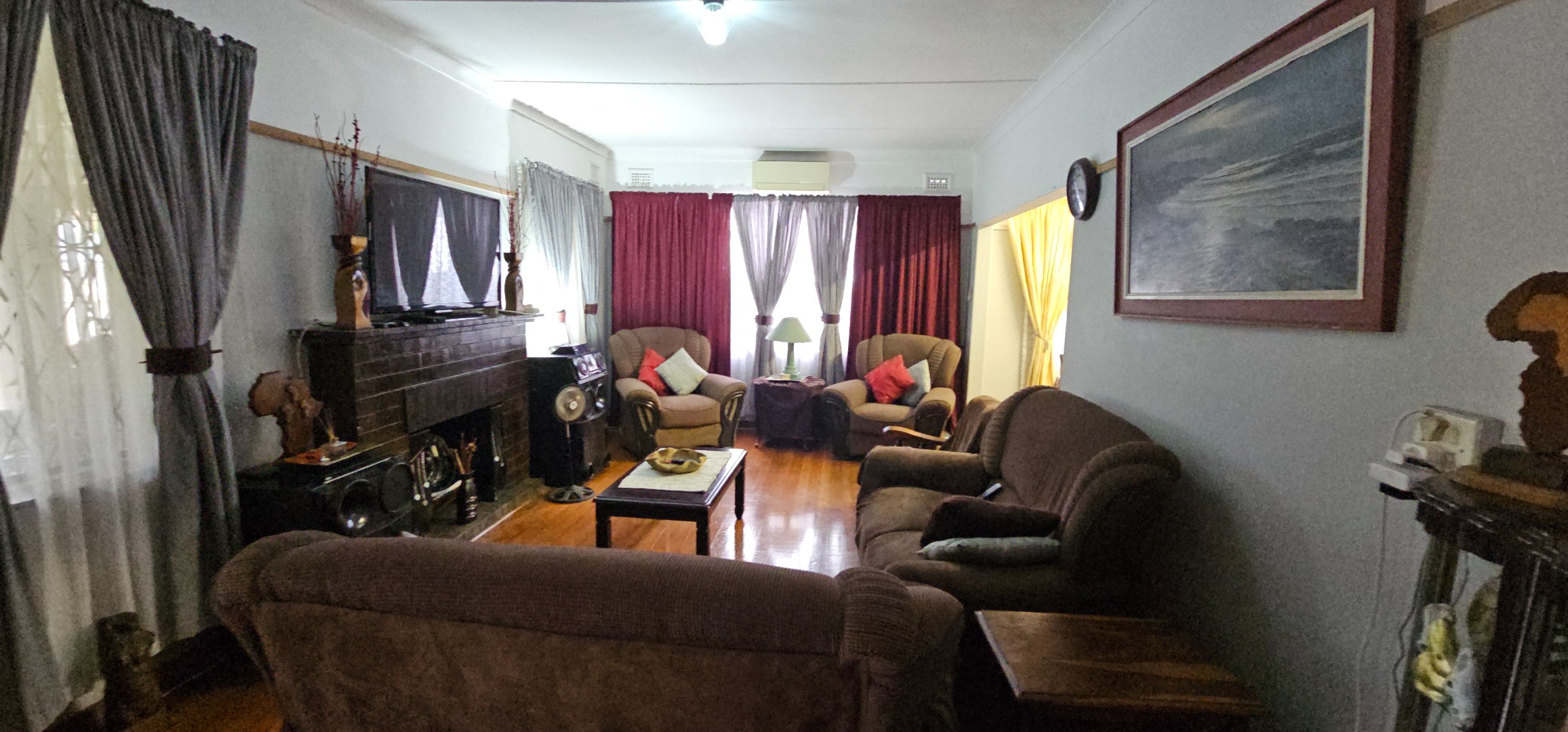 The interior features warm hardwood flooring throughout the main living areas, including a spacious lounge equipped with an air conditioning unit and a traditional fireplace, creating a cozy ambiance. The dining room, also with hardwood floors, flows seamlessly into the functional kitchen. The kitchen is fitted with grey cabinetry, dark countertops, and a gas range, offering practical cooking solutions. A separate laundry area with a sink and space for appliances adds to the home's convenience.