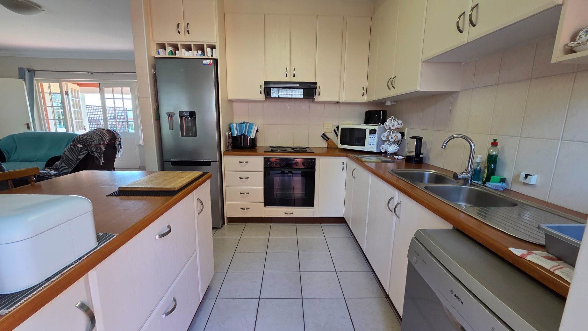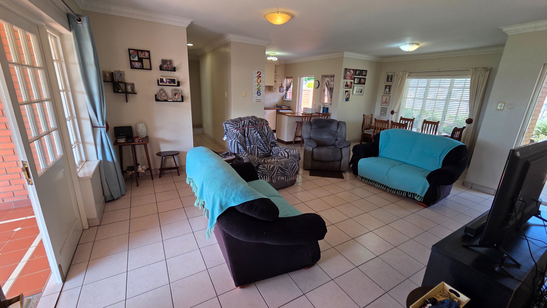 The open-plan living area seamlessly integrates the kitchen and lounge, flowing out onto a covered patio—ideal for relaxed entertaining. Positioned in an elevated spot within the estate, the home enjoys far-reaching views that add to its sense of space and tranquility.