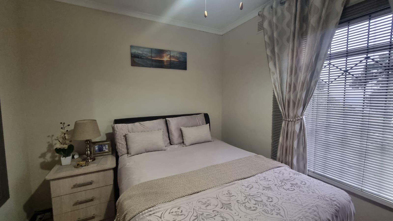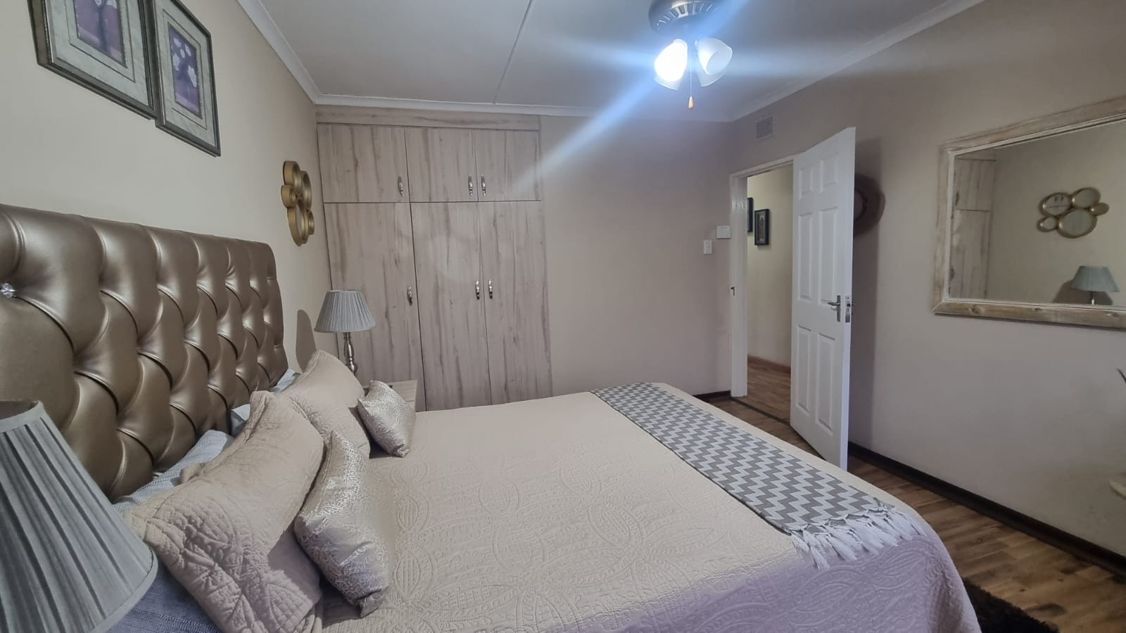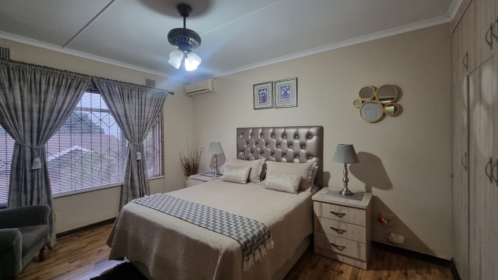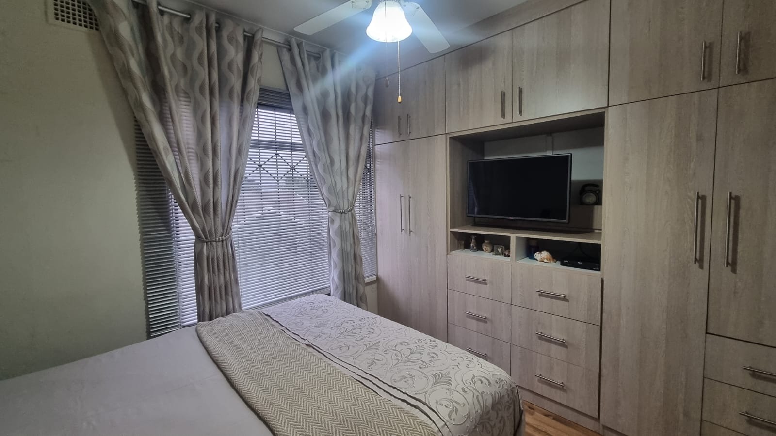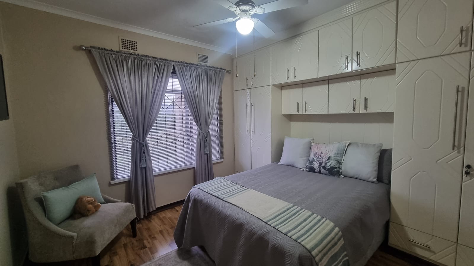 Featuring 3 bedrooms with laminate flooring, blinds, and built-in cupboards. Two bedrooms include ceiling fans, while the main bedroom is fitted with an air conditioner.