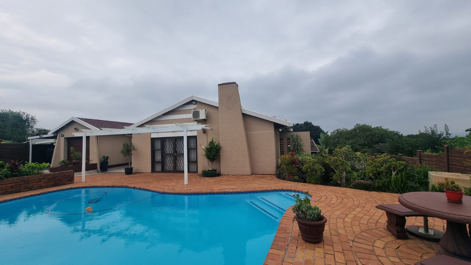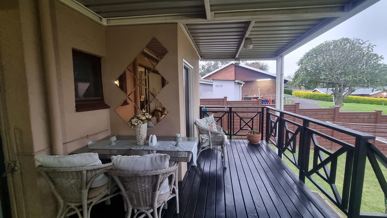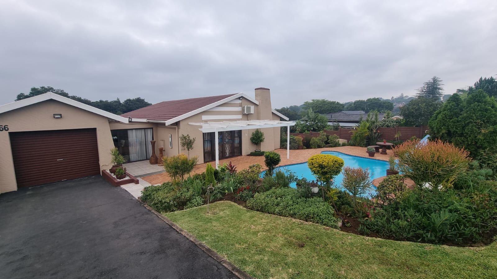 The entertainment area opens onto a wooden deck at the back of the home , while the pool has recently been redone. The garden is neat and easy to maintain.