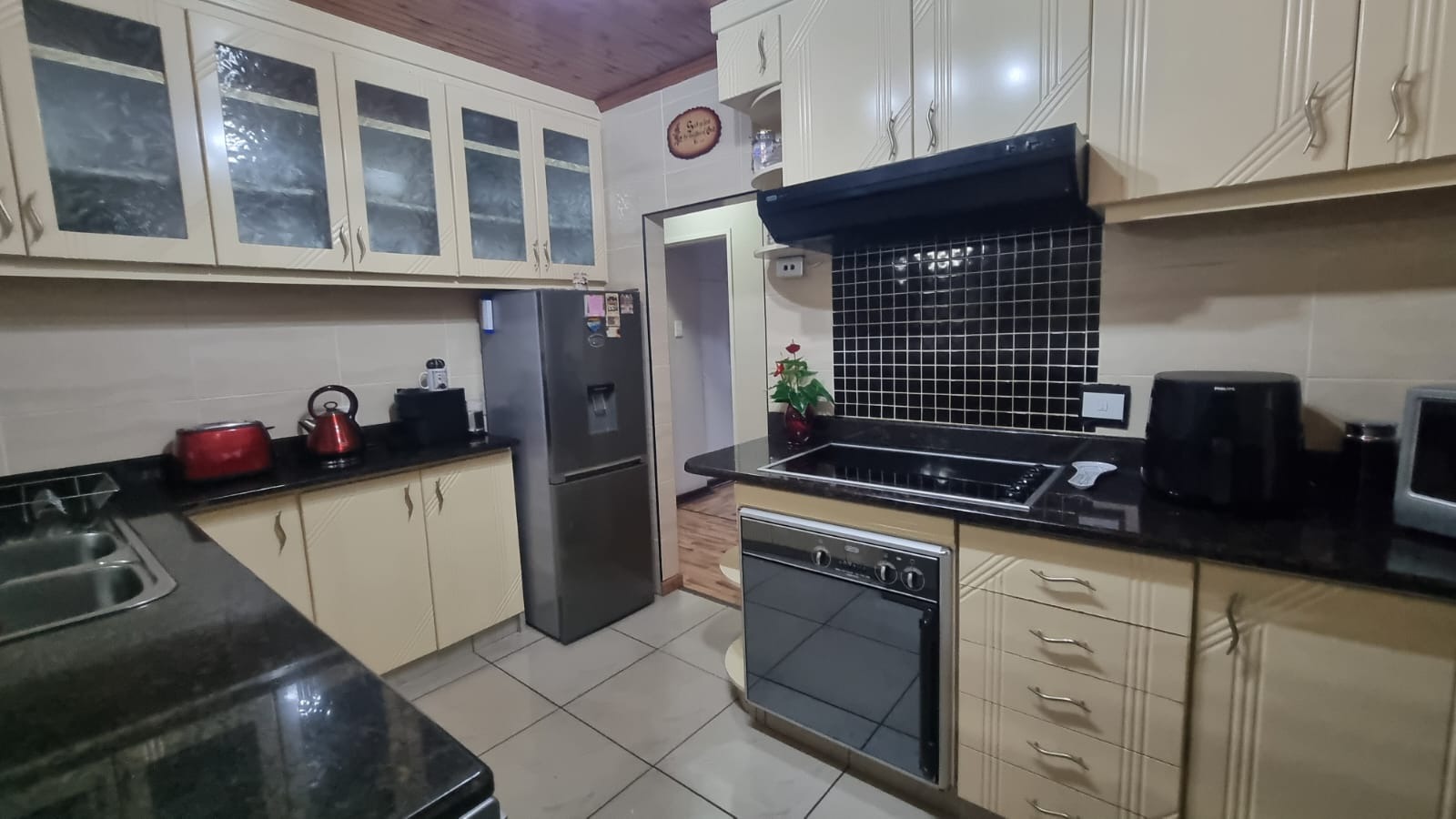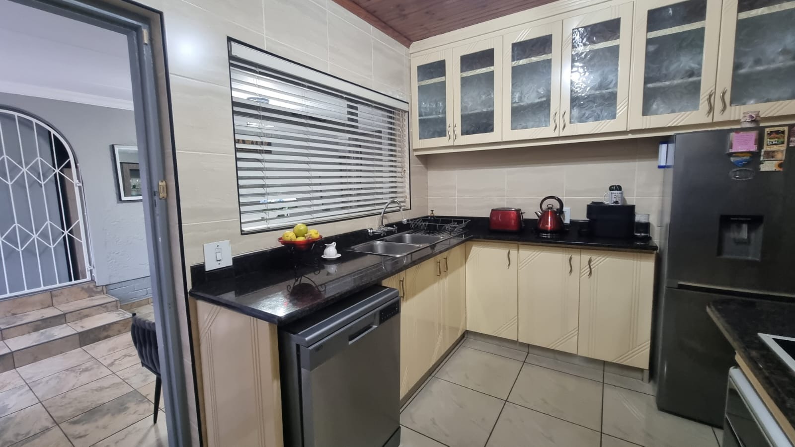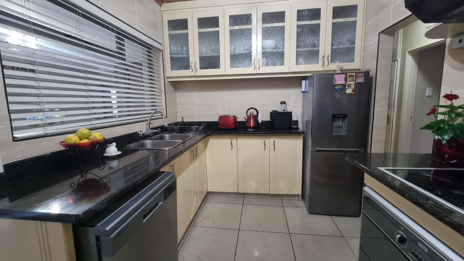 The modern kitchen is finished with quartz countertops, built-in cupboards, oven, hob, extractor fan, wall tiles, and blinds.
