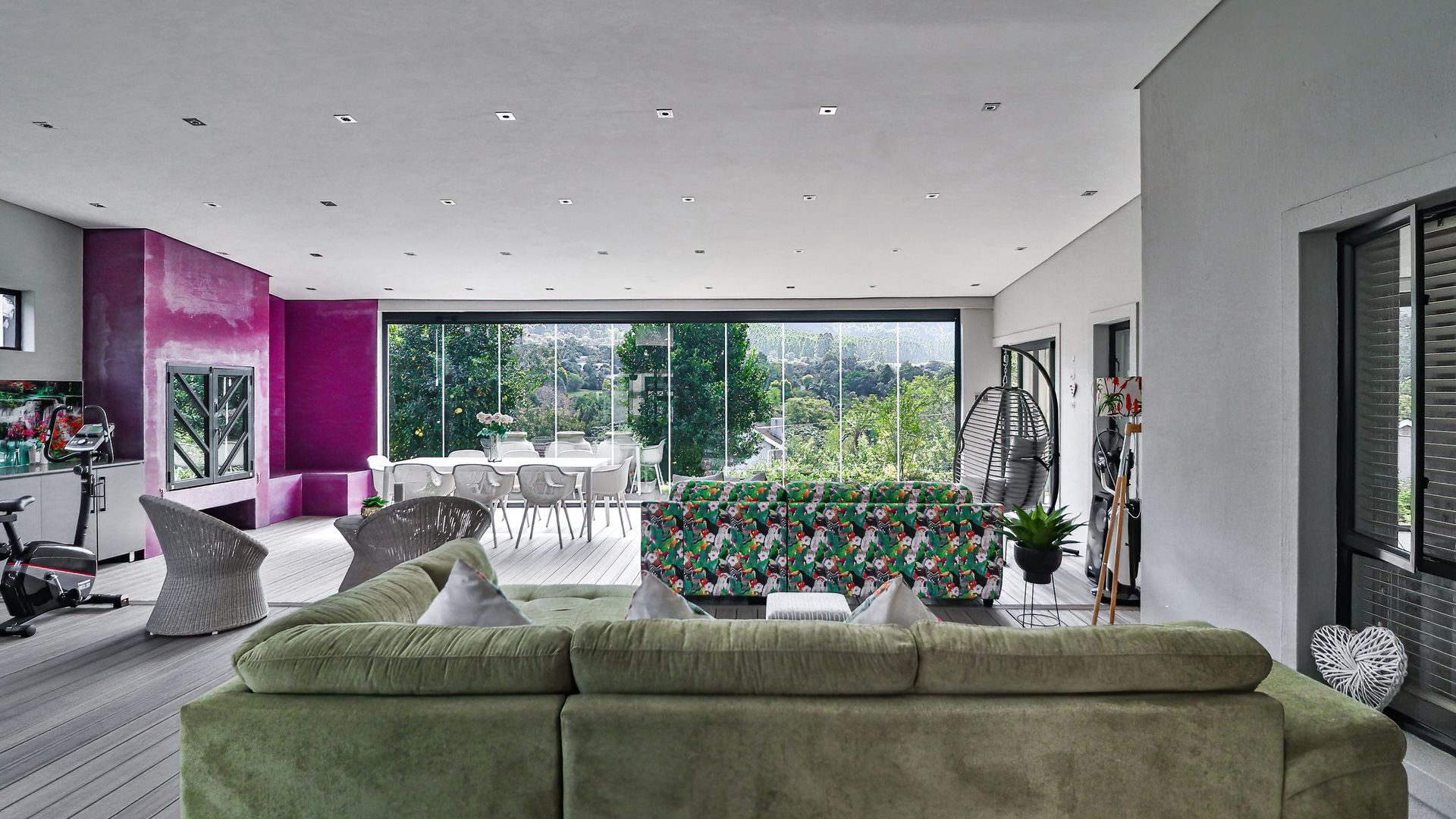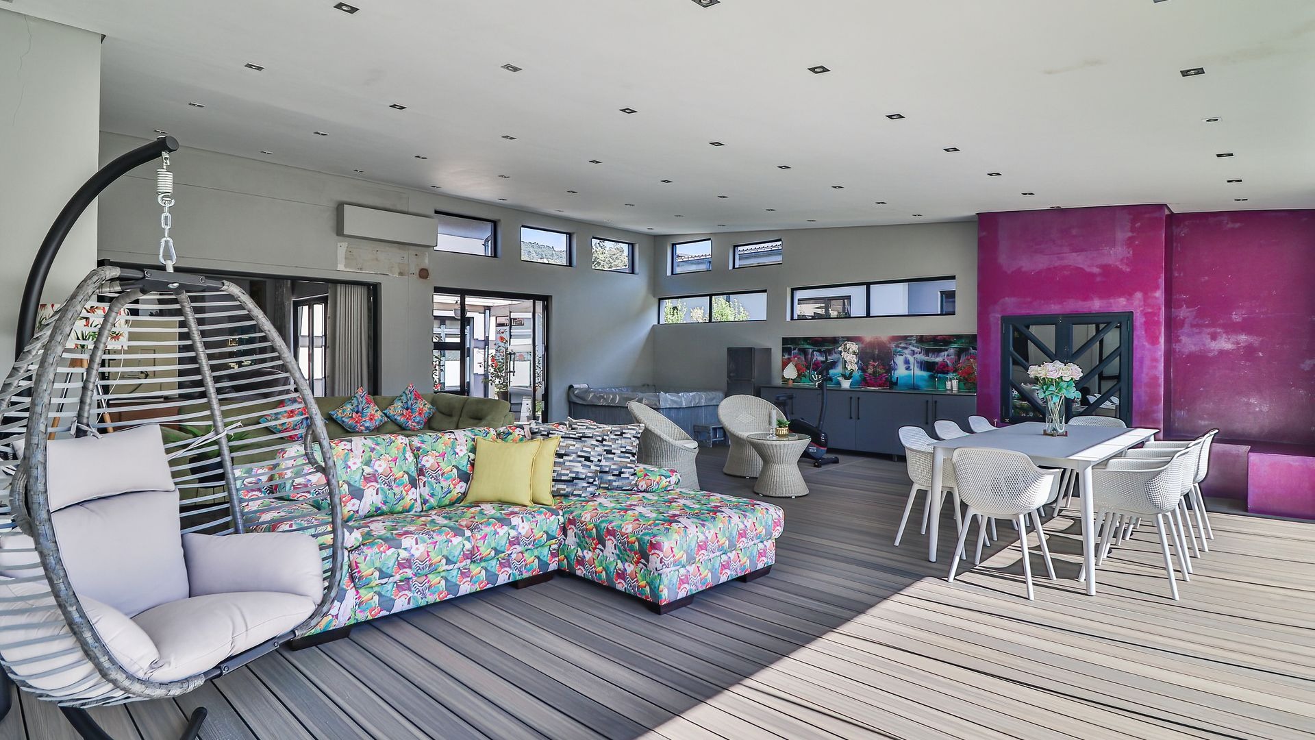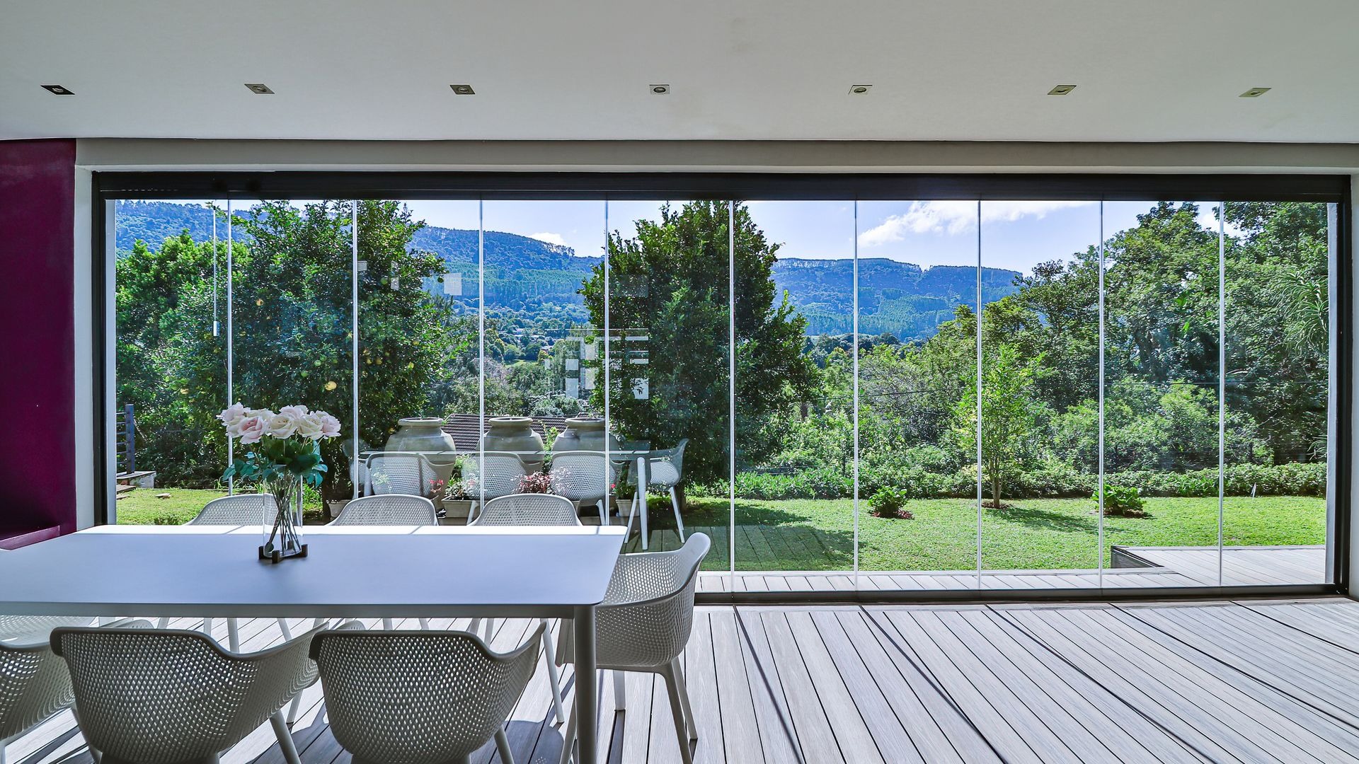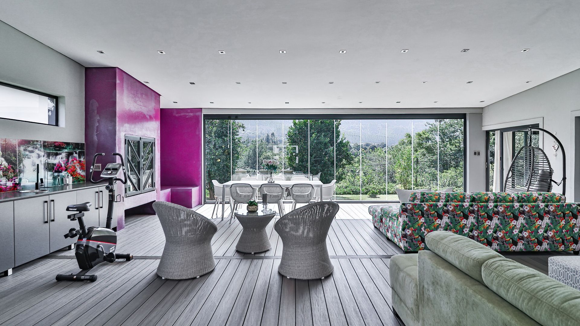 - Massive PVC decking entertainment area with frameless stackable doors.