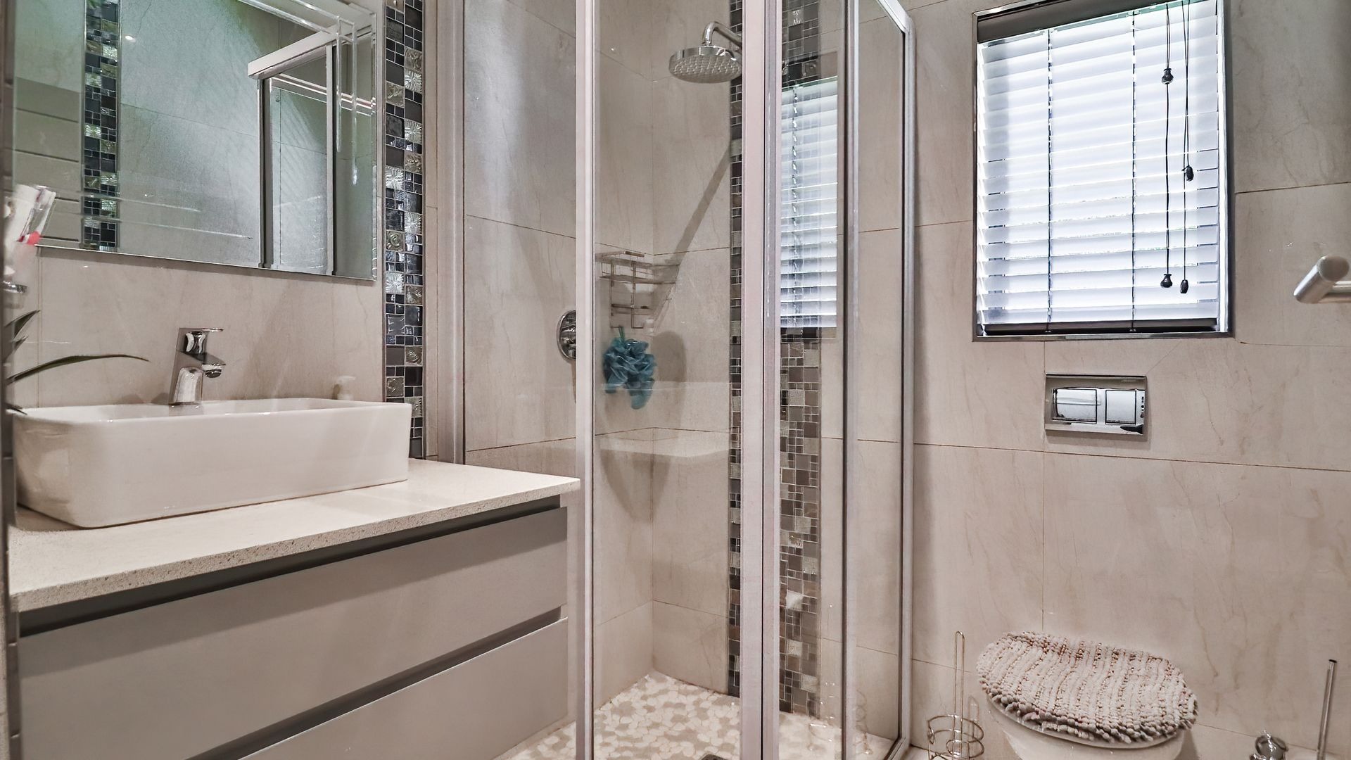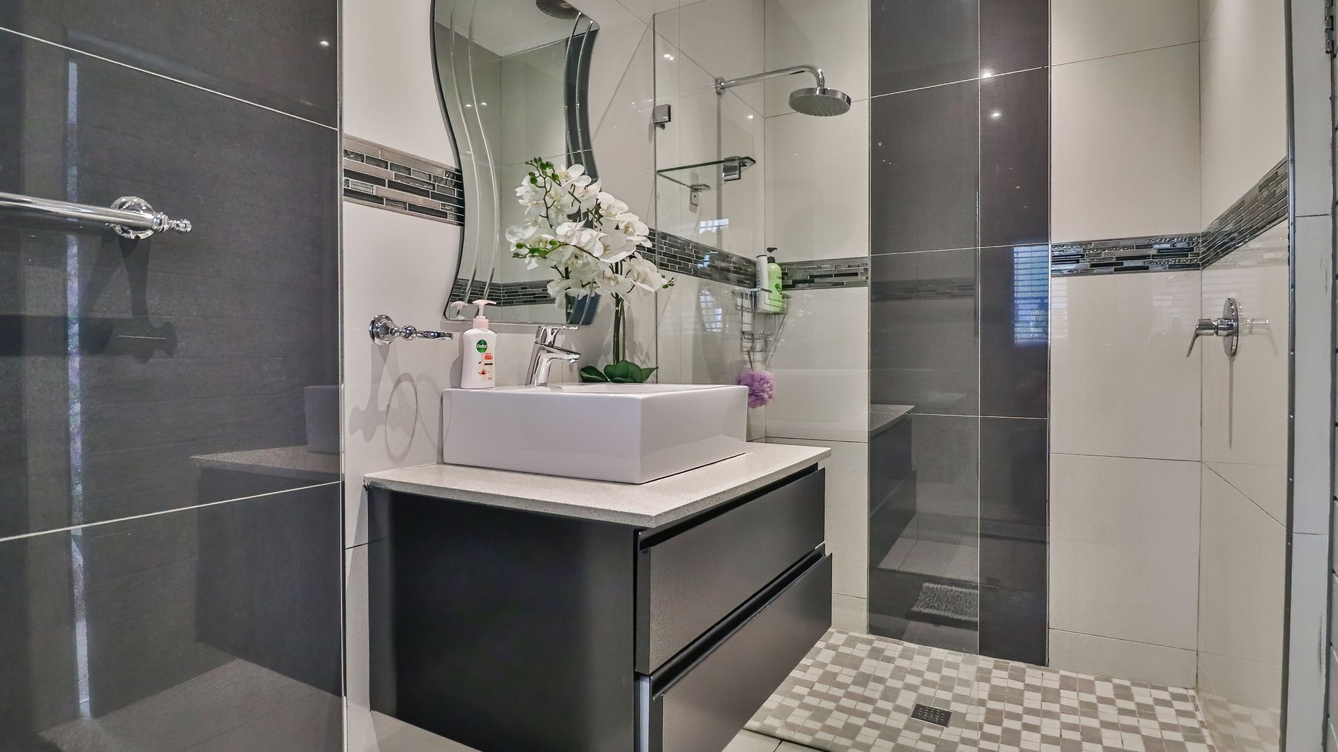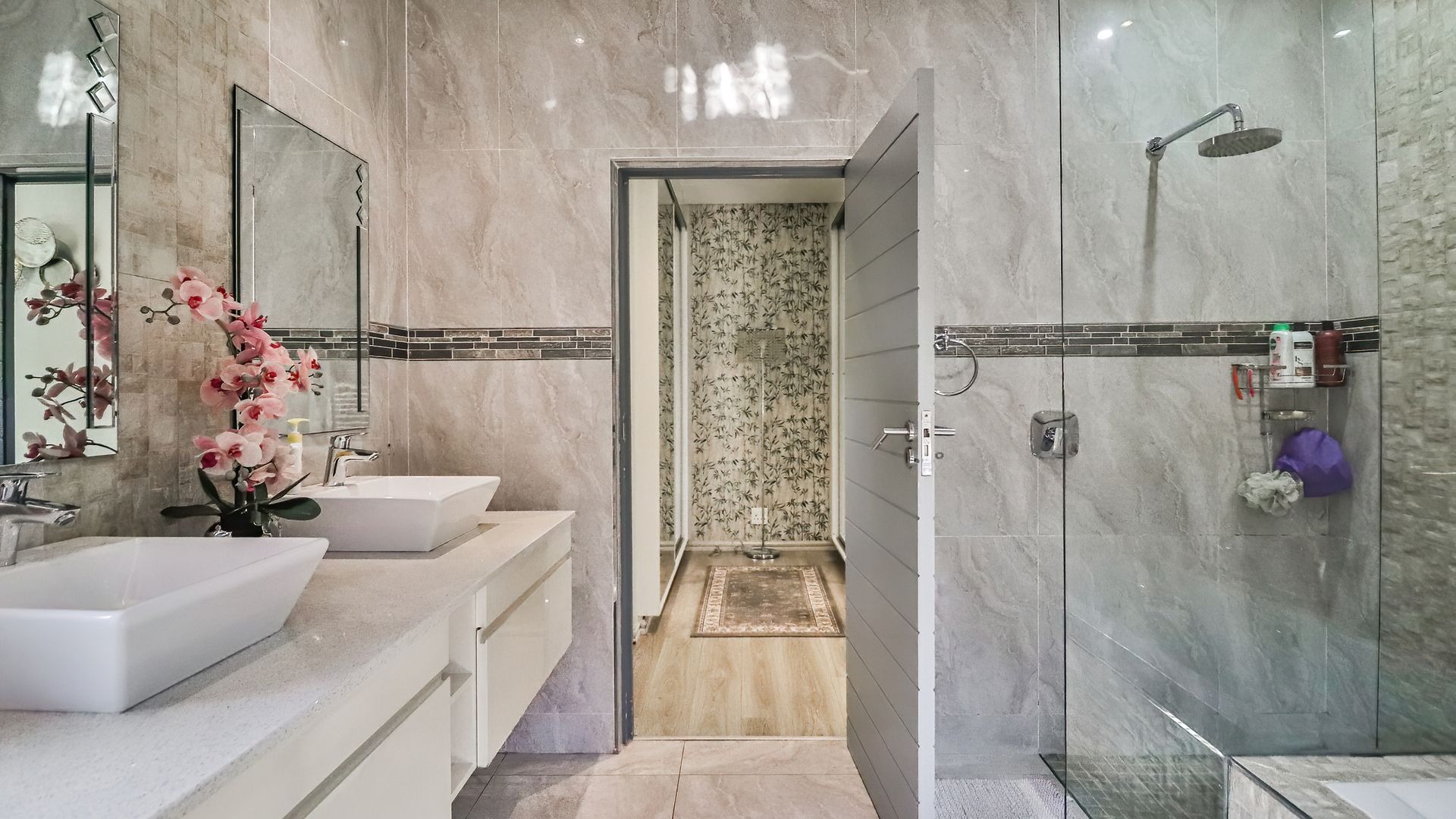 With 3 exquisite en-suite bedrooms, the main bedroom includes a balcony, walk-in closet, full bathroom, and access to the Entertainment room. Designer ceilings and marble tiles accentuate the elegance of this home, complemented by a study, Zen garden, and a large Entertainment room with frameless stackable doors opening to the garden.