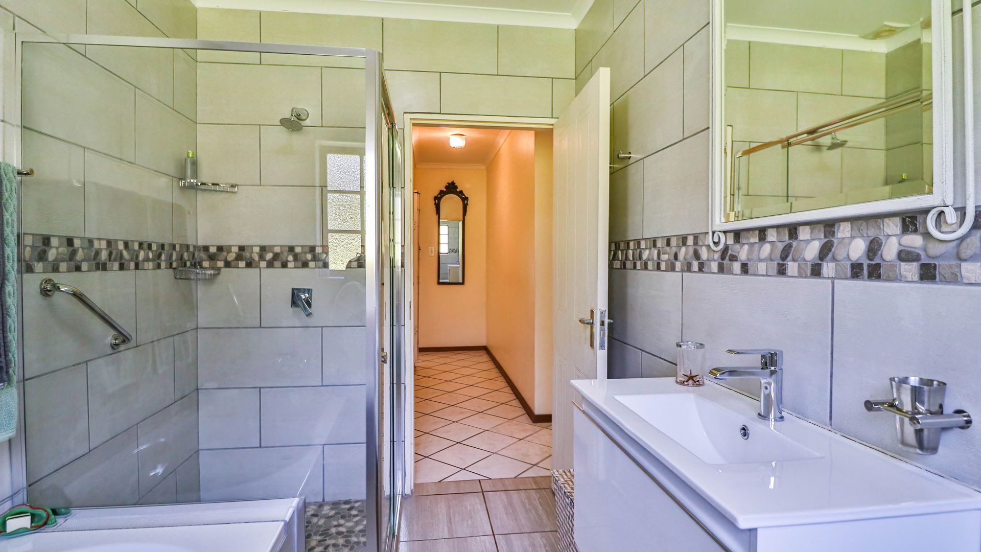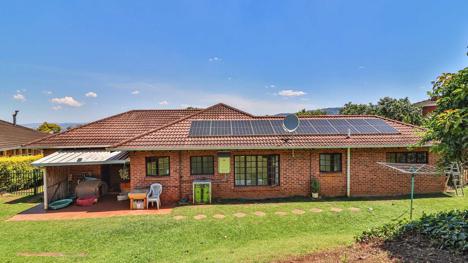 Practical features include a main geyser supported by a gas geyser, plus a 10-panel solar system with an inverter—keeping electricity costs impressively low.
