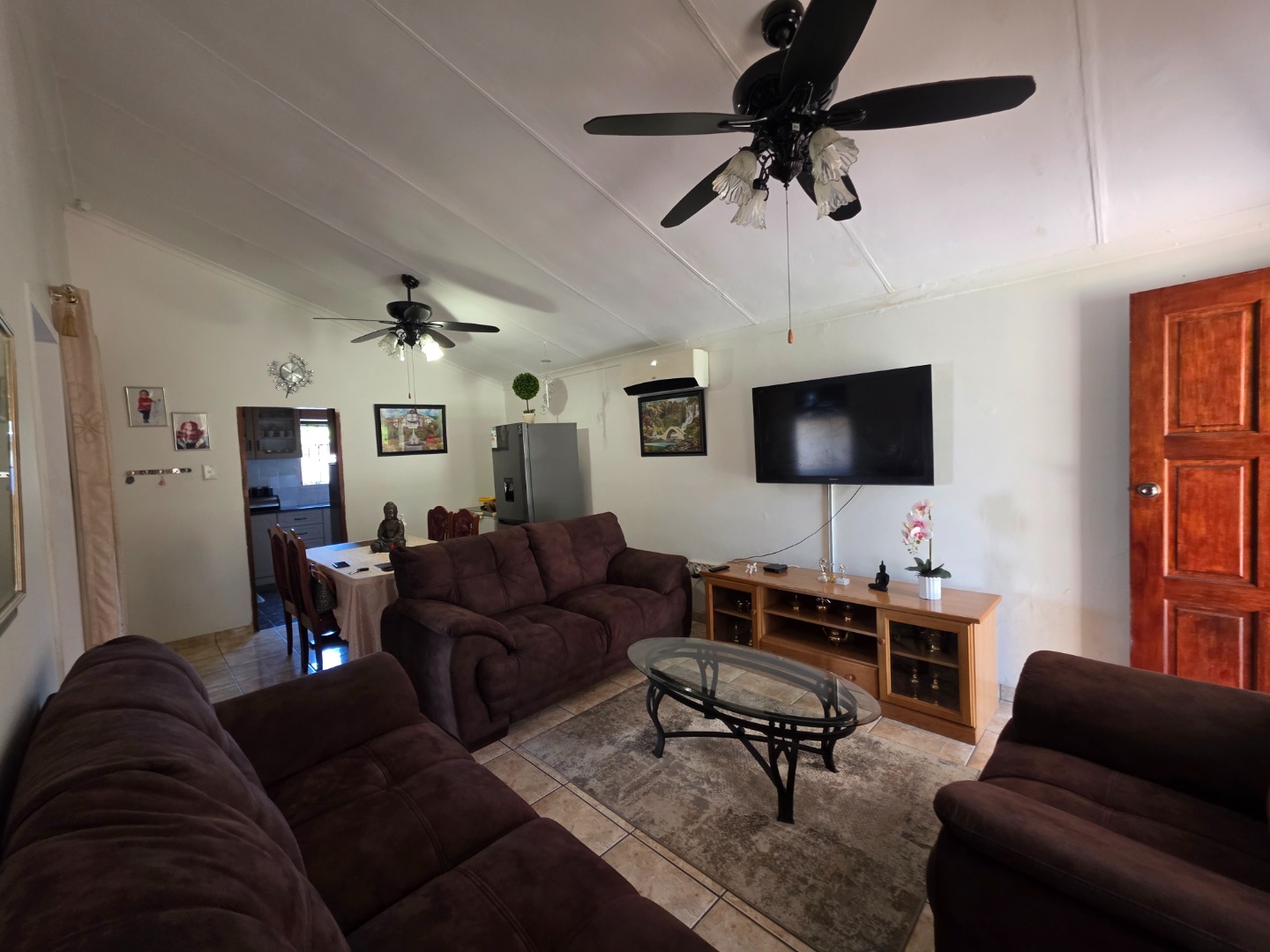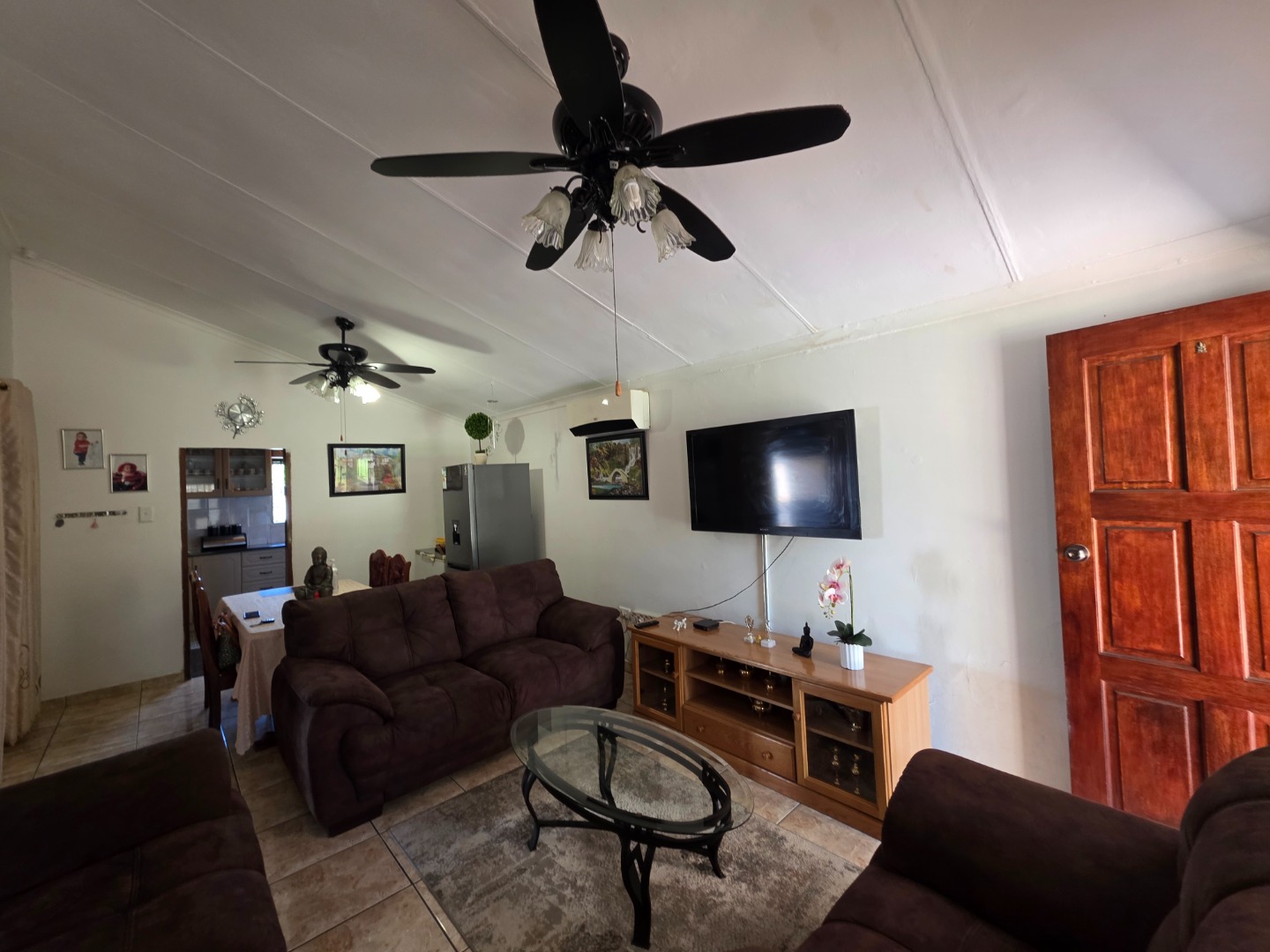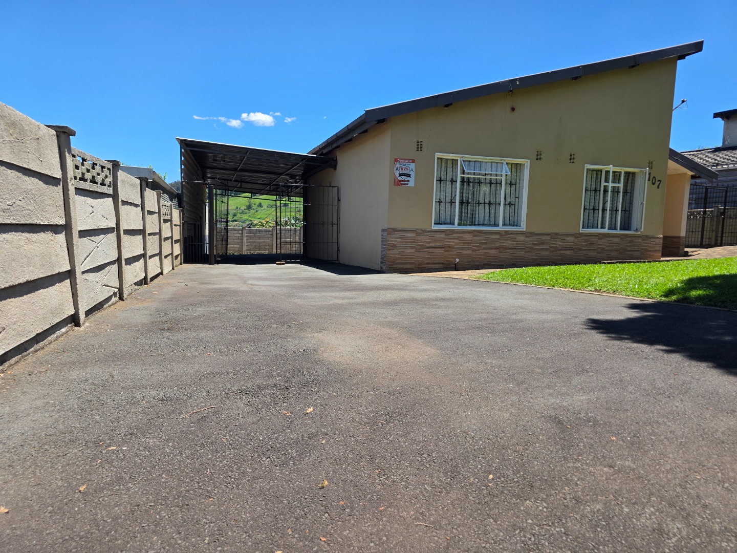 The open-plan Lounge and Dining area effortlessly flows into the fully-fitted Kitchen, complete with elegant granite countertops and space for appliances. A covered awning leads to the washline area, providing a seamless indoor-outdoor lifestyle.