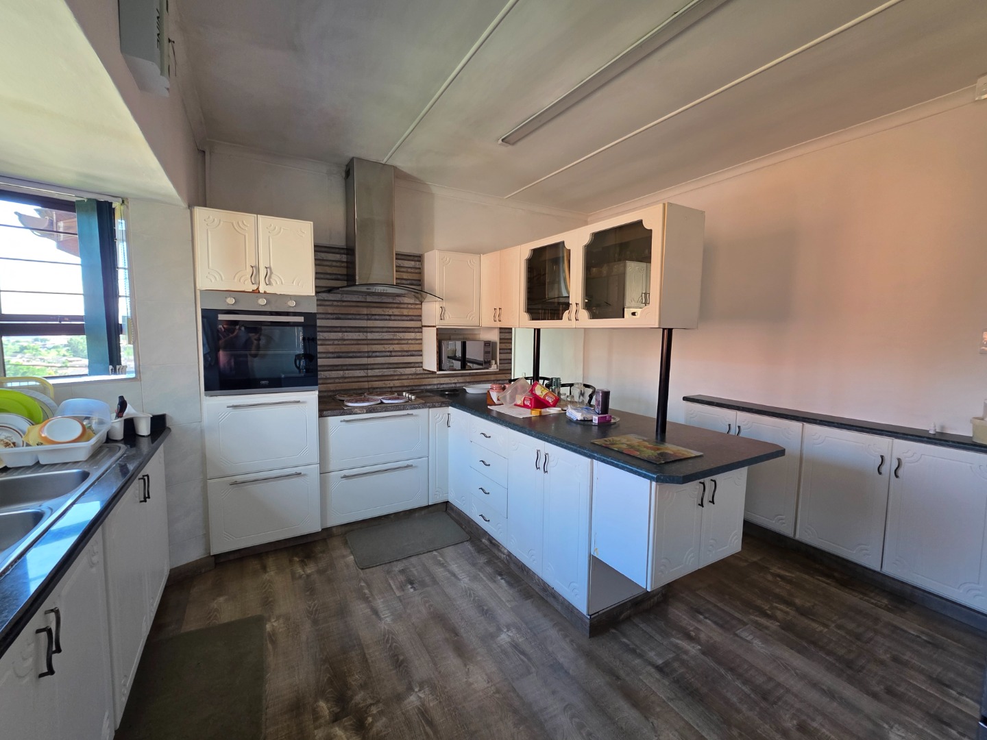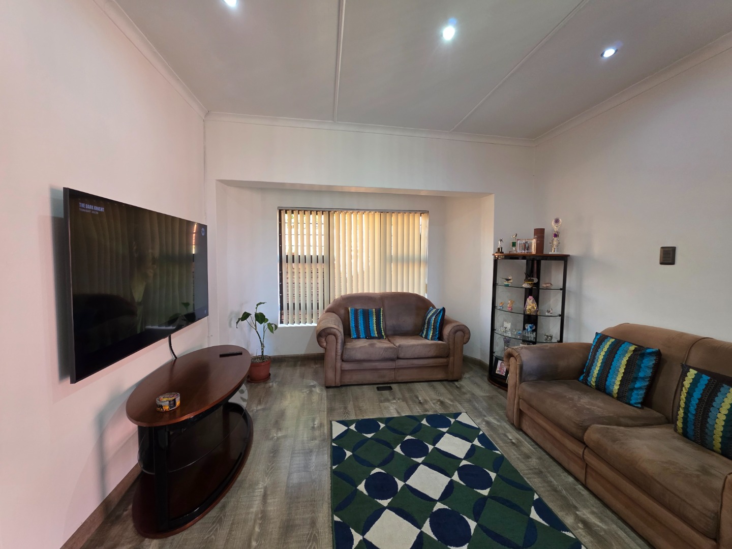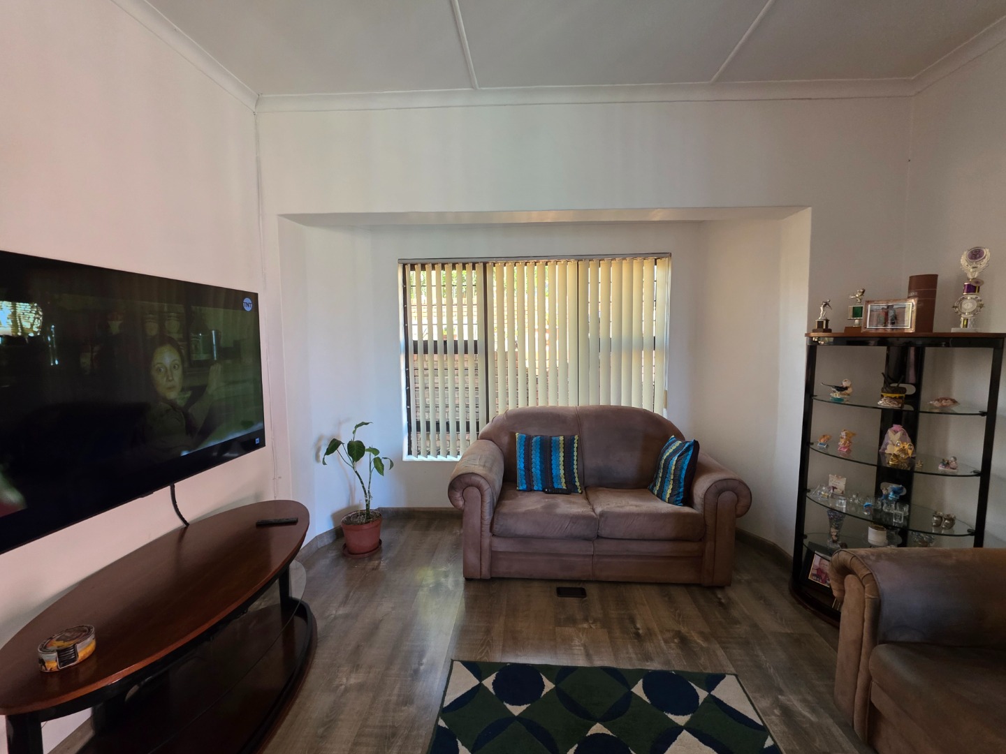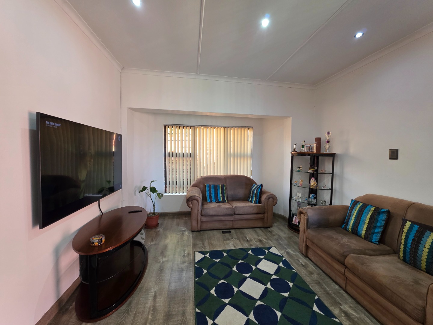 Inside, the tiled entrance opens to a modern laminate-floored living area with a cozy lounge leading to a covered patio and an open plan dining room.