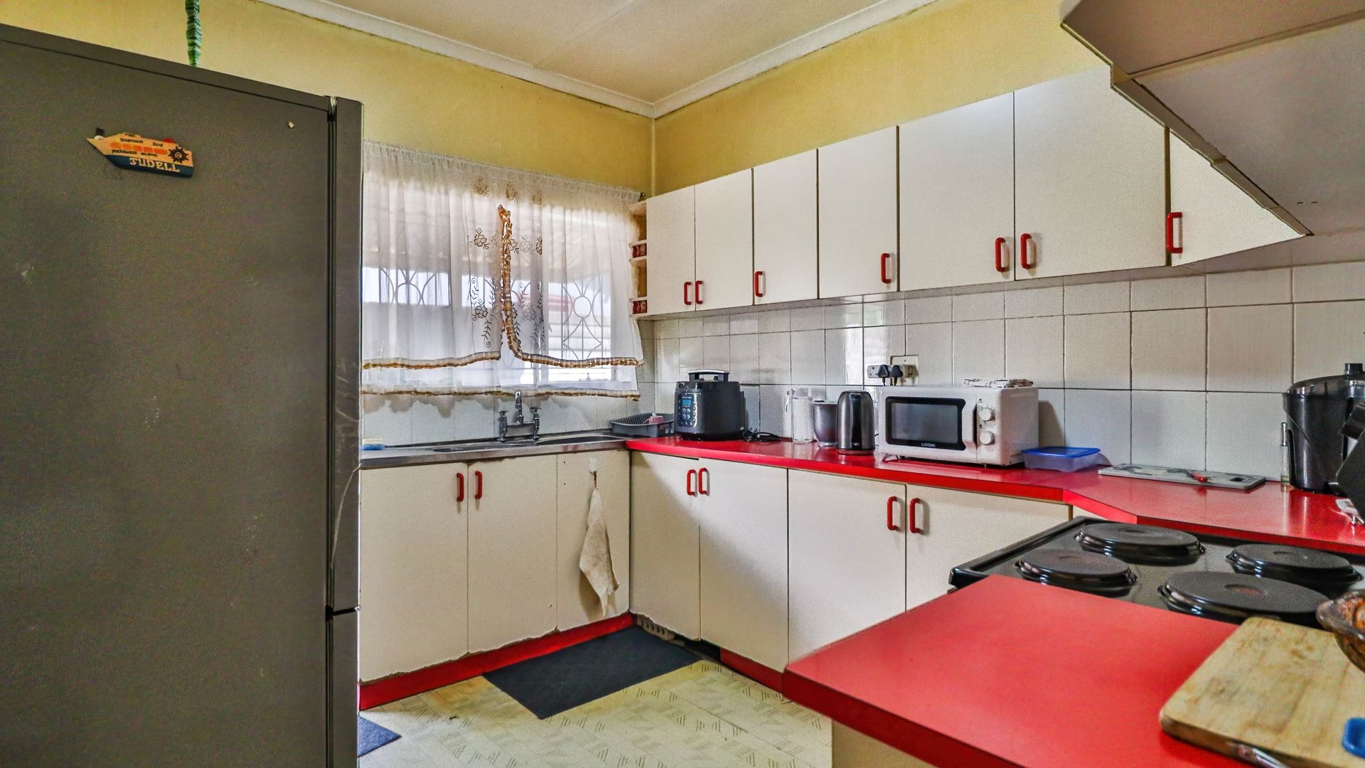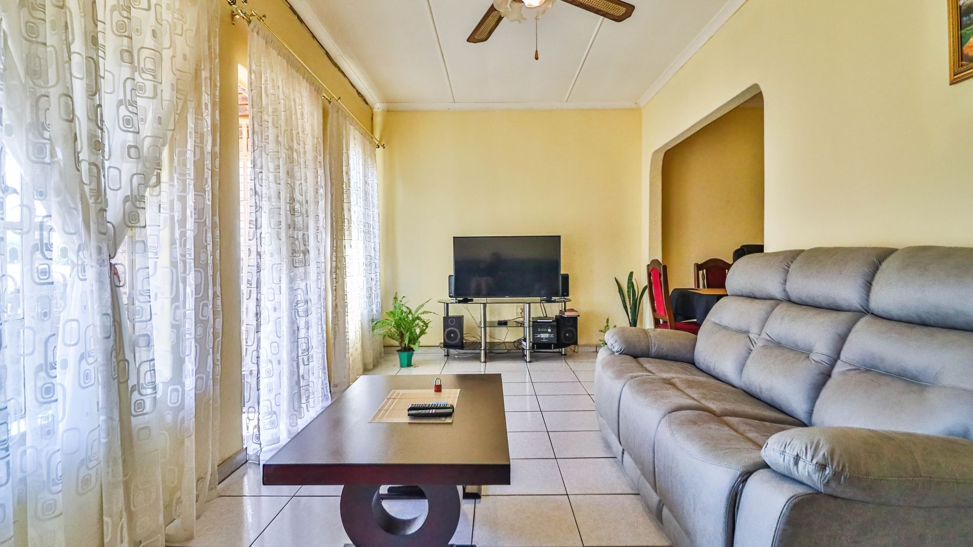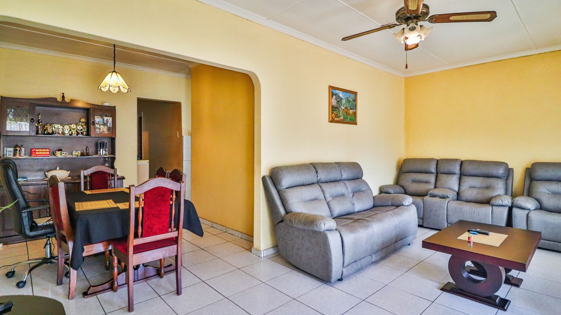 The kitchen is equipped with built-in cupboards and flows into an open-plan lounge and dining area, creating a warm and inviting space ideal for family living.
