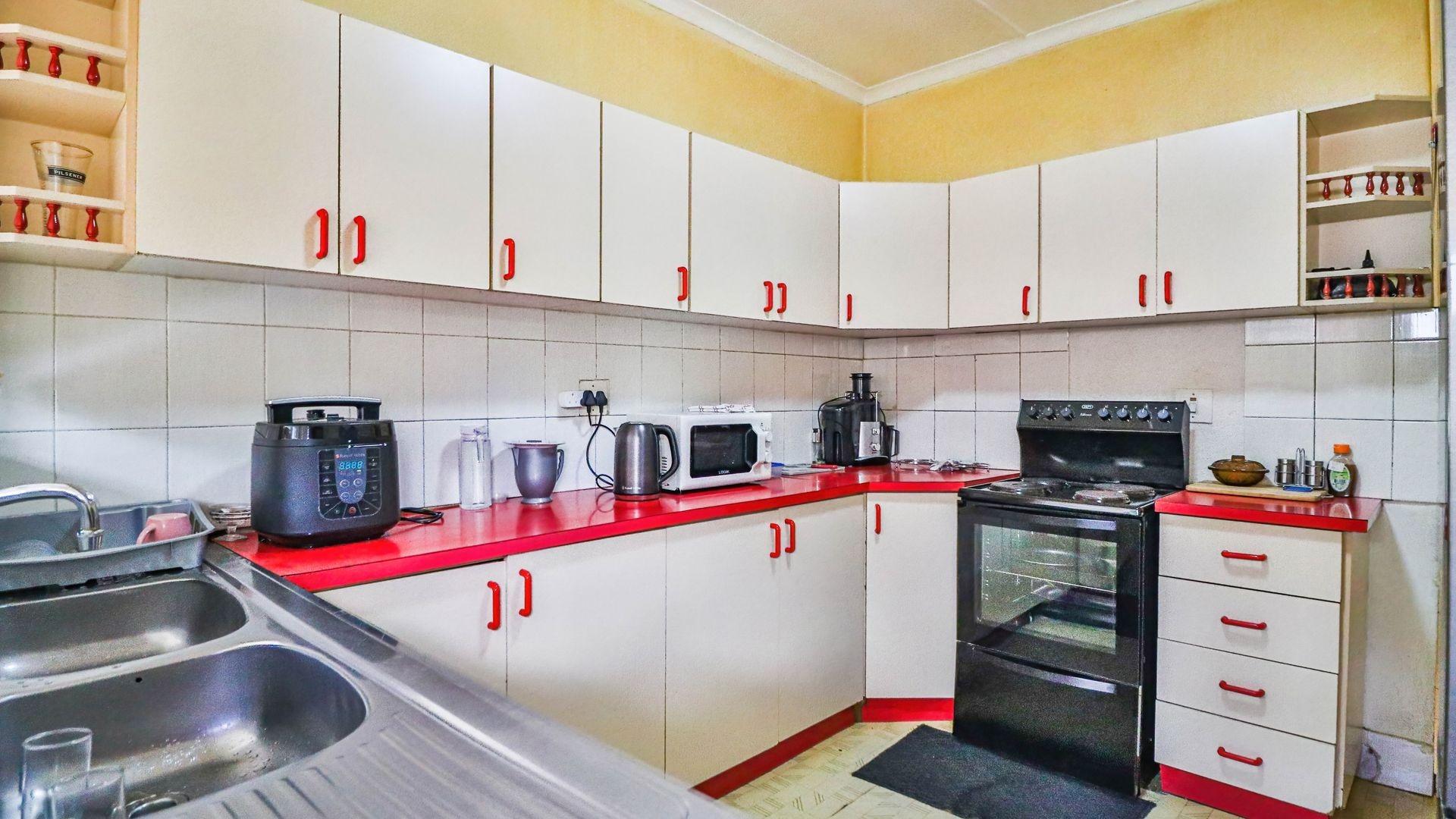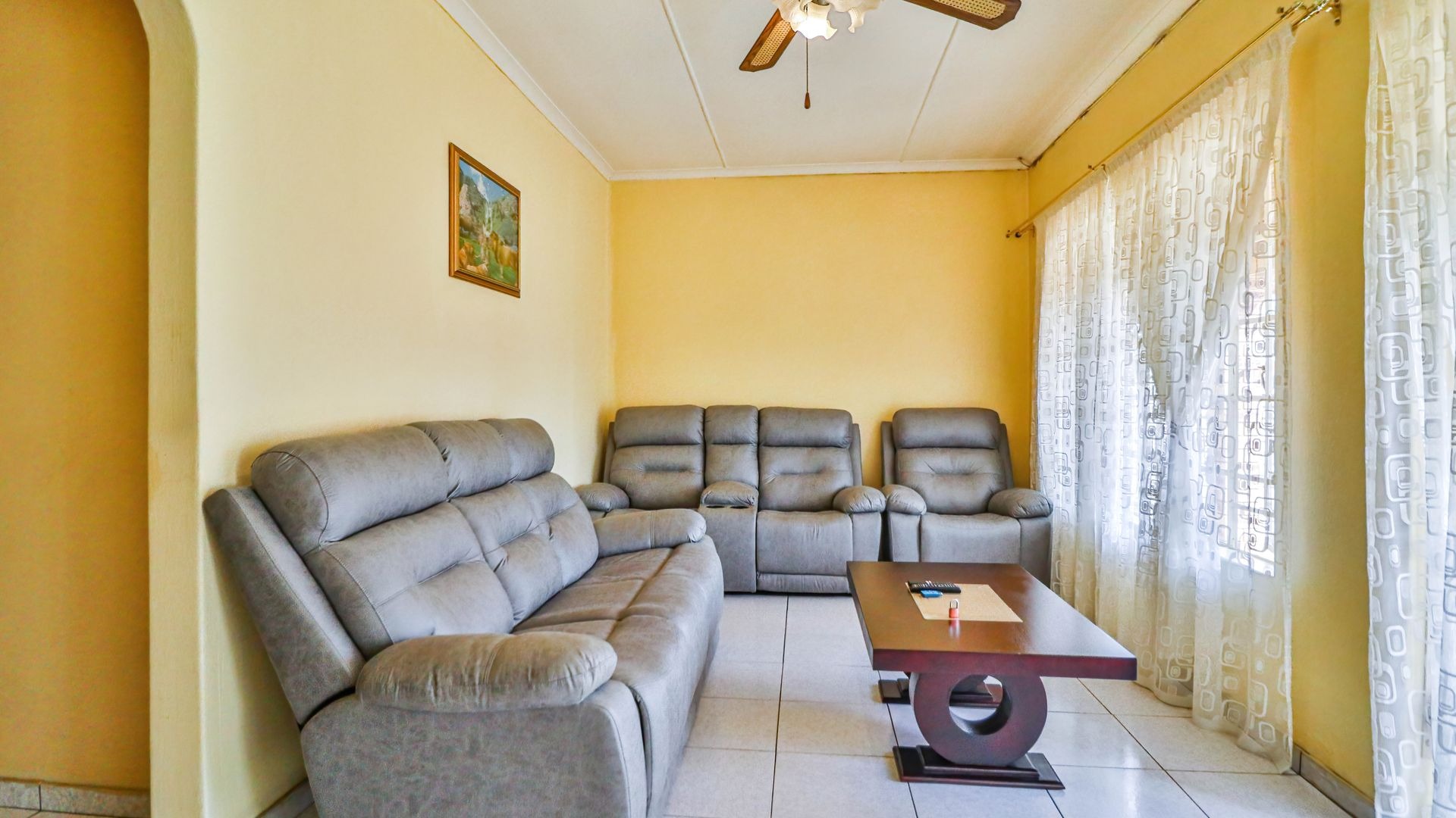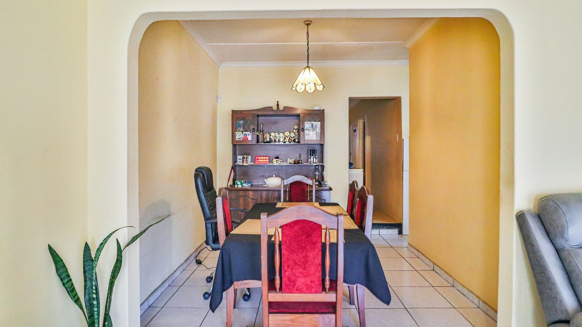 The kitchen is equipped with built-in cupboards and flows into an open-plan lounge and dining area, creating a warm and inviting space ideal for family living.