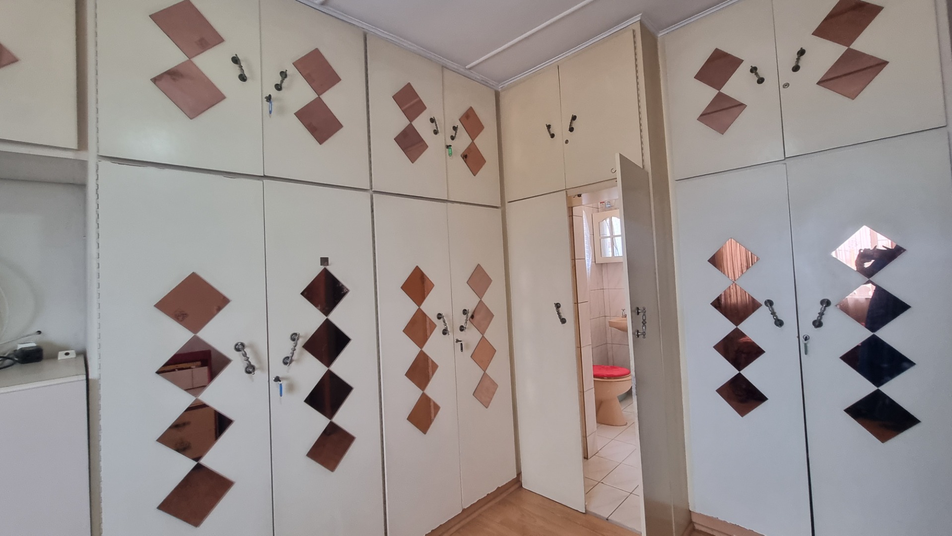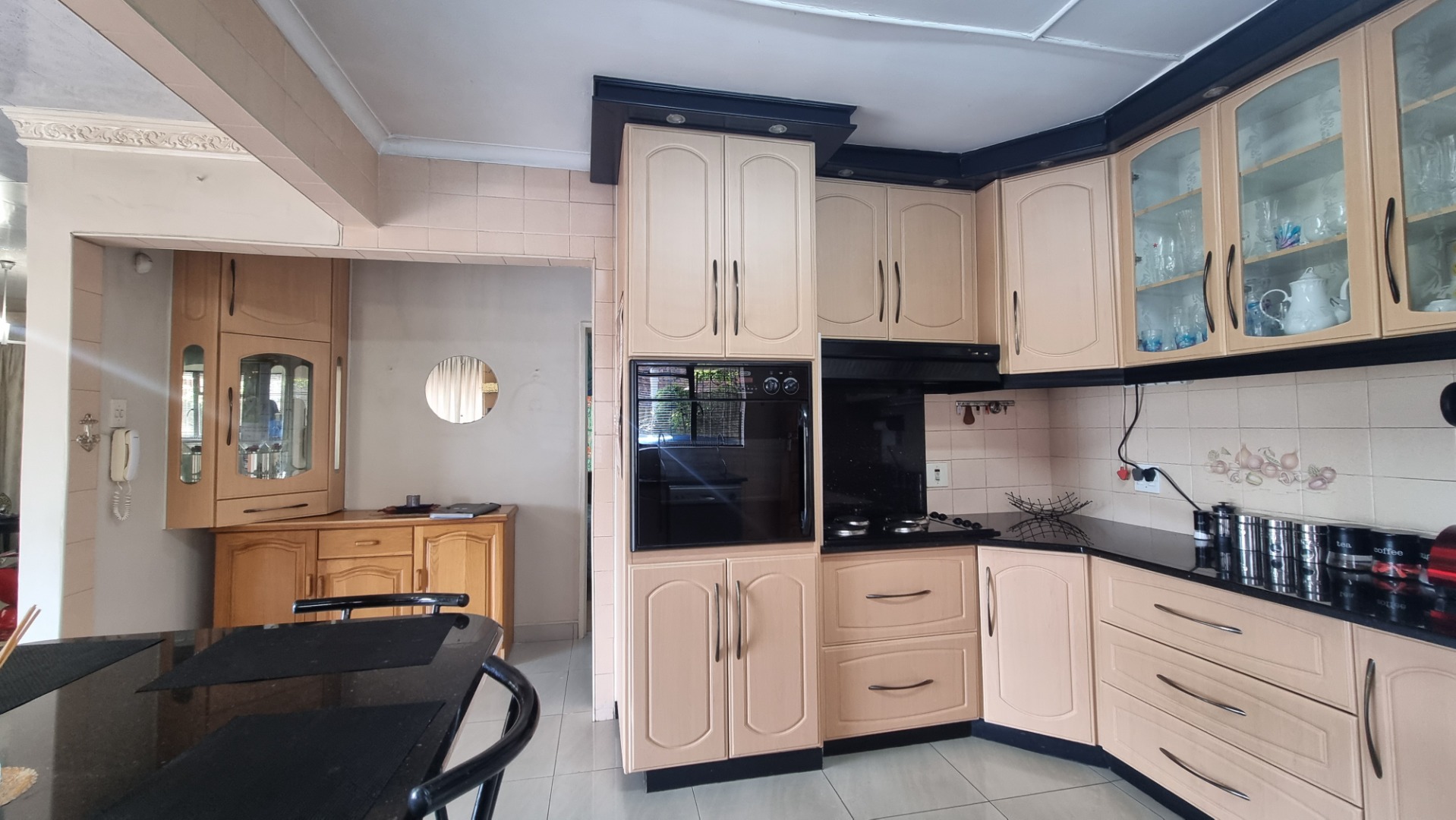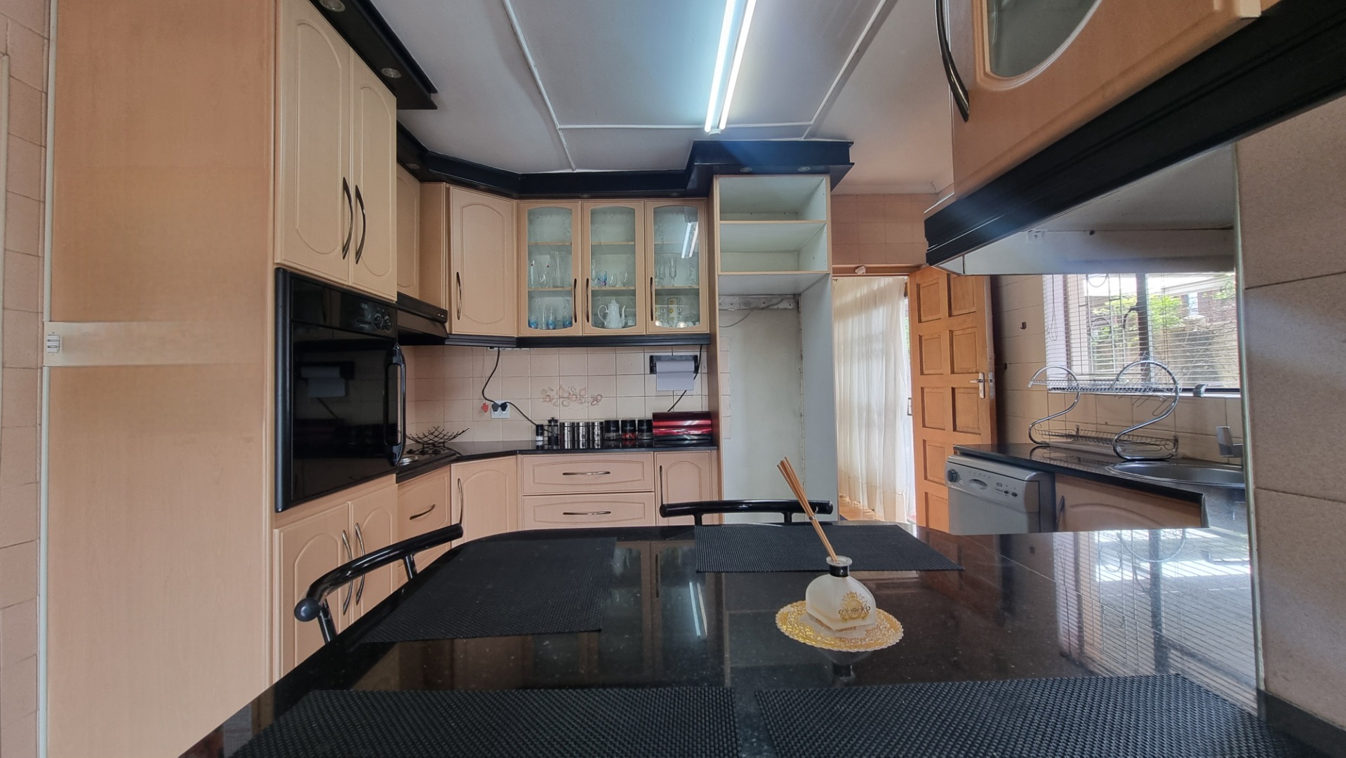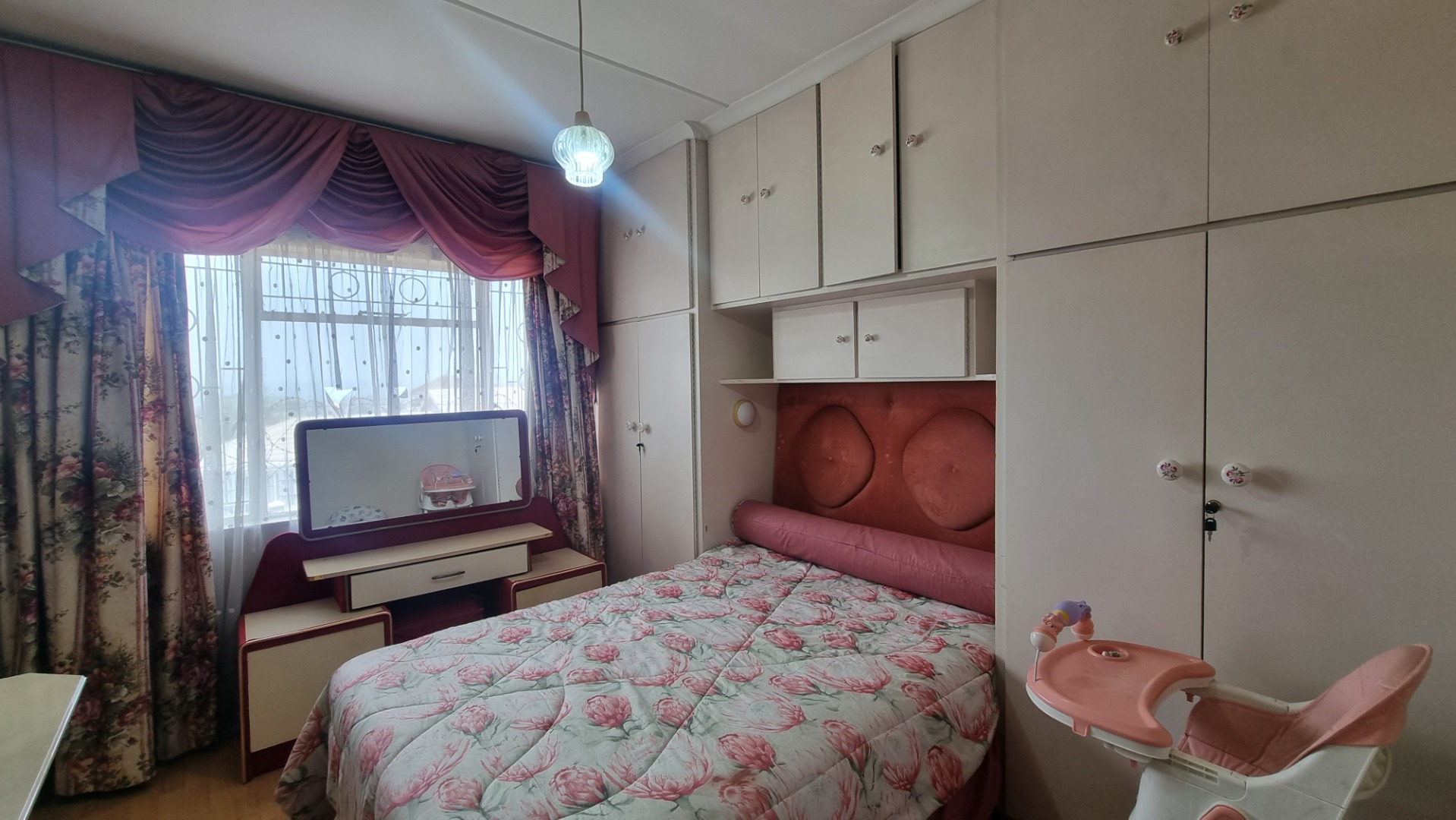 This well-maintained family home offers a fully fitted kitchen with built-in cupboards, oven, hob, extractor, and a separate scullery. It features three bedrooms with built-in cupboards, including a main en-suite. The main bedroom is air-conditioned for added comfort, and there is also a modern family bathroom.