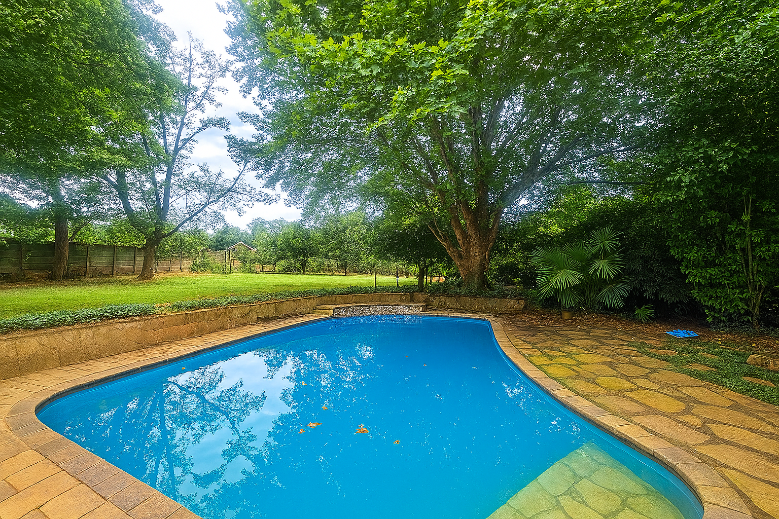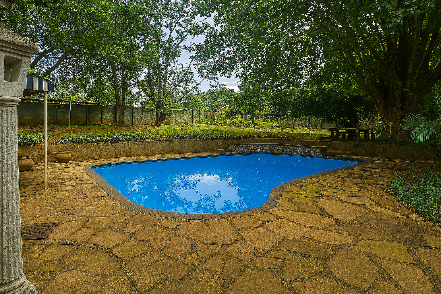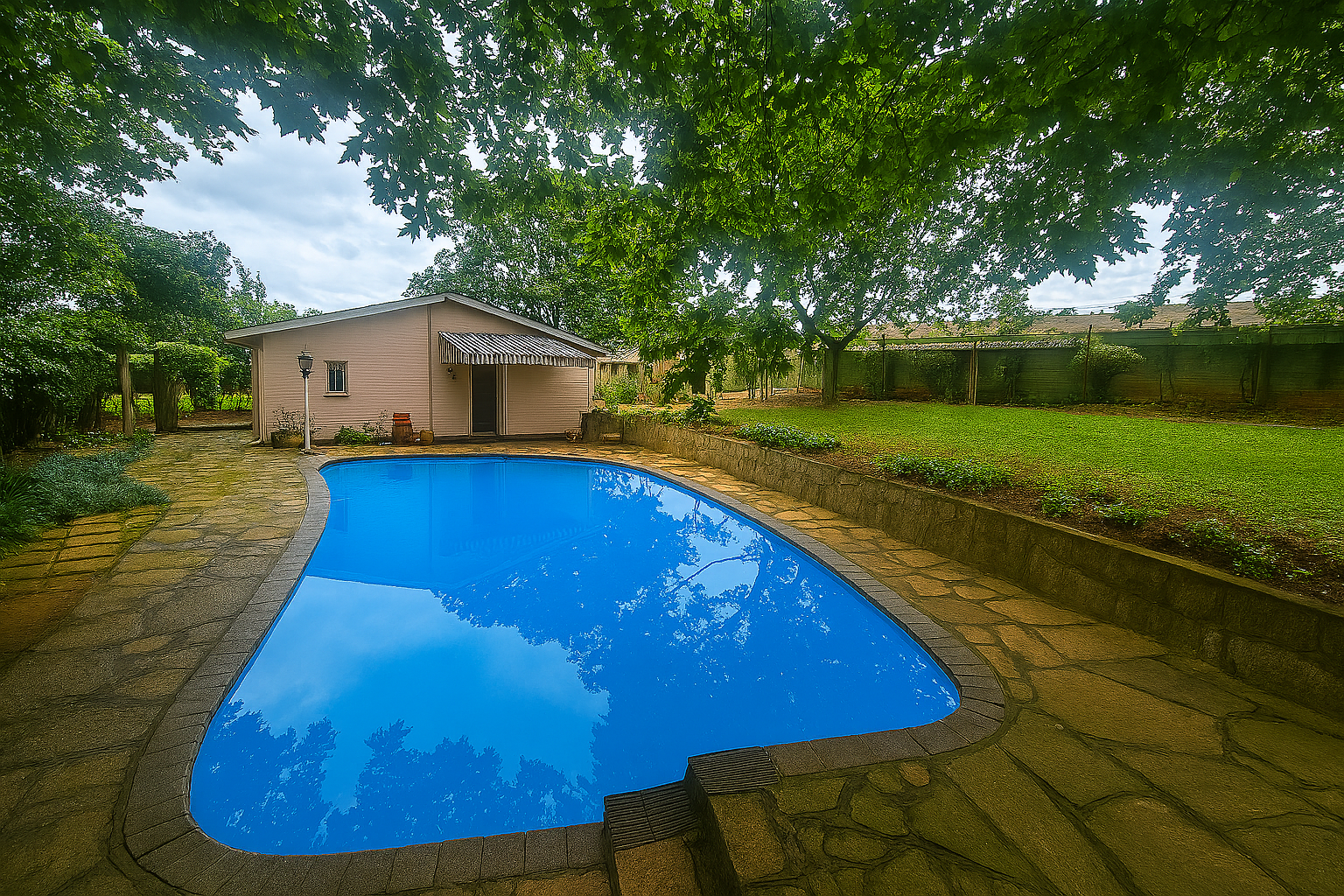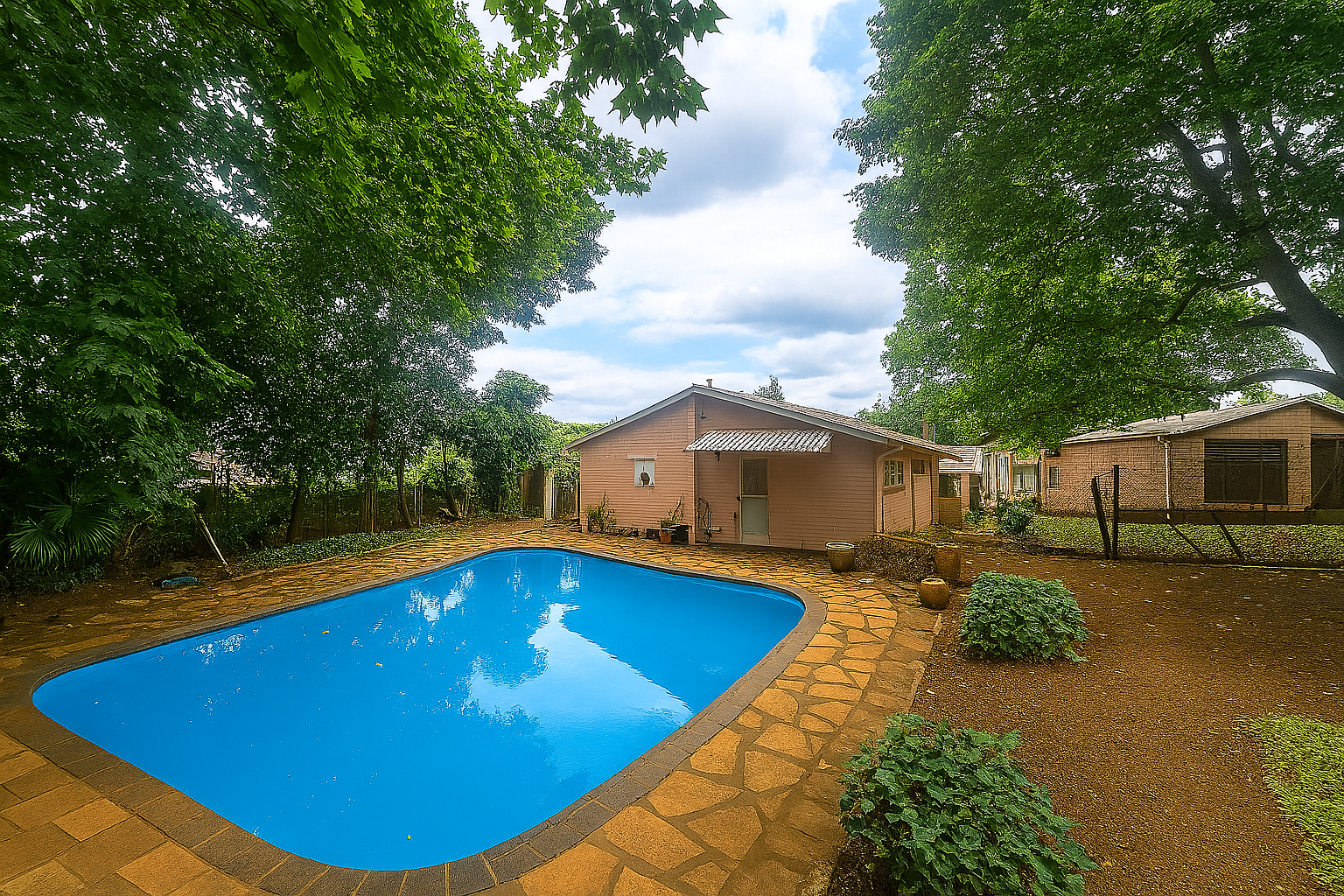 On the other side of the home is a swimming pool and a lovely backyard for the kids to play in.