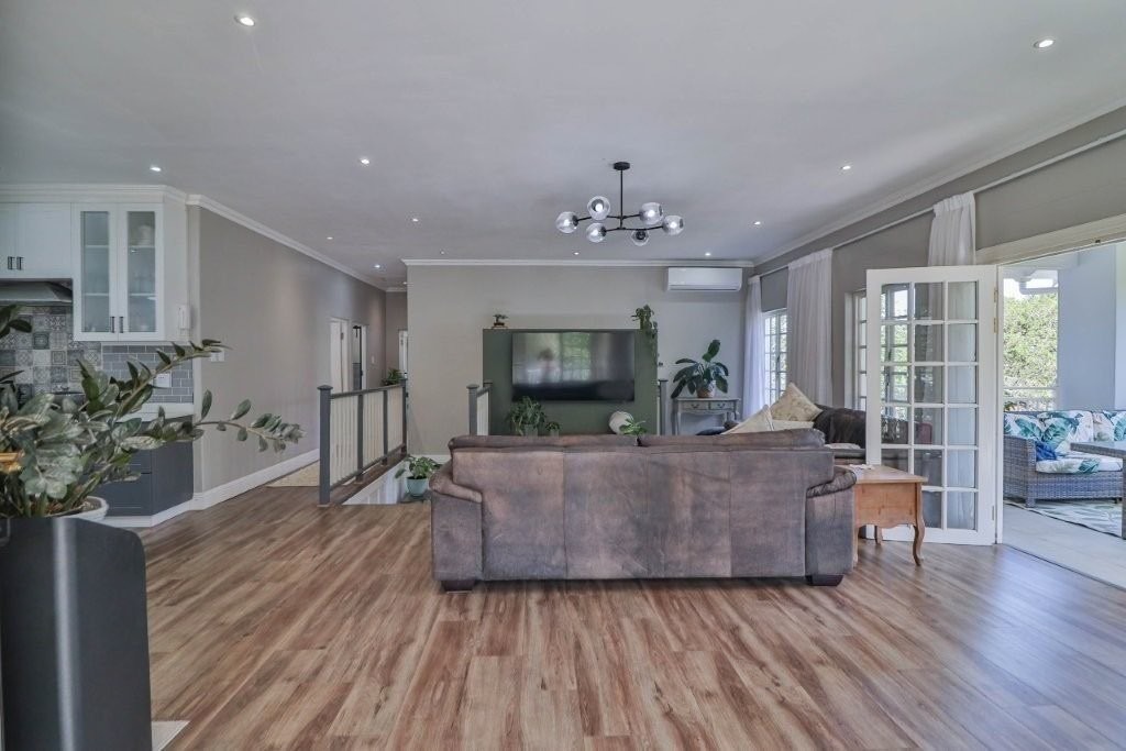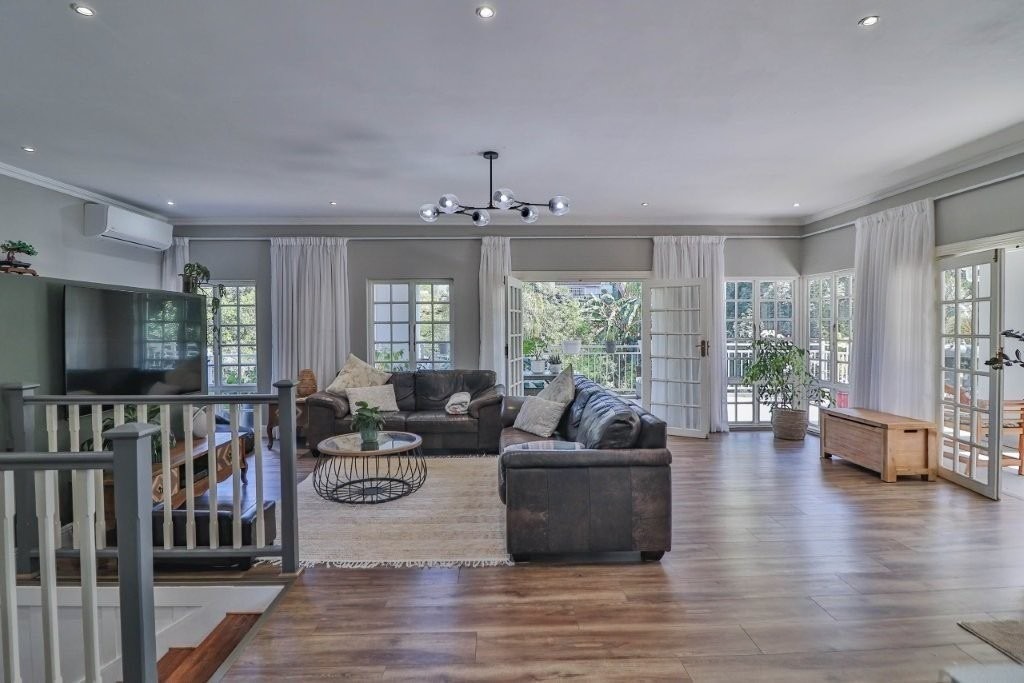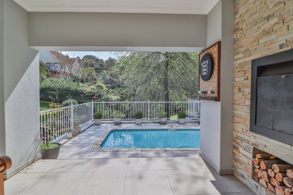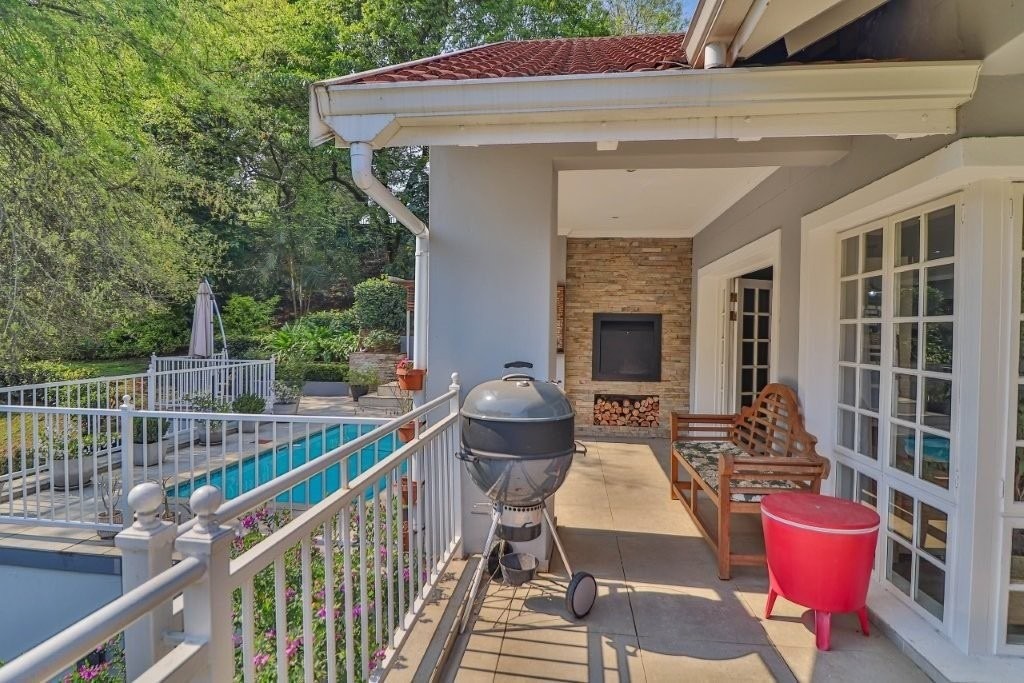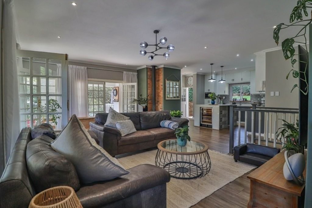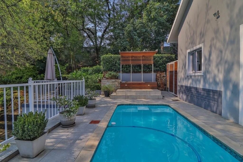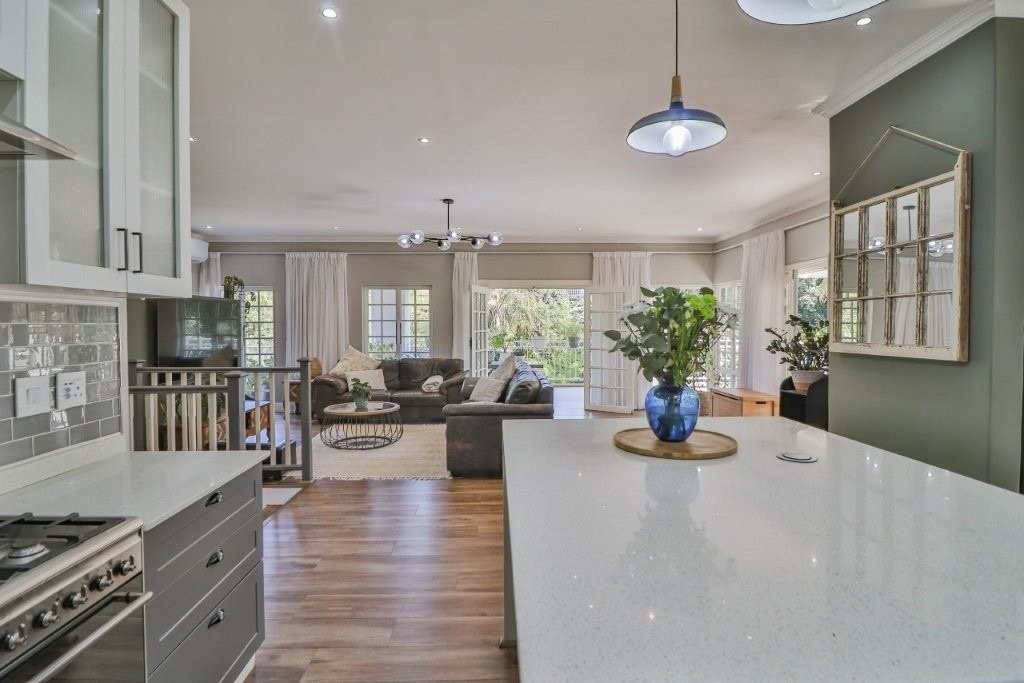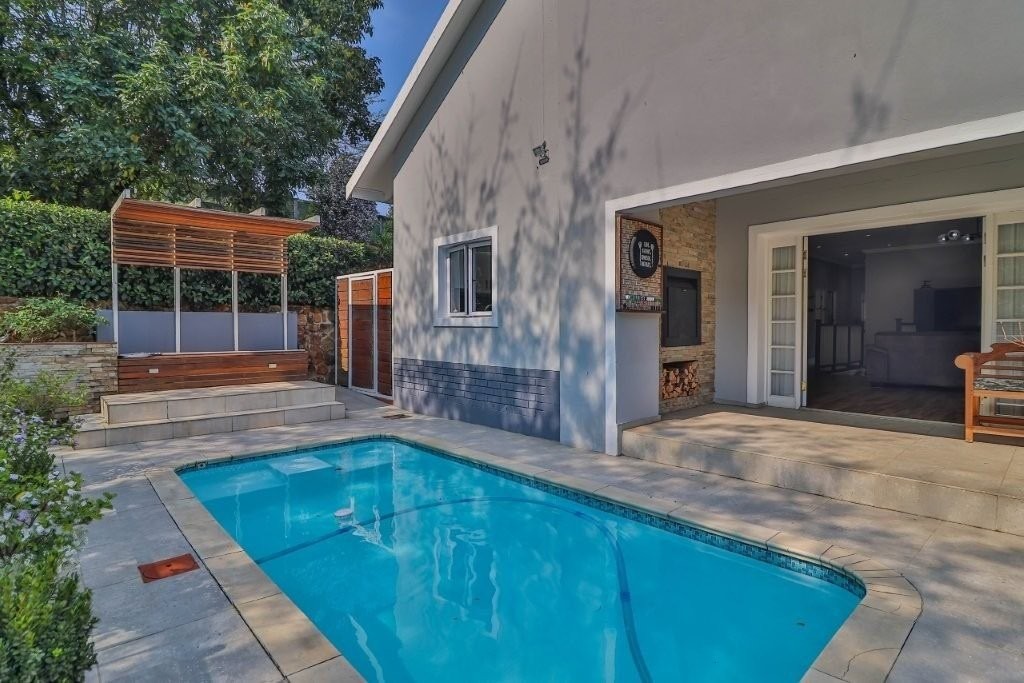 Downstairs one is greeted by a large open plan area which houses a large family room with a fireplace and doors leading onto an under-cover patio . There is good space for a home office as well as a possible wine-cellar area beneath the staircase! On the upper level a spacious lounge and dining room area both lead out through cottage pane doors onto an outside recreation patio on one side and a patio, braai area and pool on the other side. Lovely views over the mature and manicured garden from the main front patio create a sense of calm and unwinding after a long day! A well-equipped kitchen with a feature island , Smegg gas stove , lovely and interestingly tiled areas and a well-sized scullery-cum-laundry make entertainment a huge joy and family affair. There are three spacious and airy bedrooms , all with top drawer built-in-cupboards and air conditioners as well as two very appealing and functional bathrooms which offer great finishes! The main bedroom as well as the second bedroom both lead onto the front view patio. A double garage is on the ground floor of the house whilst a fully-equipped free-standing office , which could be multi-functional, is situated on the bottom tier of the garden.