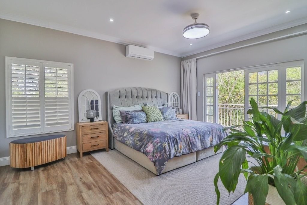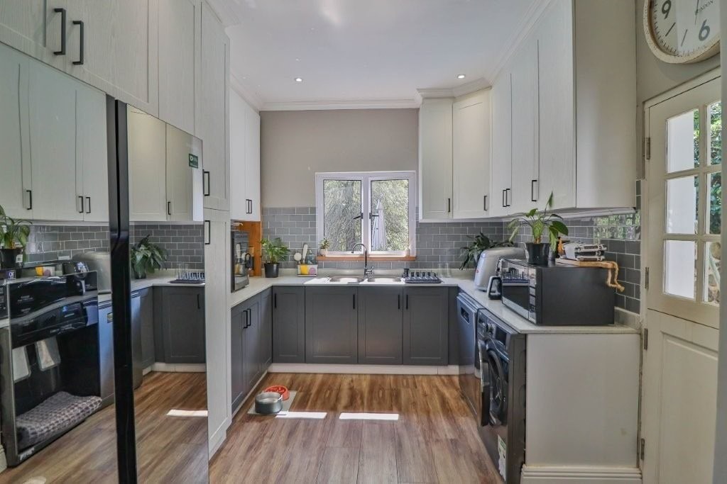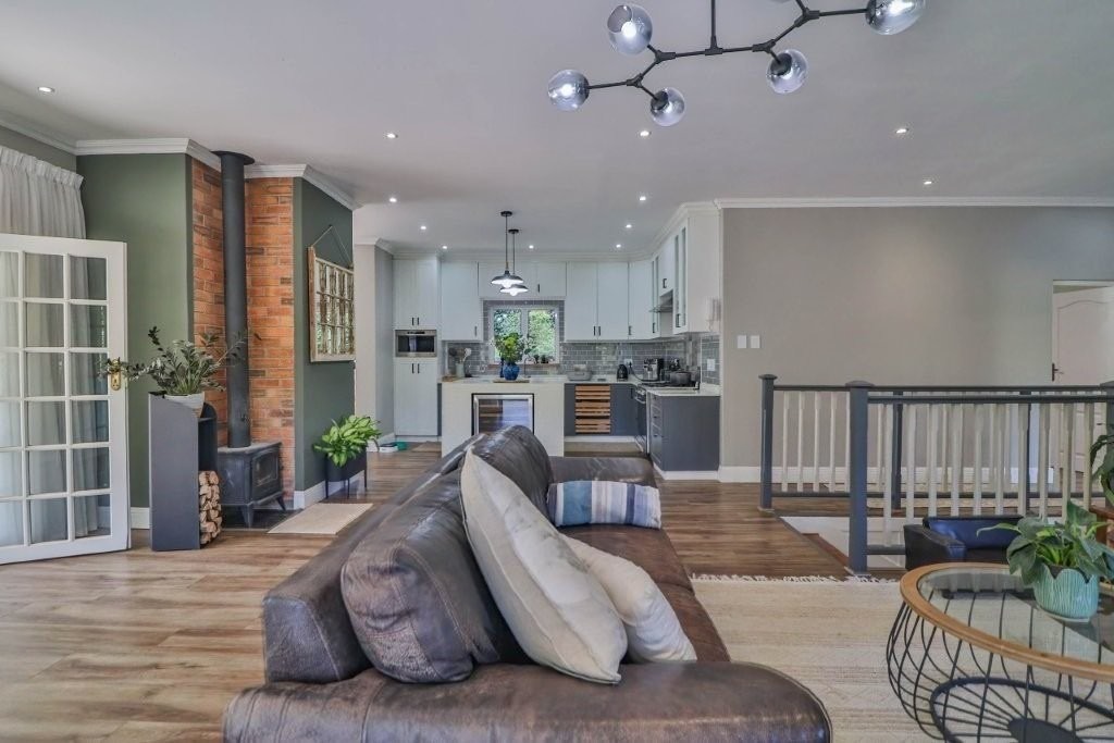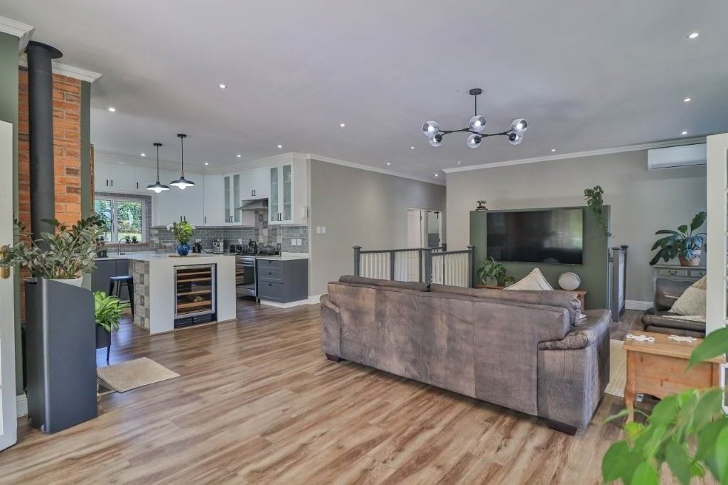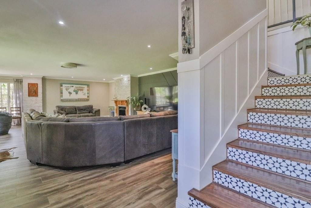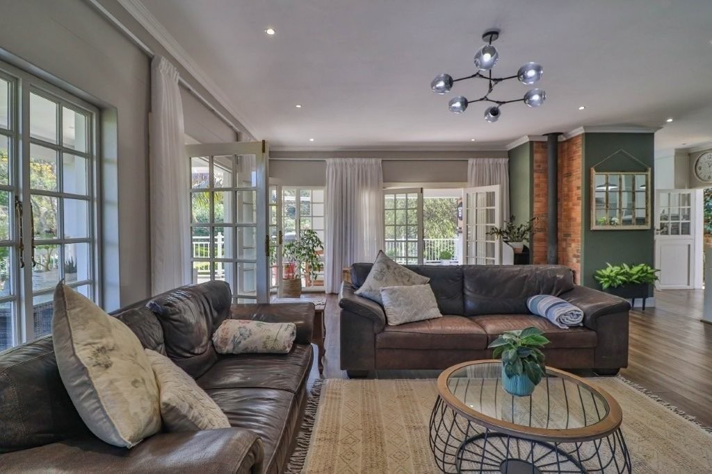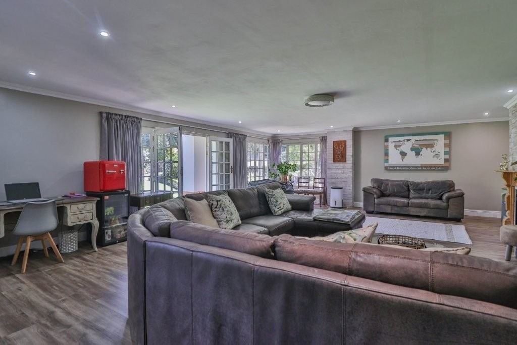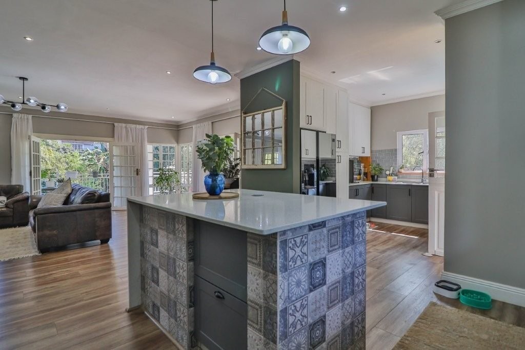 Downstairs one is greeted by a large open plan area which houses a large family room with a fireplace and doors leading onto an under-cover patio . There is good space for a home office as well as a possible wine-cellar area beneath the staircase! On the upper level a spacious lounge and dining room area both lead out through cottage pane doors onto an outside recreation patio on one side and a patio, braai area and pool on the other side. Lovely views over the mature and manicured garden from the main front patio create a sense of calm and unwinding after a long day! A well-equipped kitchen with a feature island , Smegg gas stove , lovely and interestingly tiled areas and a well-sized scullery-cum-laundry make entertainment a huge joy and family affair. There are three spacious and airy bedrooms , all with top drawer built-in-cupboards and air conditioners as well as two very appealing and functional bathrooms which offer great finishes! The main bedroom as well as the second bedroom both lead onto the front view patio. A double garage is on the ground floor of the house whilst a fully-equipped free-standing office , which could be multi-functional, is situated on the bottom tier of the garden.