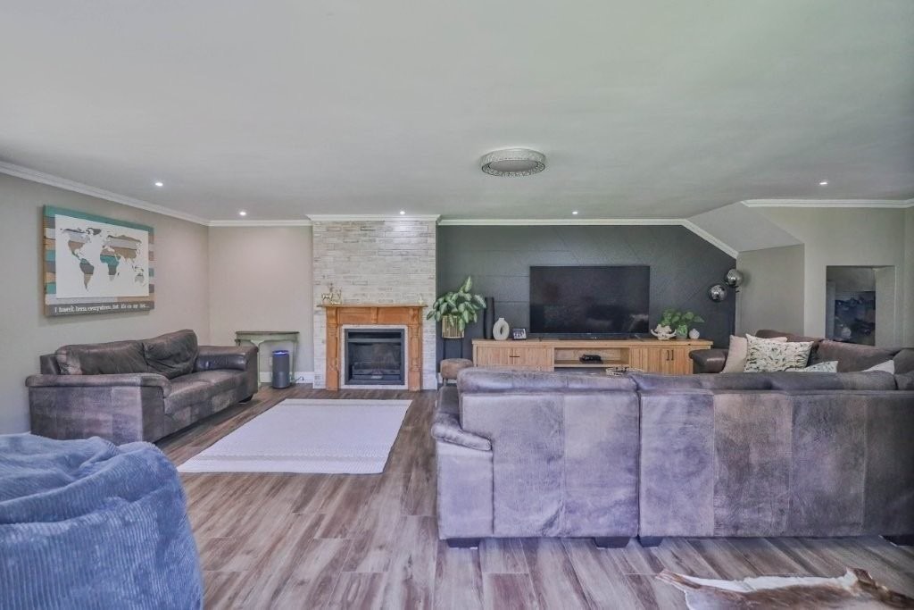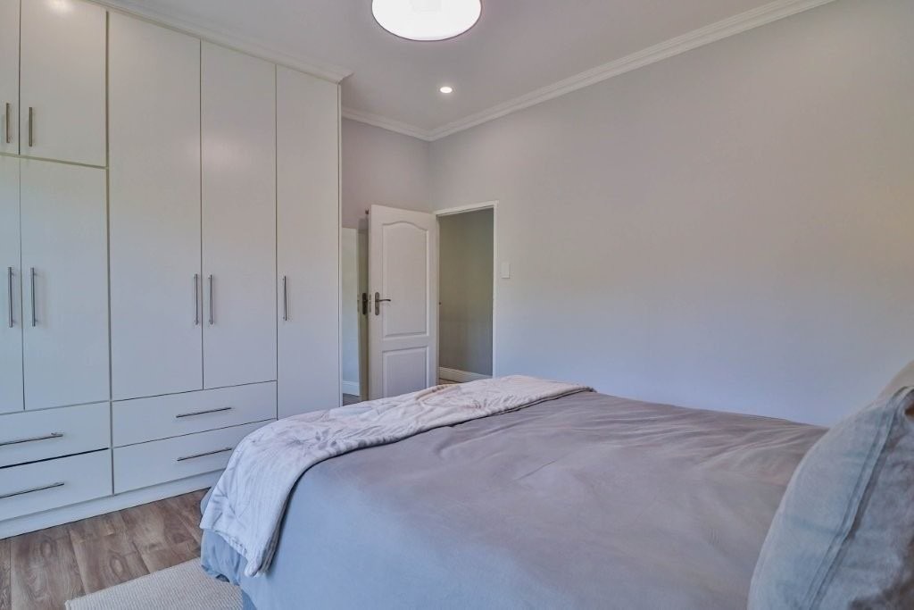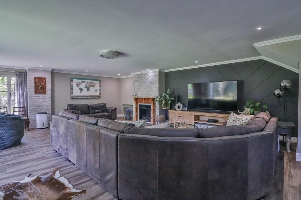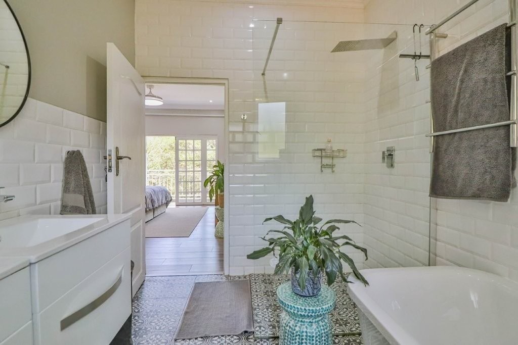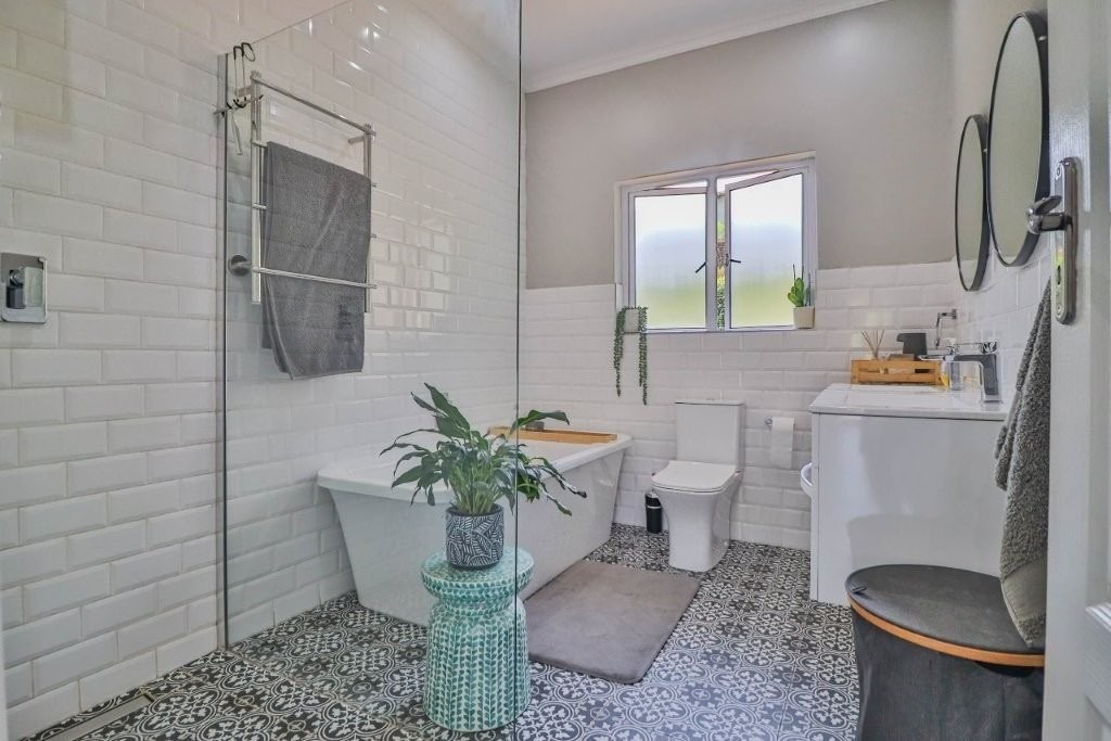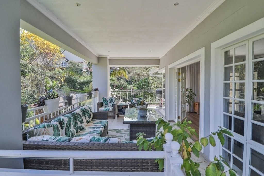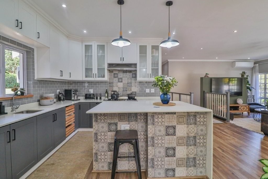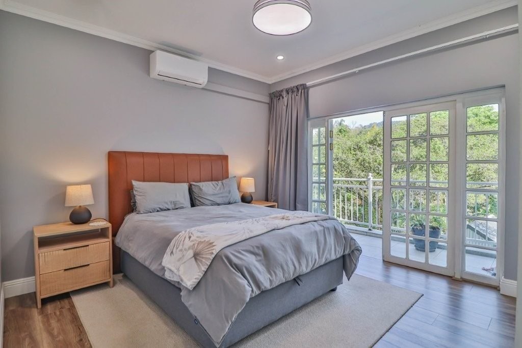 Downstairs one is greeted by a large open plan area which houses a large family room with a fireplace and doors leading onto an under-cover patio . There is good space for a home office as well as a possible wine-cellar area beneath the staircase! On the upper level a spacious lounge and dining room area both lead out through cottage pane doors onto an outside recreation patio on one side and a patio, braai area and pool on the other side. Lovely views over the mature and manicured garden from the main front patio create a sense of calm and unwinding after a long day! A well-equipped kitchen with a feature island , Smegg gas stove , lovely and interestingly tiled areas and a well-sized scullery-cum-laundry make entertainment a huge joy and family affair. There are three spacious and airy bedrooms , all with top drawer built-in-cupboards and air conditioners as well as two very appealing and functional bathrooms which offer great finishes! The main bedroom as well as the second bedroom both lead onto the front view patio. A double garage is on the ground floor of the house whilst a fully-equipped free-standing office , which could be multi-functional, is situated on the bottom tier of the garden.