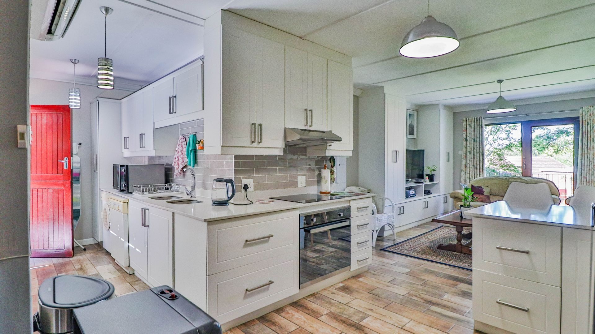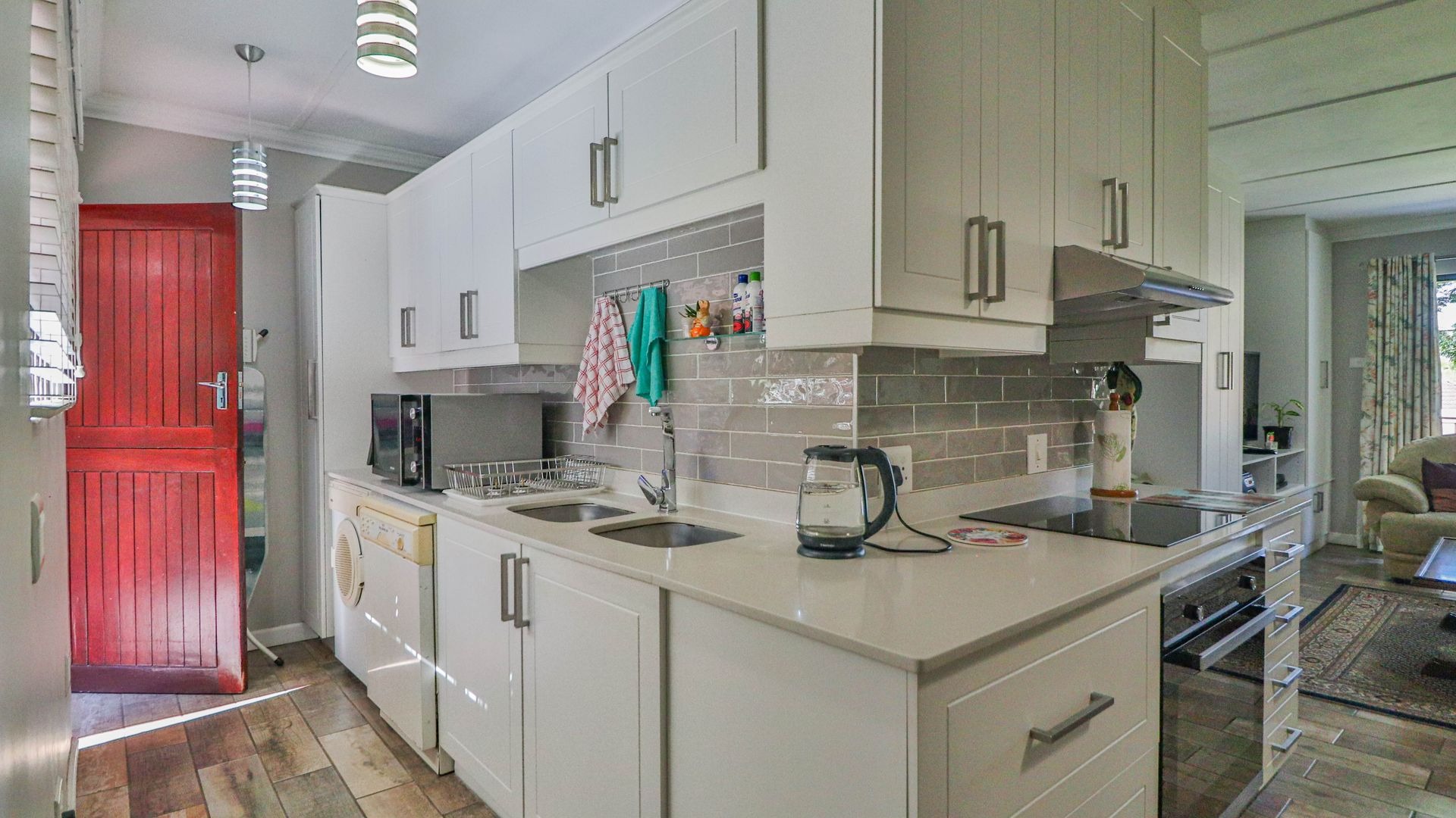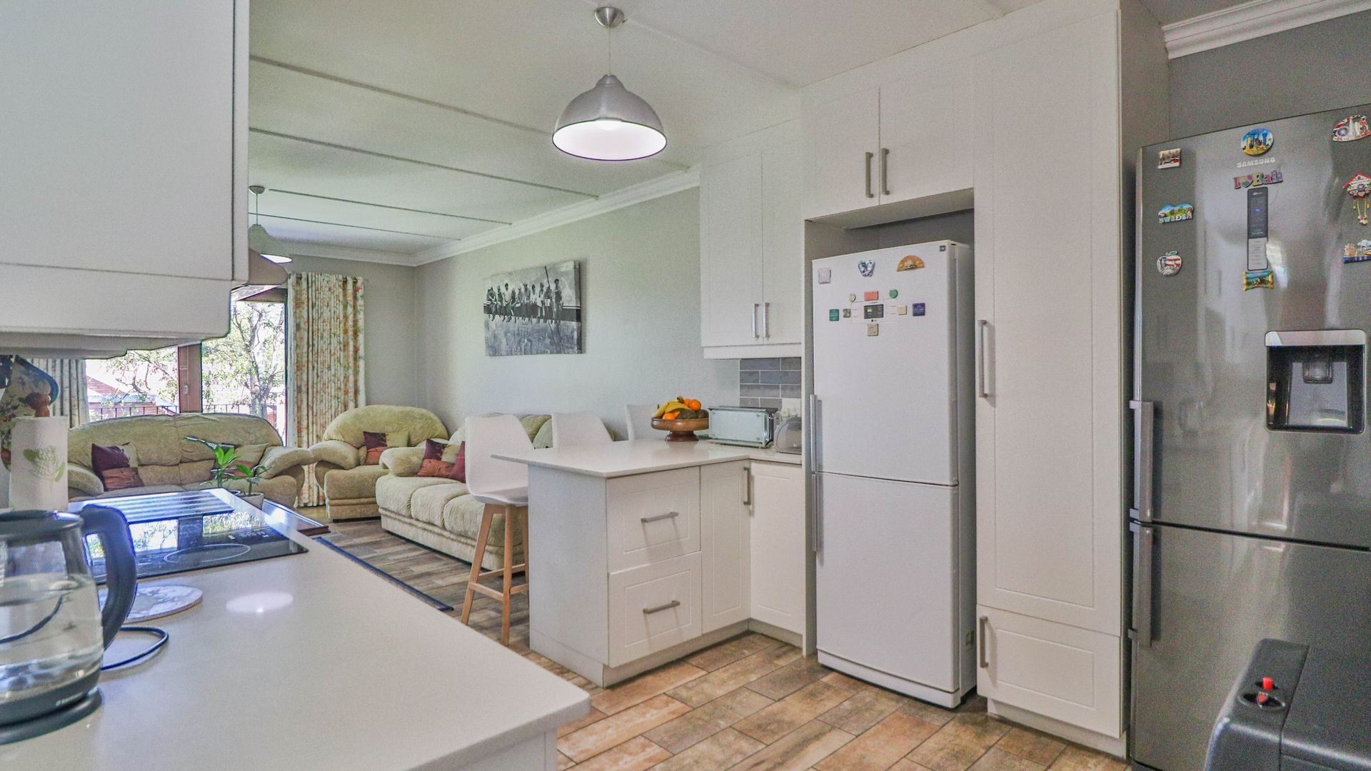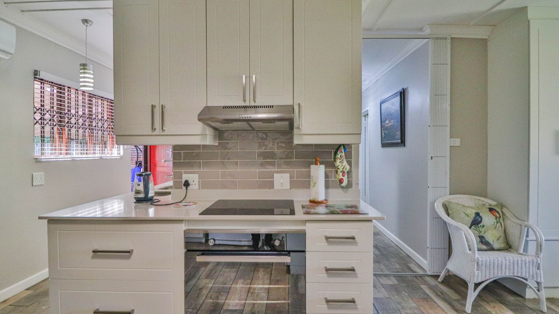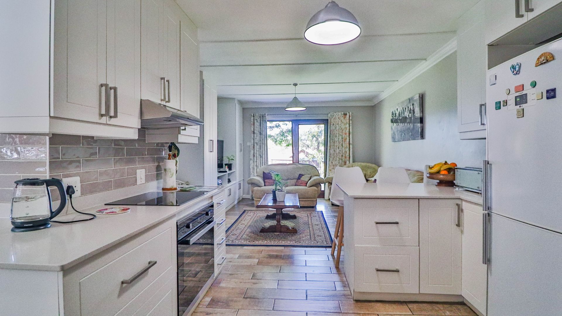 Come on in and discover this lovely 3-bedroom, 2-bathroom home nestled in a friendly complex in Oak Park, Pietermaritzburg. As you step inside, you'll find a welcoming entrance hall leading into a spacious open-plan living area. The modern kitchen is a real highlight, boasting sleek white cabinetry, light countertops, a stylish grey subway tile backsplash, and integrated appliances like an electric hob and oven. There's even a handy breakfast bar, perfect for casual meals or catching up with friends, all tied together with durable wood-look tiled flooring.