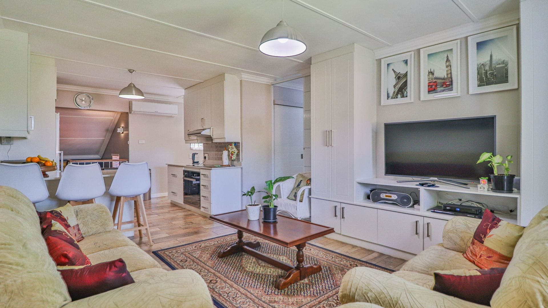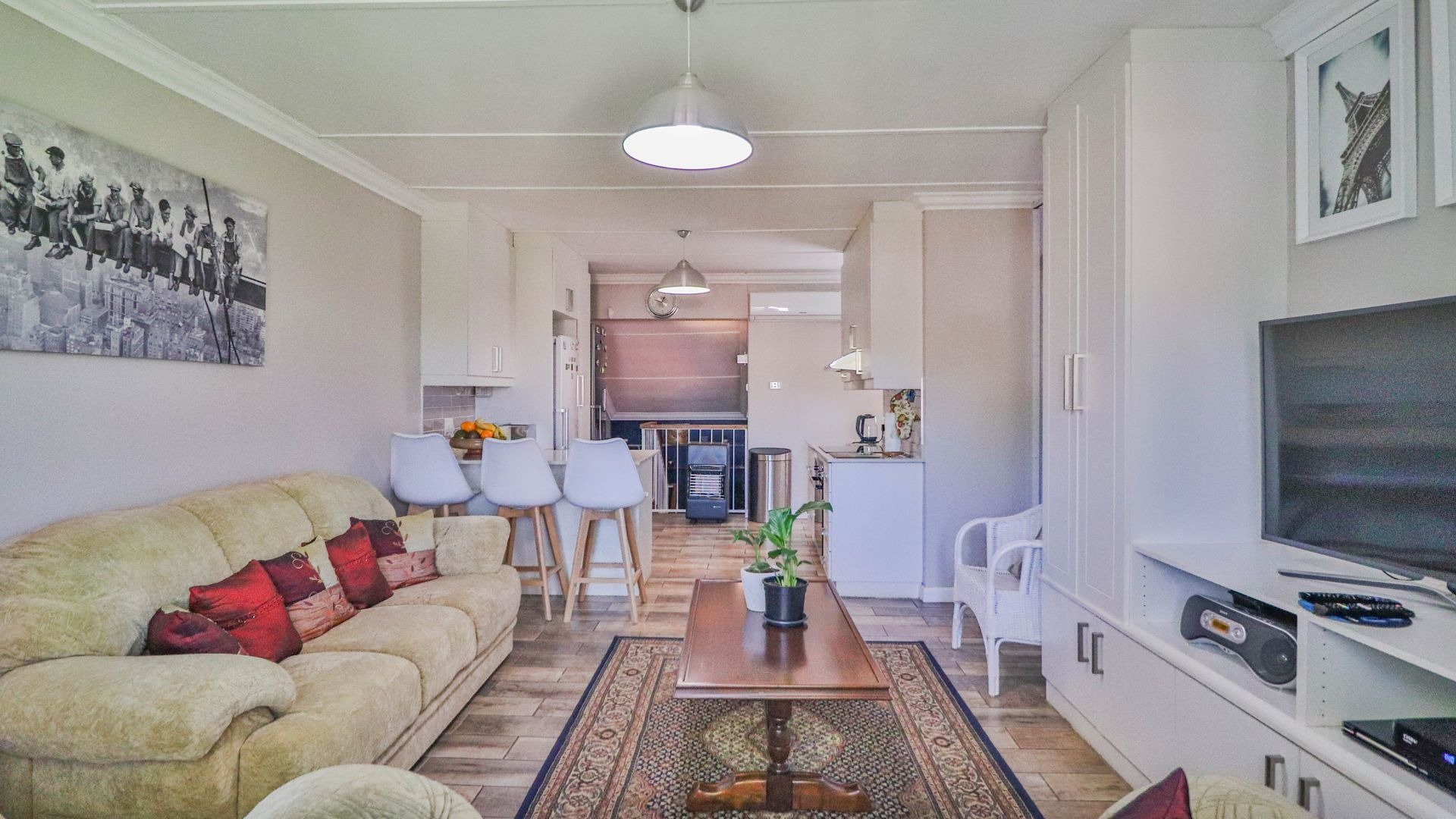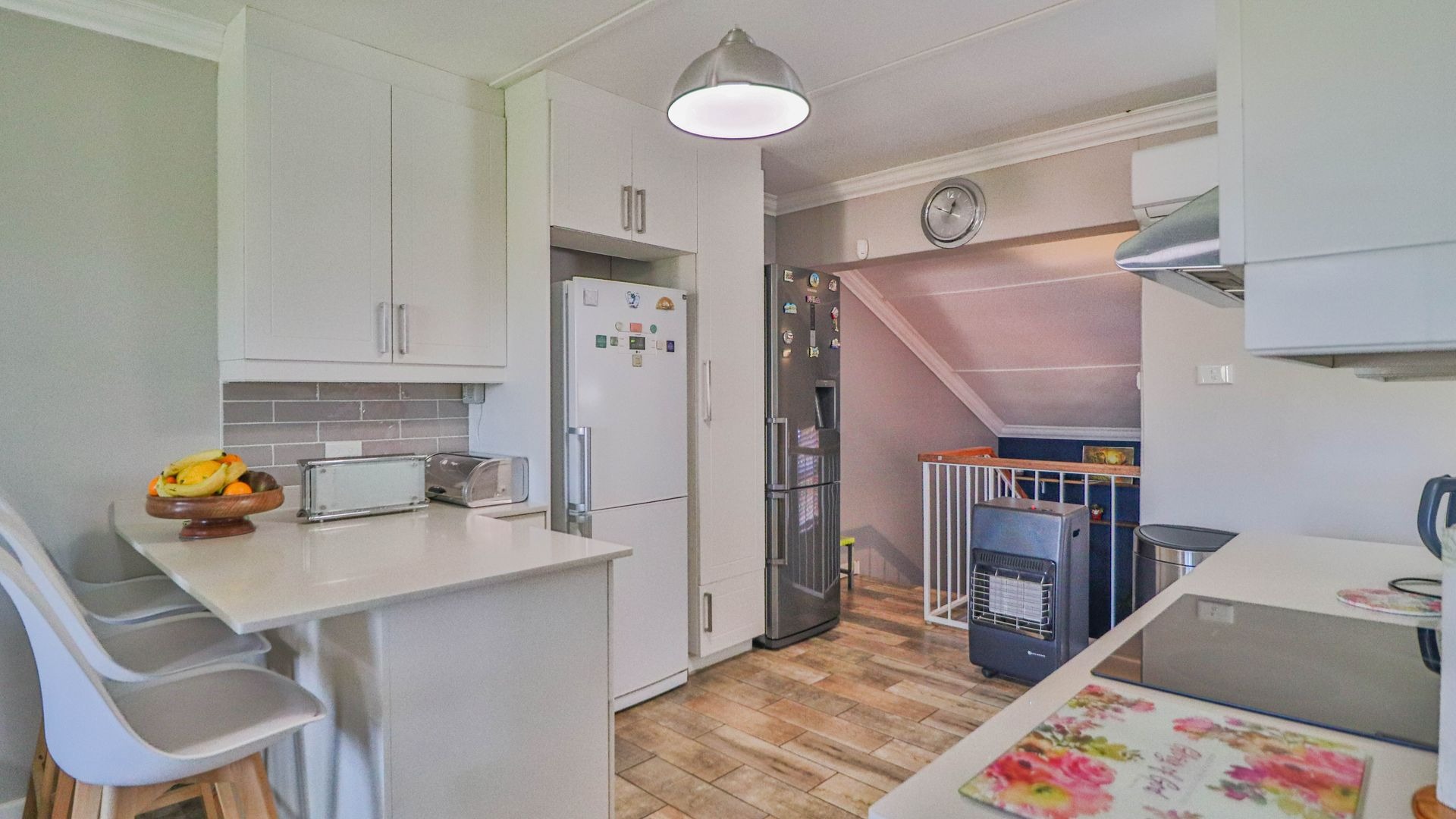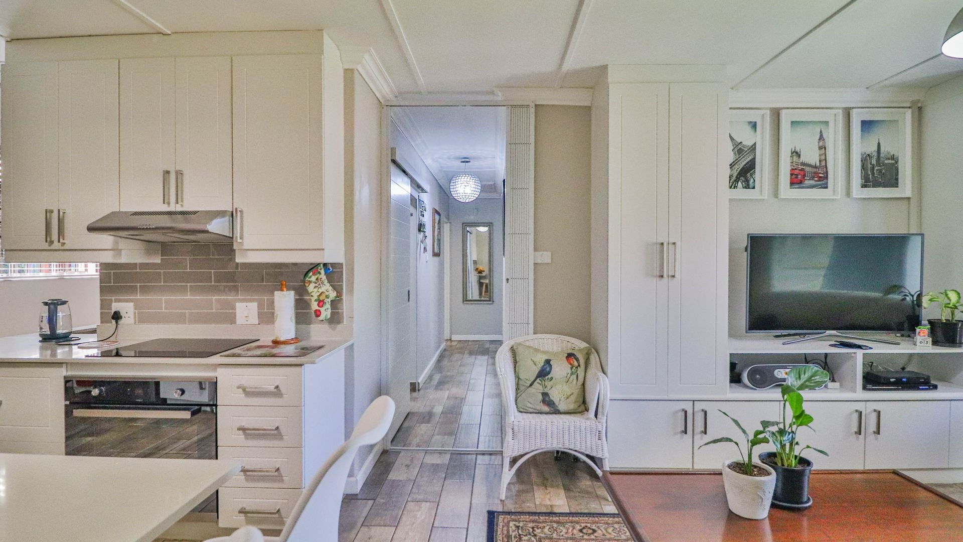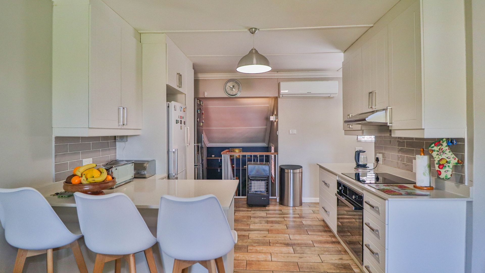 Come on in and discover this lovely 3-bedroom, 2-bathroom home nestled in a friendly complex in Oak Park, Pietermaritzburg. As you step inside, you'll find a welcoming entrance hall leading into a spacious open-plan living area. The modern kitchen is a real highlight, boasting sleek white cabinetry, light countertops, a stylish grey subway tile backsplash, and integrated appliances like an electric hob and oven. There's even a handy breakfast bar, perfect for casual meals or catching up with friends, all tied together with durable wood-look tiled flooring.