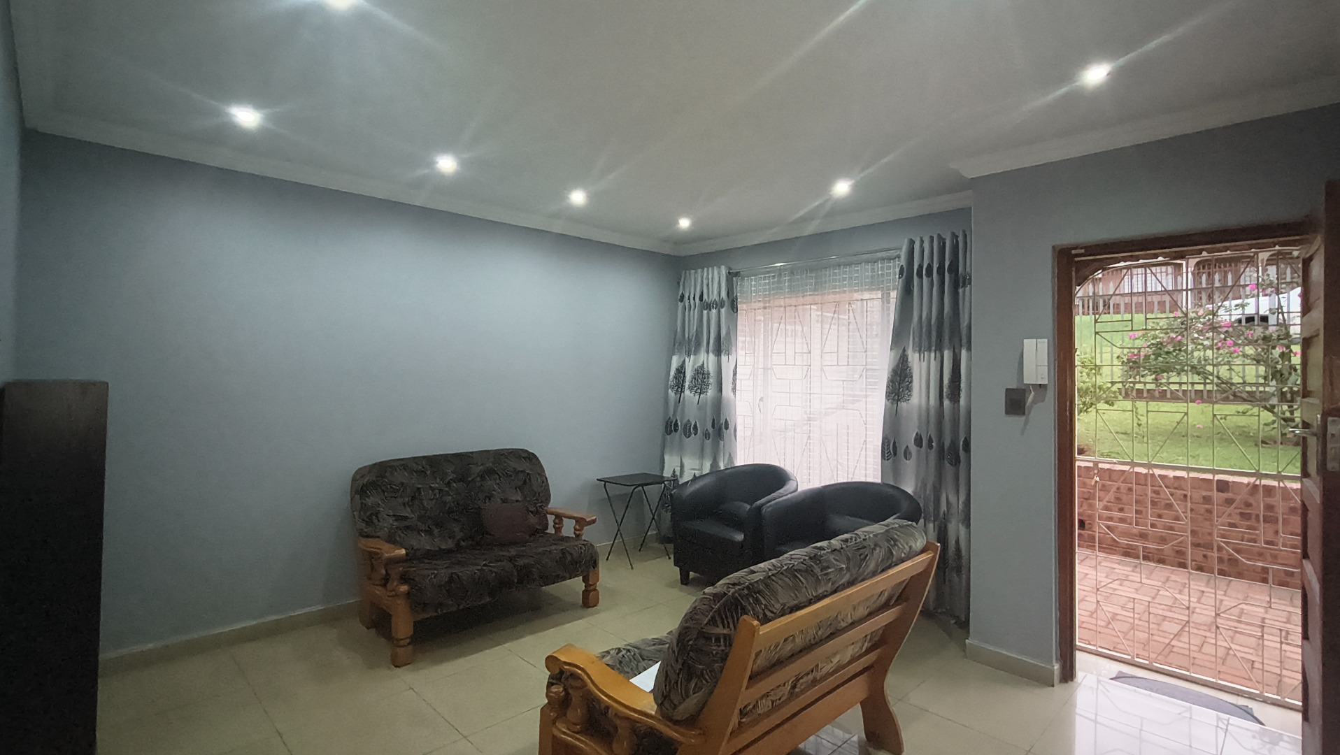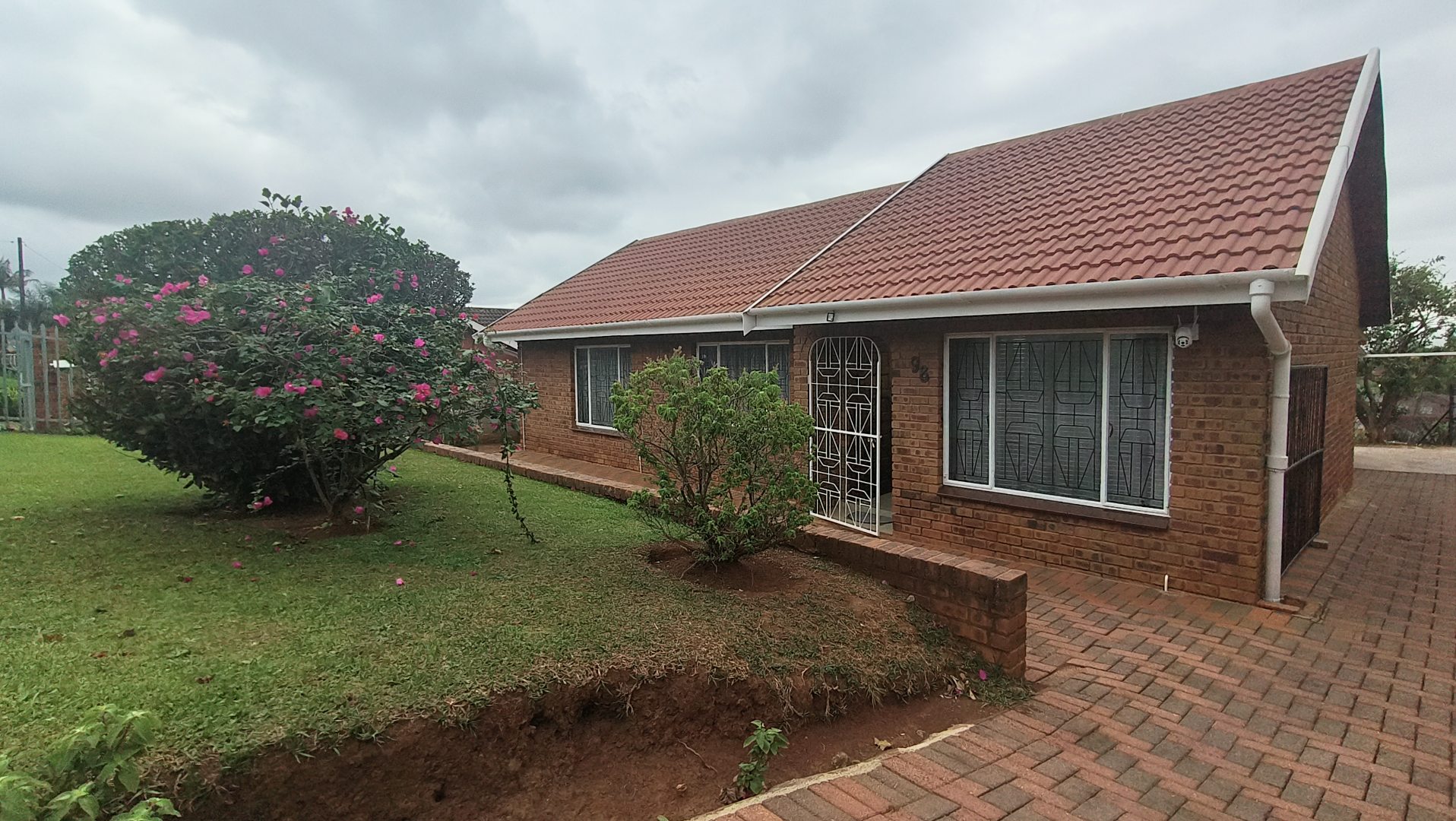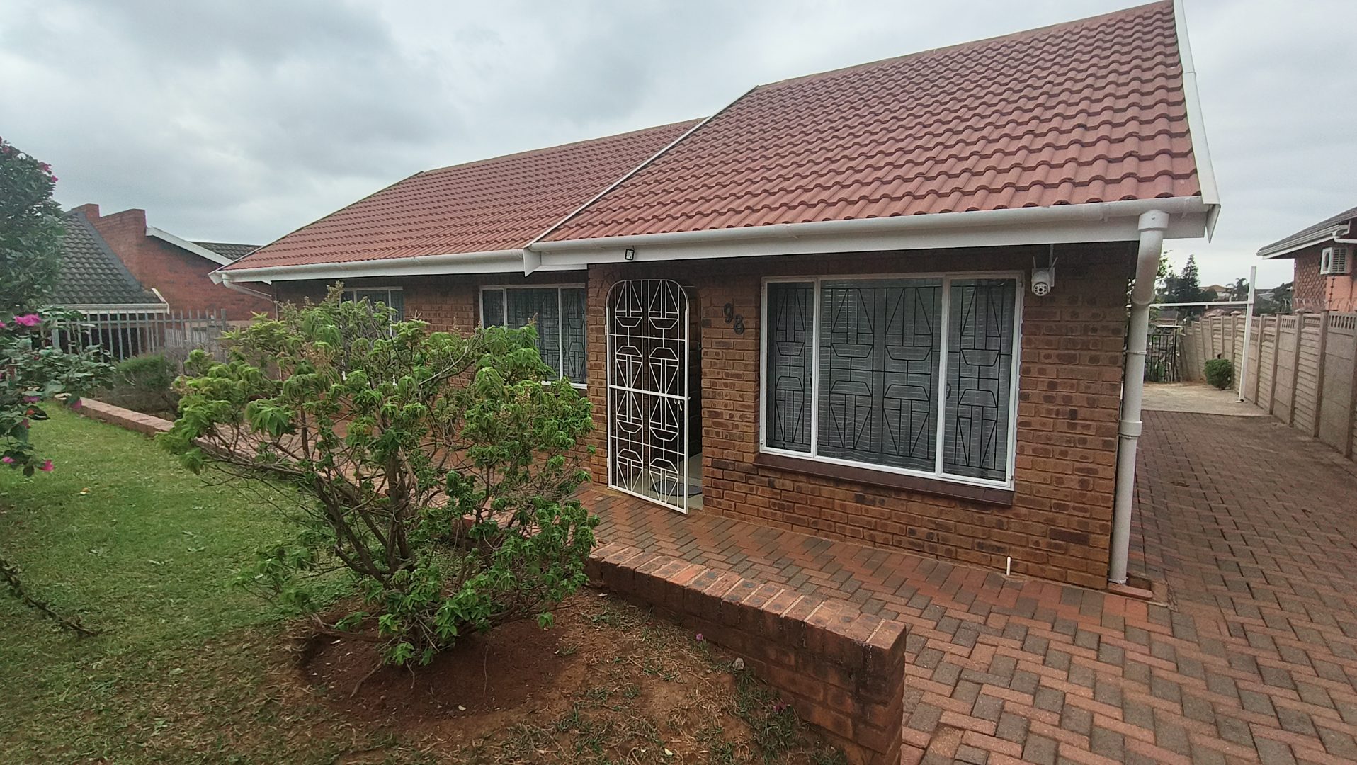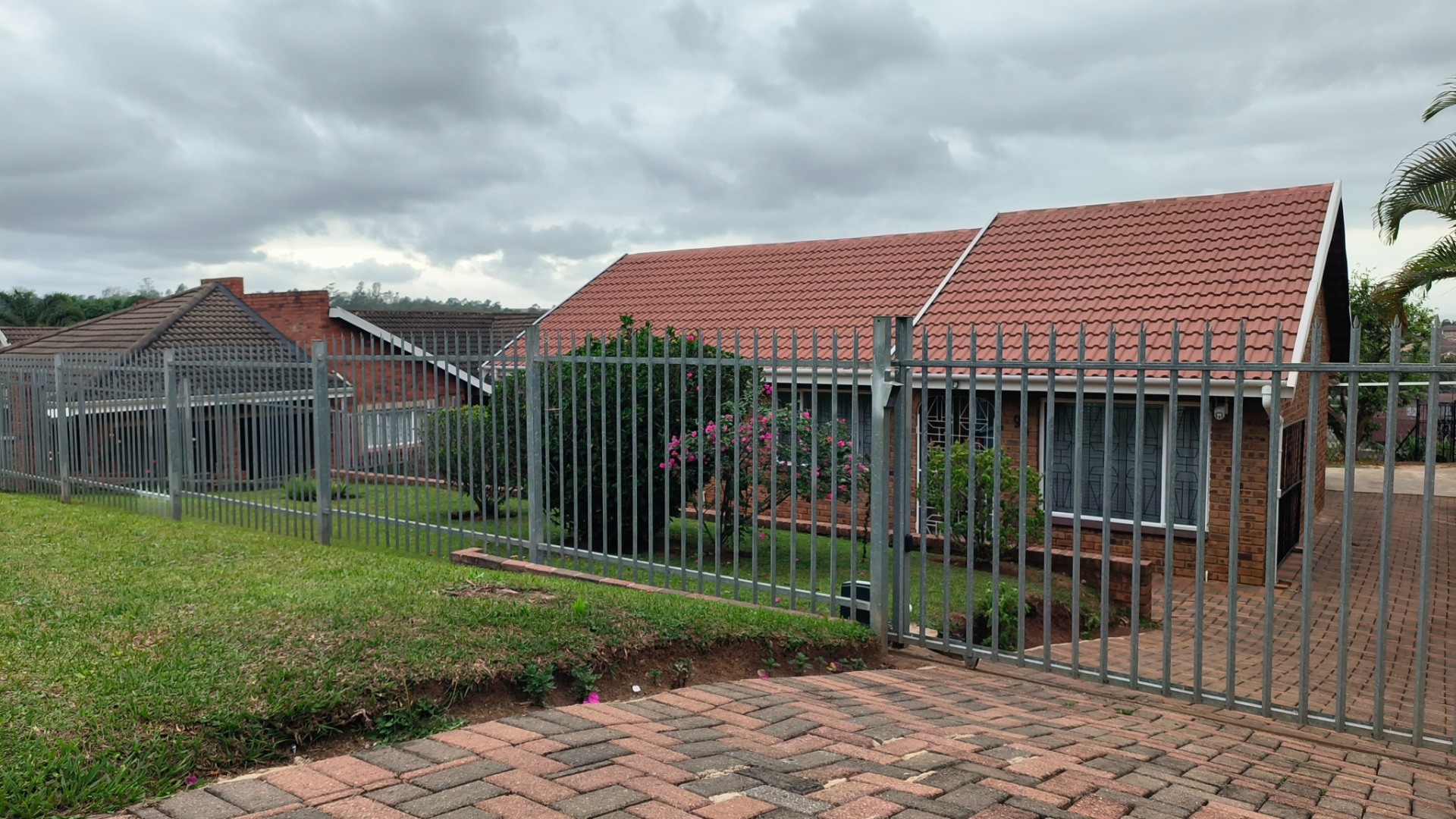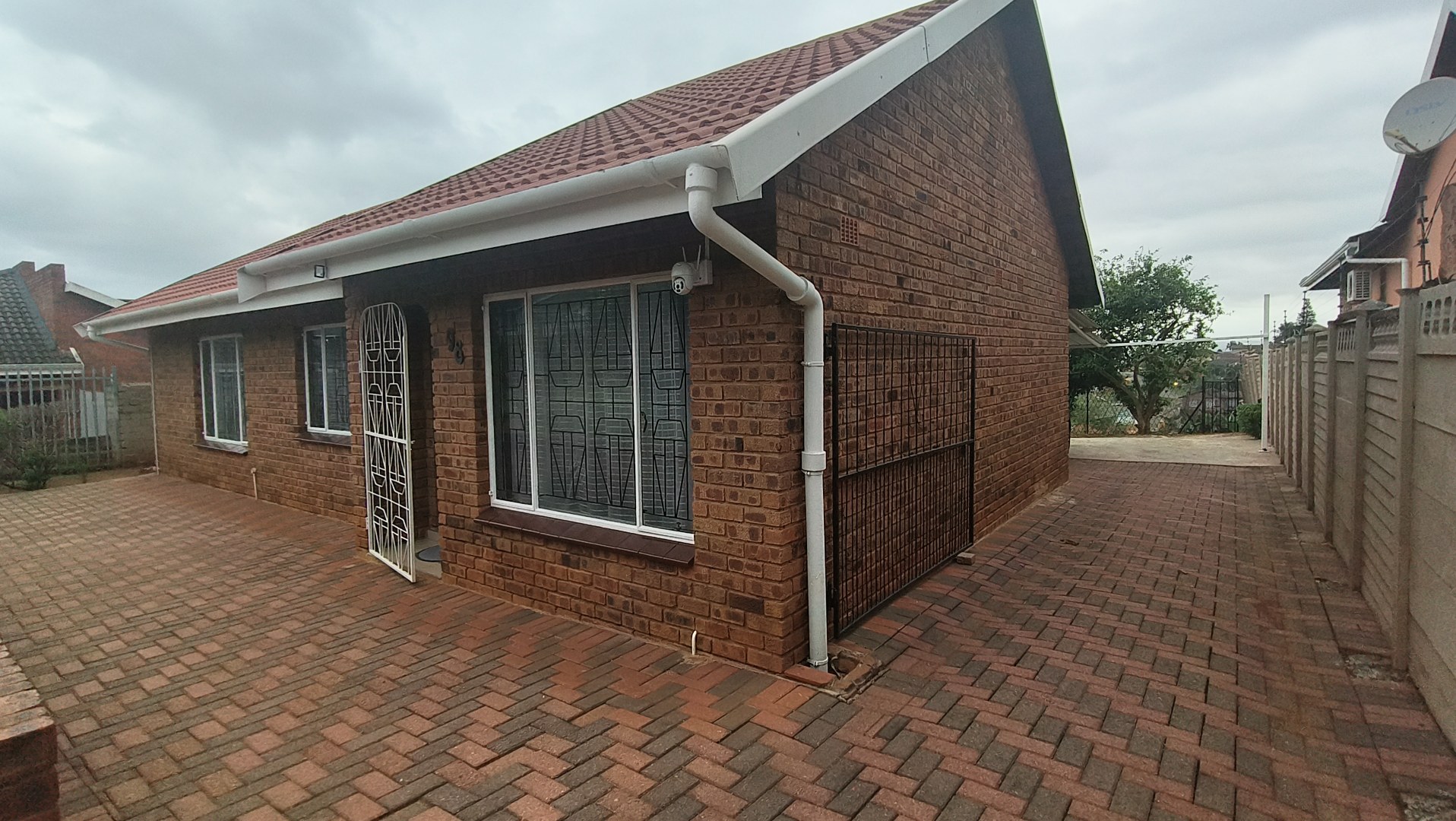 The property boasts a paved driveway and an established front garden, creating an inviting first impression. Enhanced security features, including a sturdy metal palisade fence, security gate, and visible cameras, ensure peace of mind from the moment you arrive. Step inside to discover a thoughtfully designed interior.