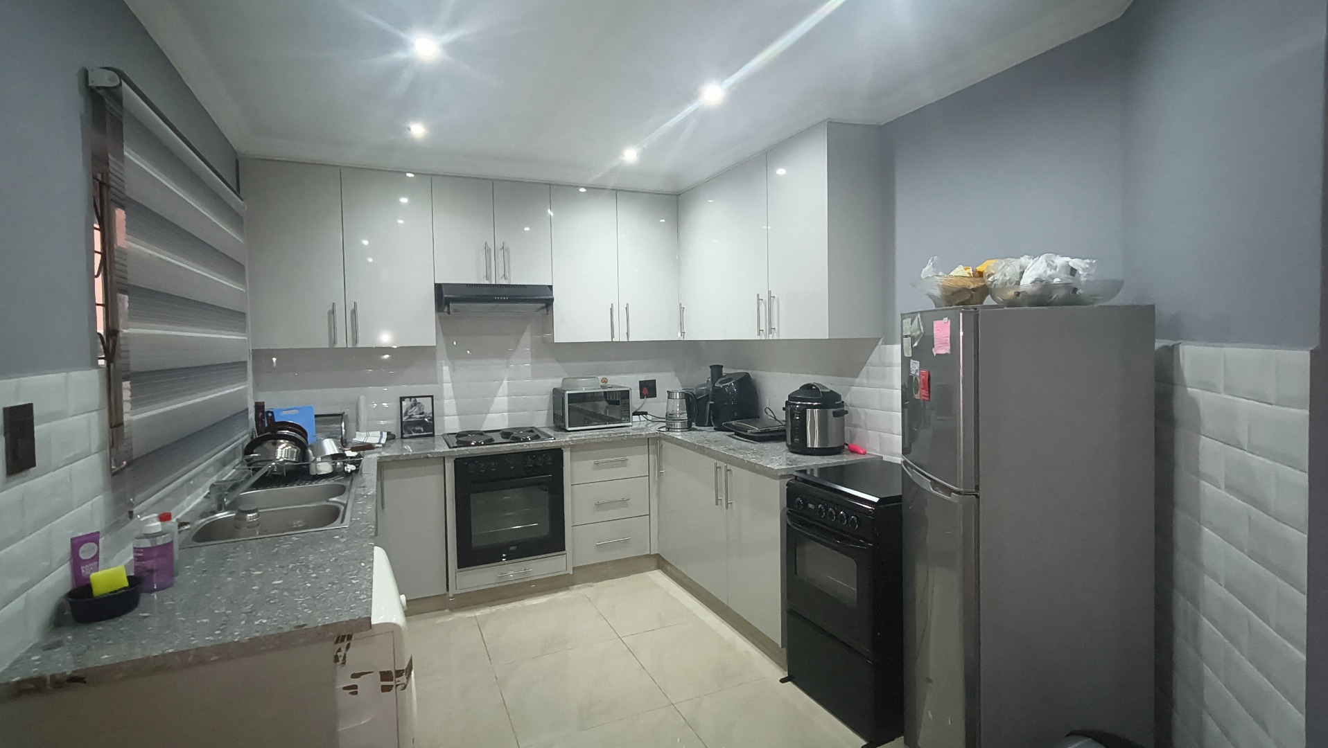 The modern kitchen is a highlight, featuring glossy white cabinetry, sleek grey walls, a tiled backsplash, and integrated appliances such as an oven, hob, and extractor fan, complemented by a convenient double sink.