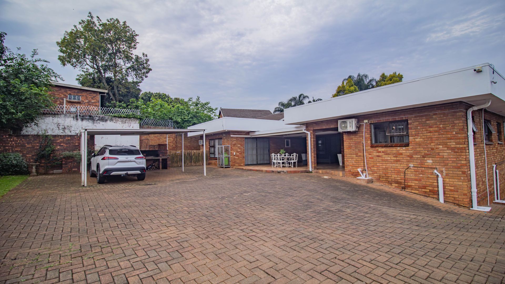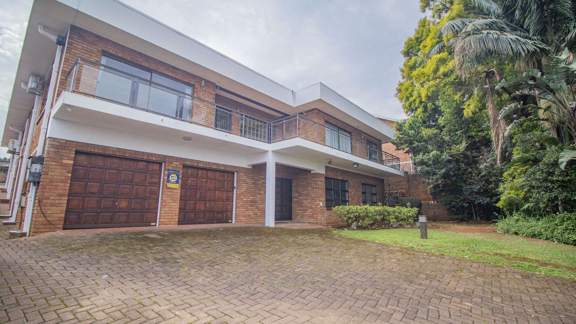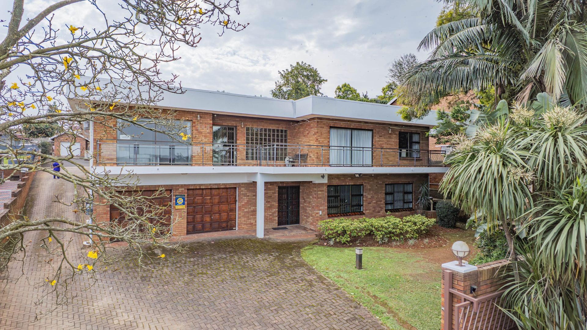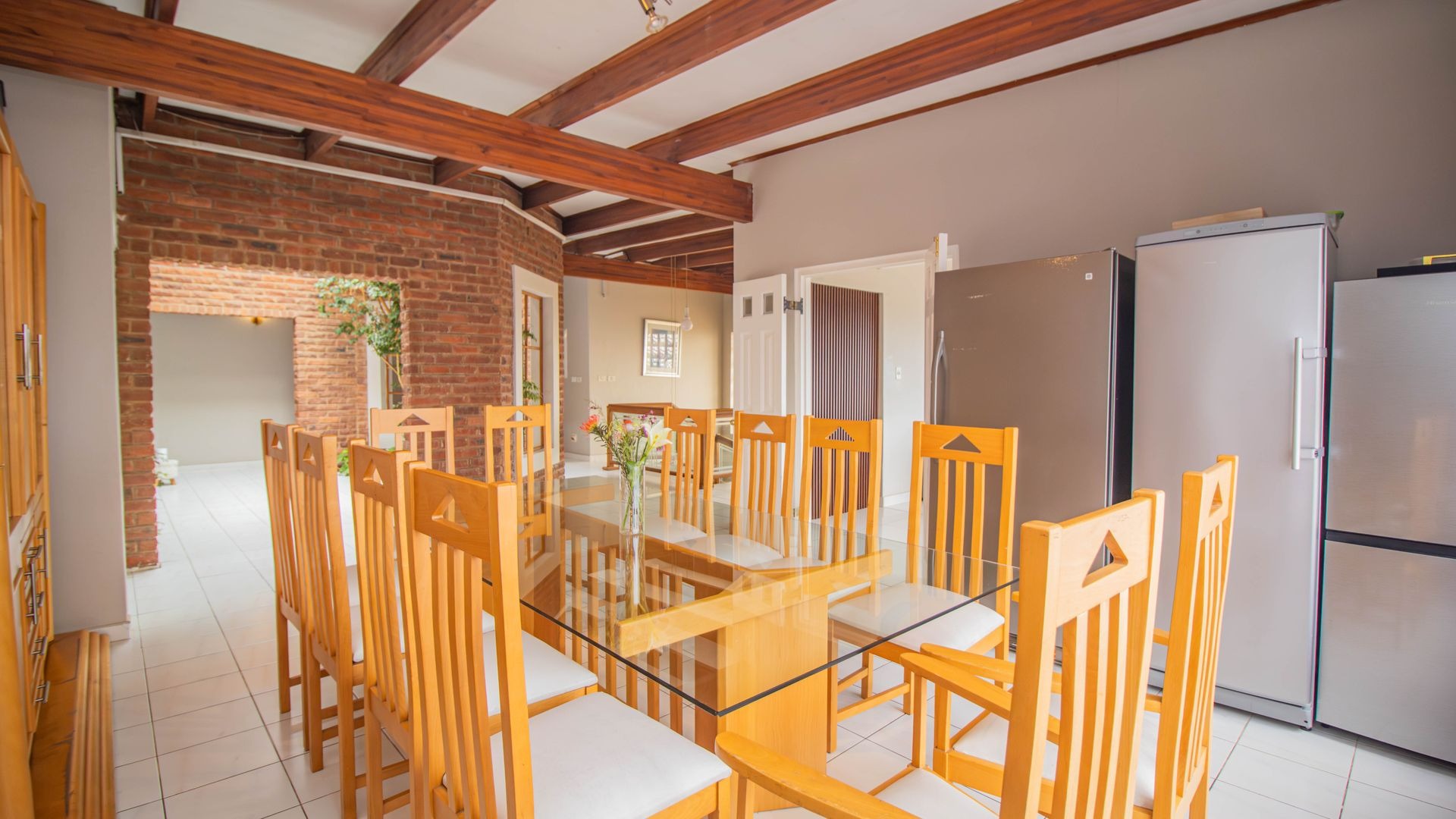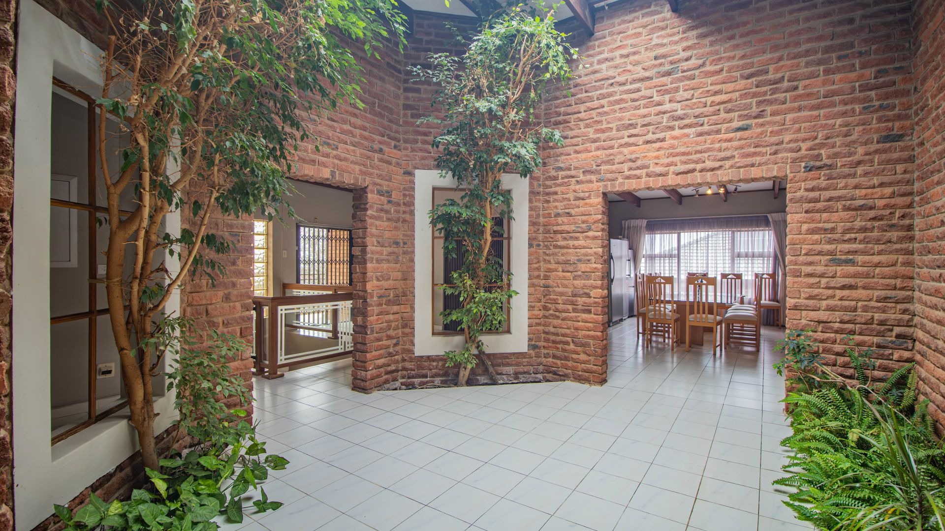 The double-storey facebrick Main Front House features a wrap-around Balcony, Double Garage, Double Carport, and space for 20 vehicles. Inside, there's a large basement room with an en-suite, luxurious living spaces, Indoor Zen Garden, TV Lounge with fireplace, and a gourmet Kitchen with granite tops. The Main House boasts 5 bedrooms (3 en-suite) and a guest loo.