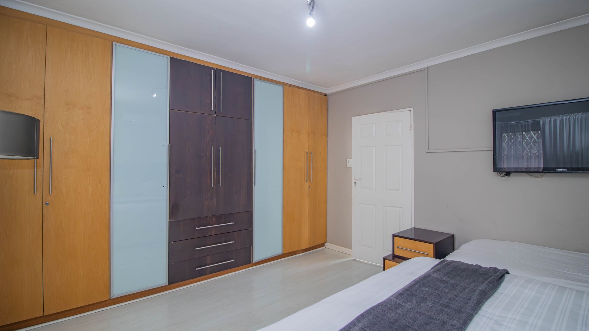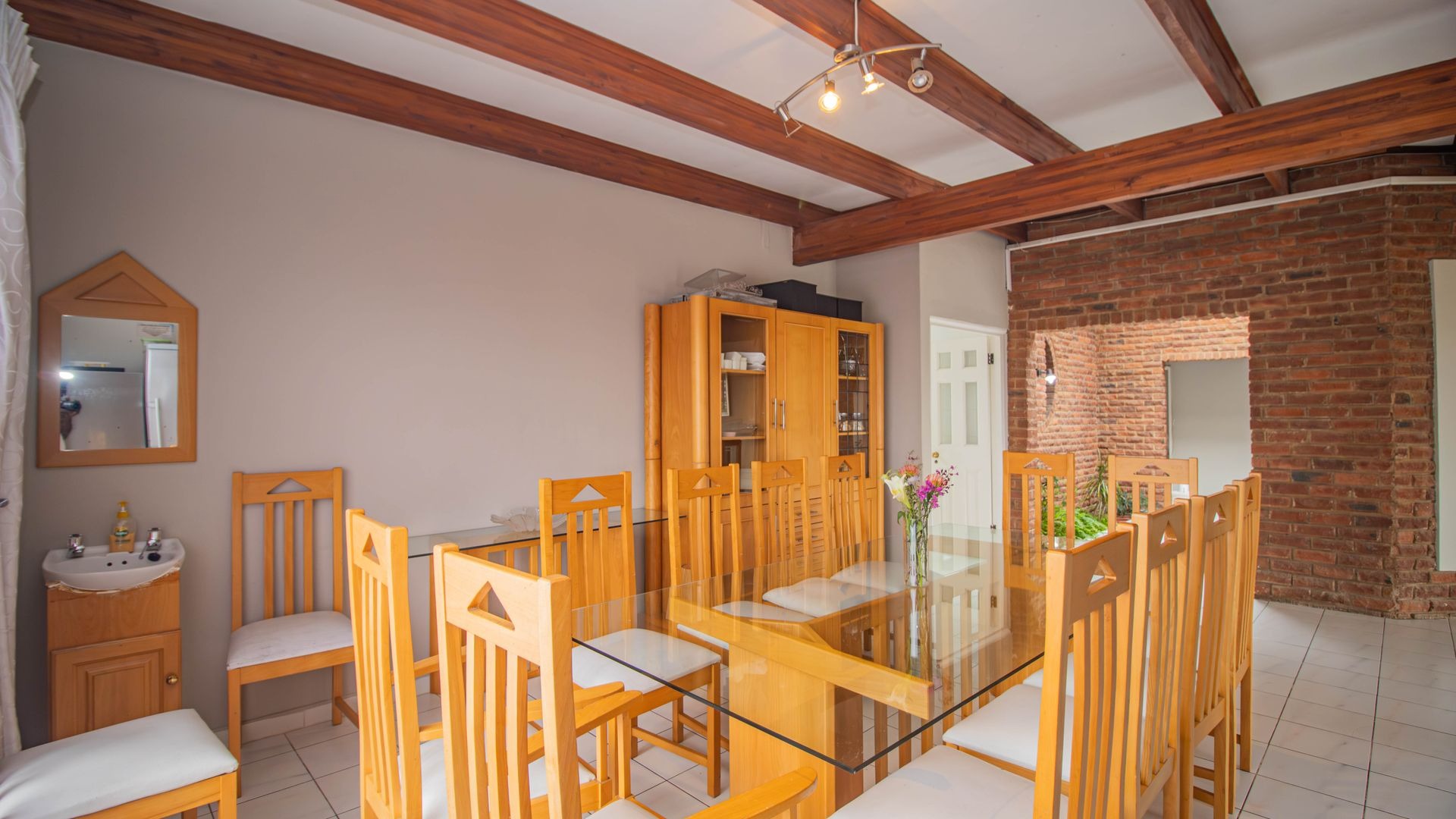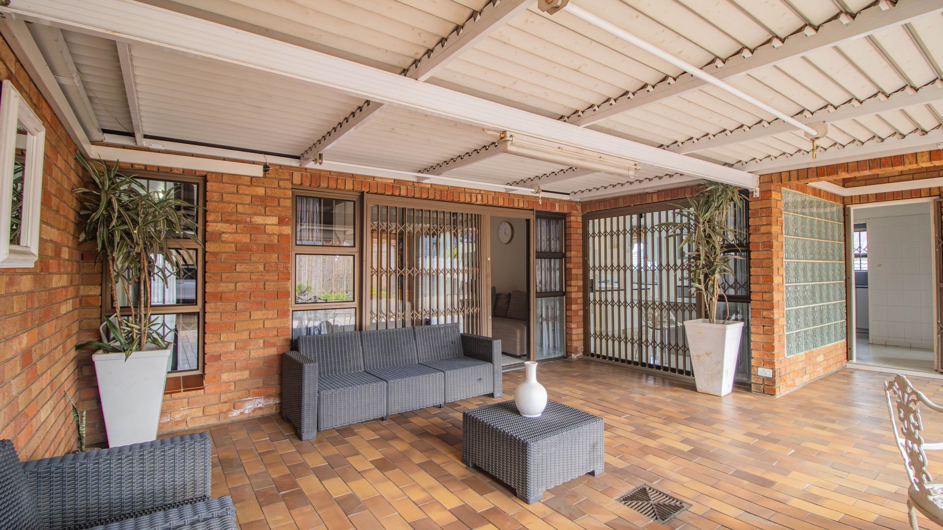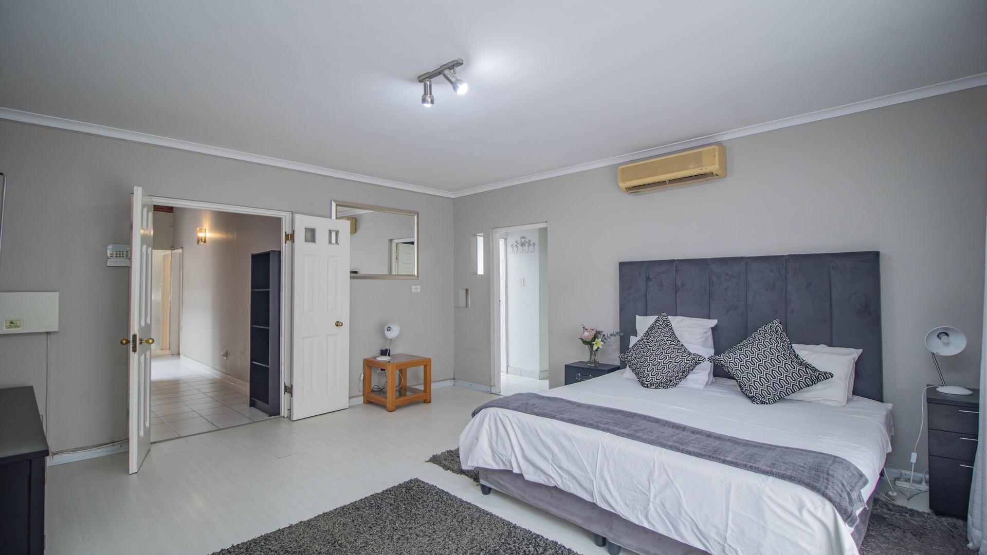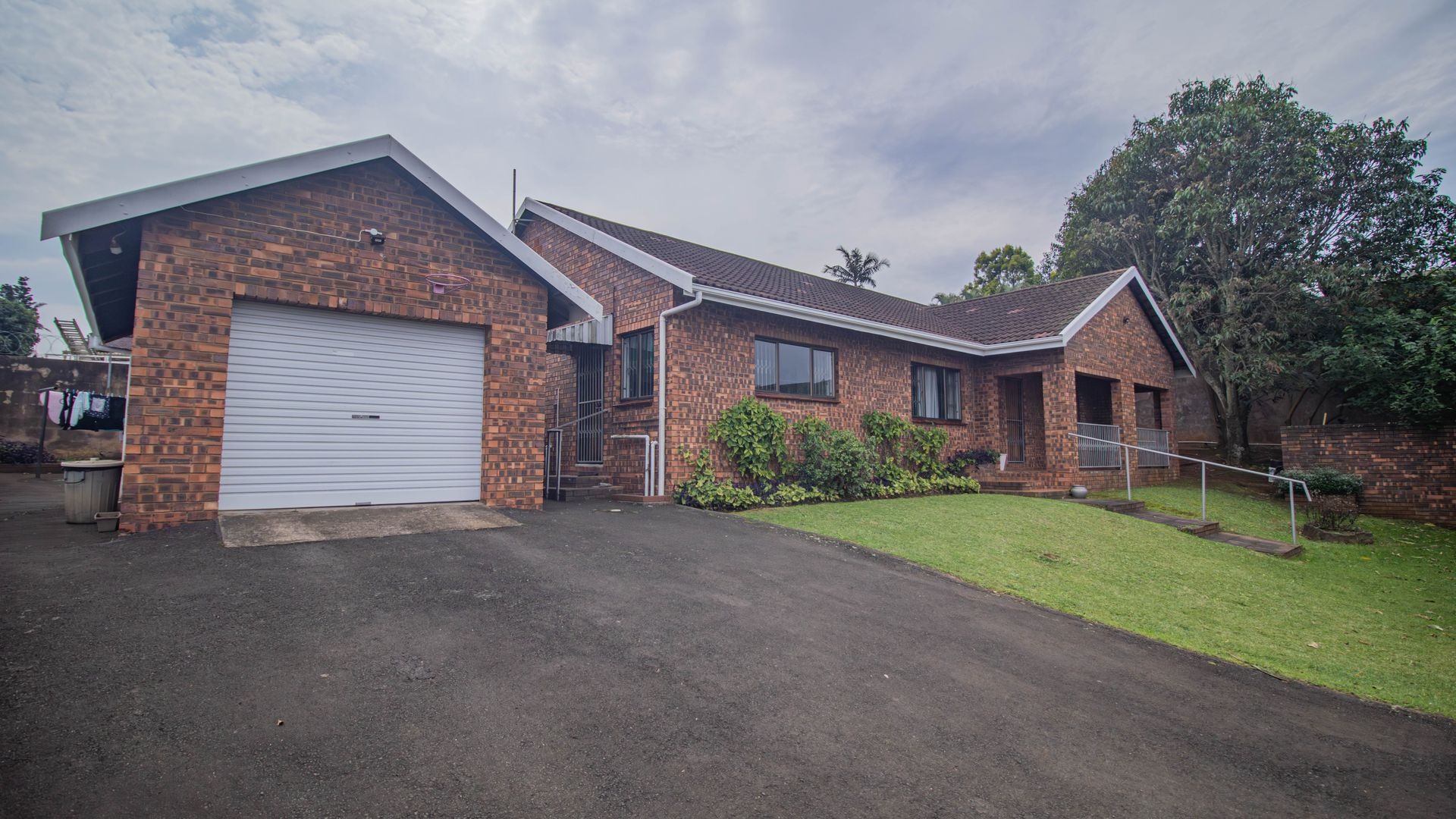 The double-storey facebrick Main Front House features a wrap-around Balcony, Double Garage, Double Carport, and space for 20 vehicles. Inside, there's a large basement room with an en-suite, luxurious living spaces, Indoor Zen Garden, TV Lounge with fireplace, and a gourmet Kitchen with granite tops. The Main House boasts 5 bedrooms (3 en-suite) and a guest loo.