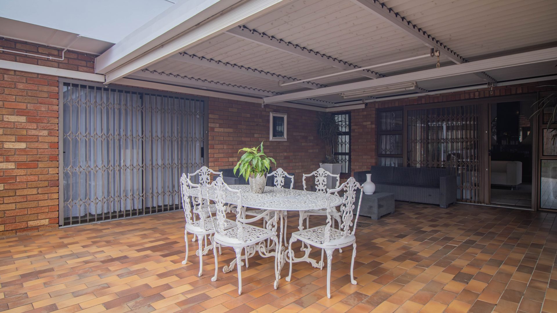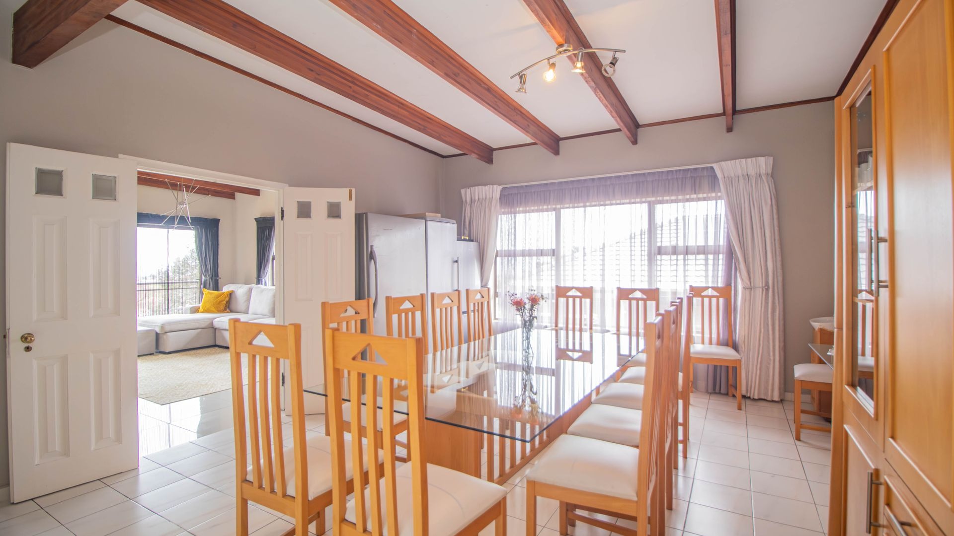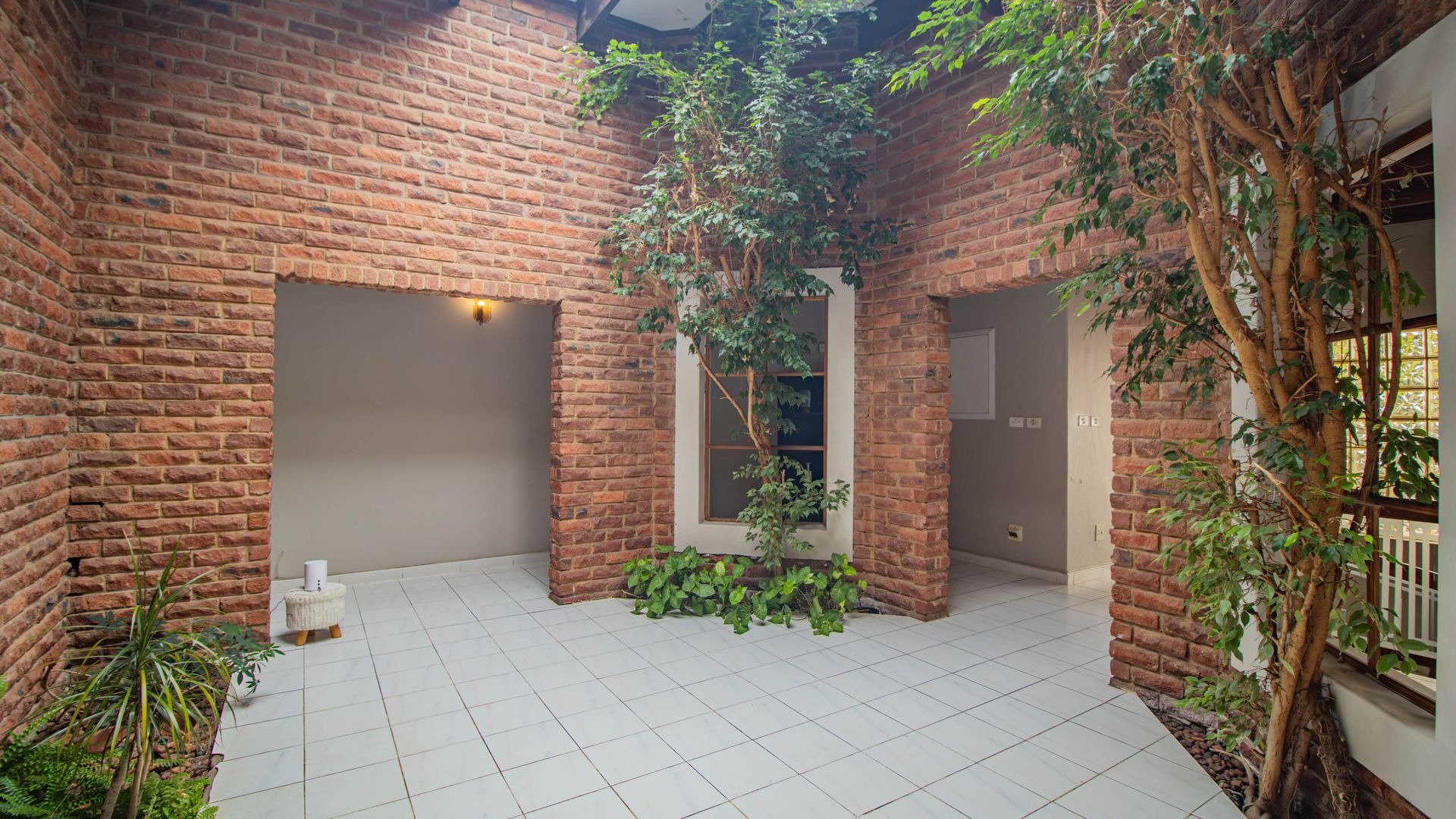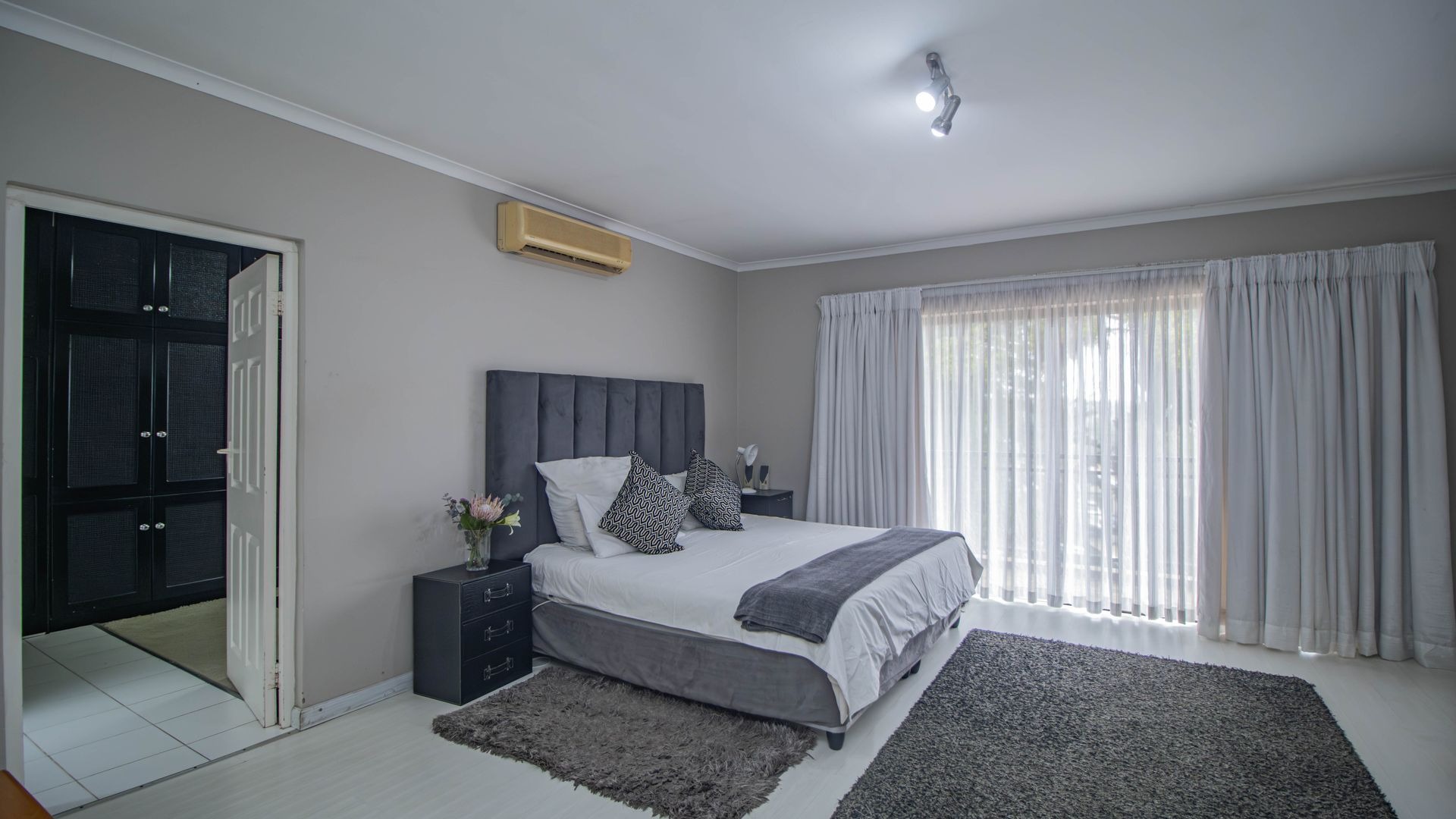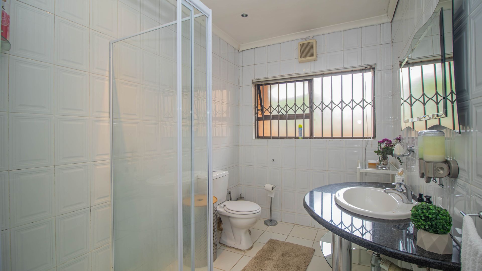 The double-storey facebrick Main Front House features a wrap-around Balcony, Double Garage, Double Carport, and space for 20 vehicles. Inside, there's a large basement room with an en-suite, luxurious living spaces, Indoor Zen Garden, TV Lounge with fireplace, and a gourmet Kitchen with granite tops. The Main House boasts 5 bedrooms (3 en-suite) and a guest loo.