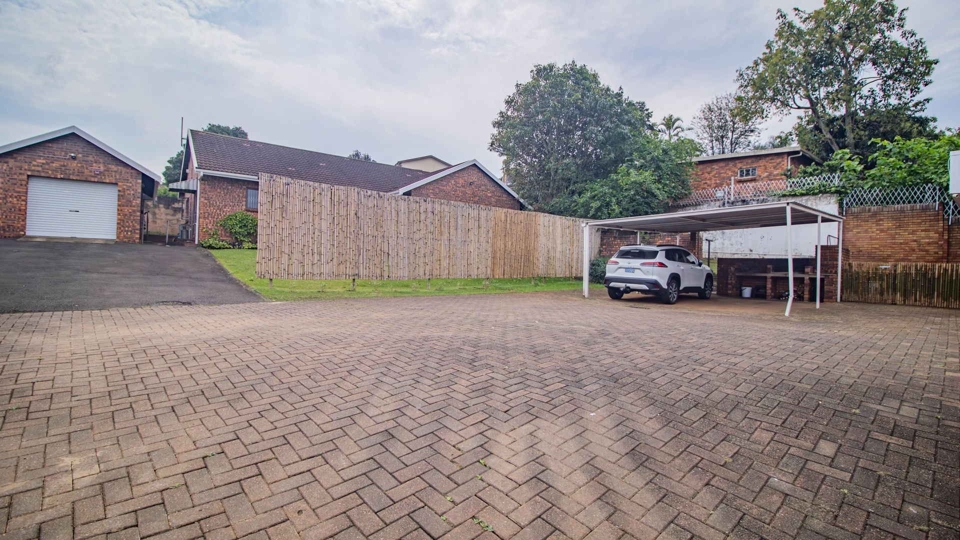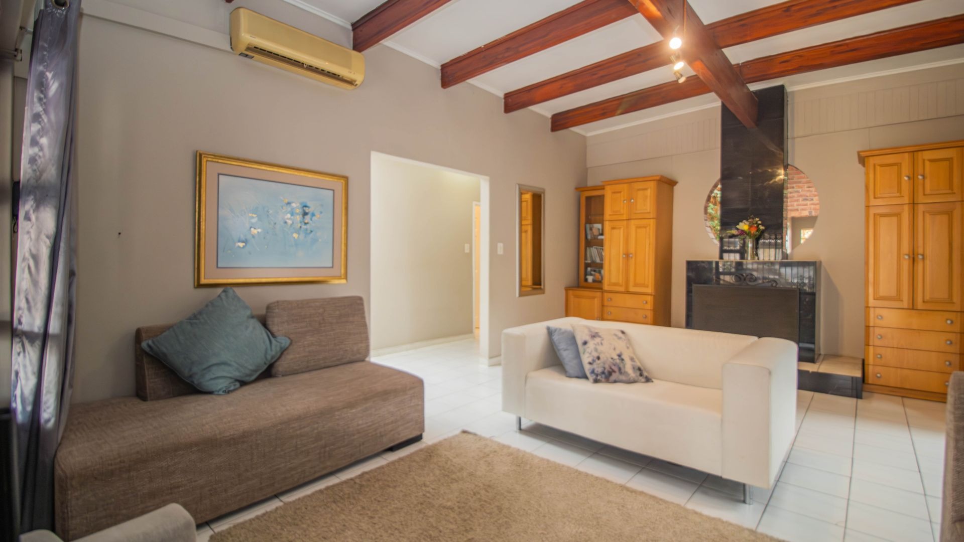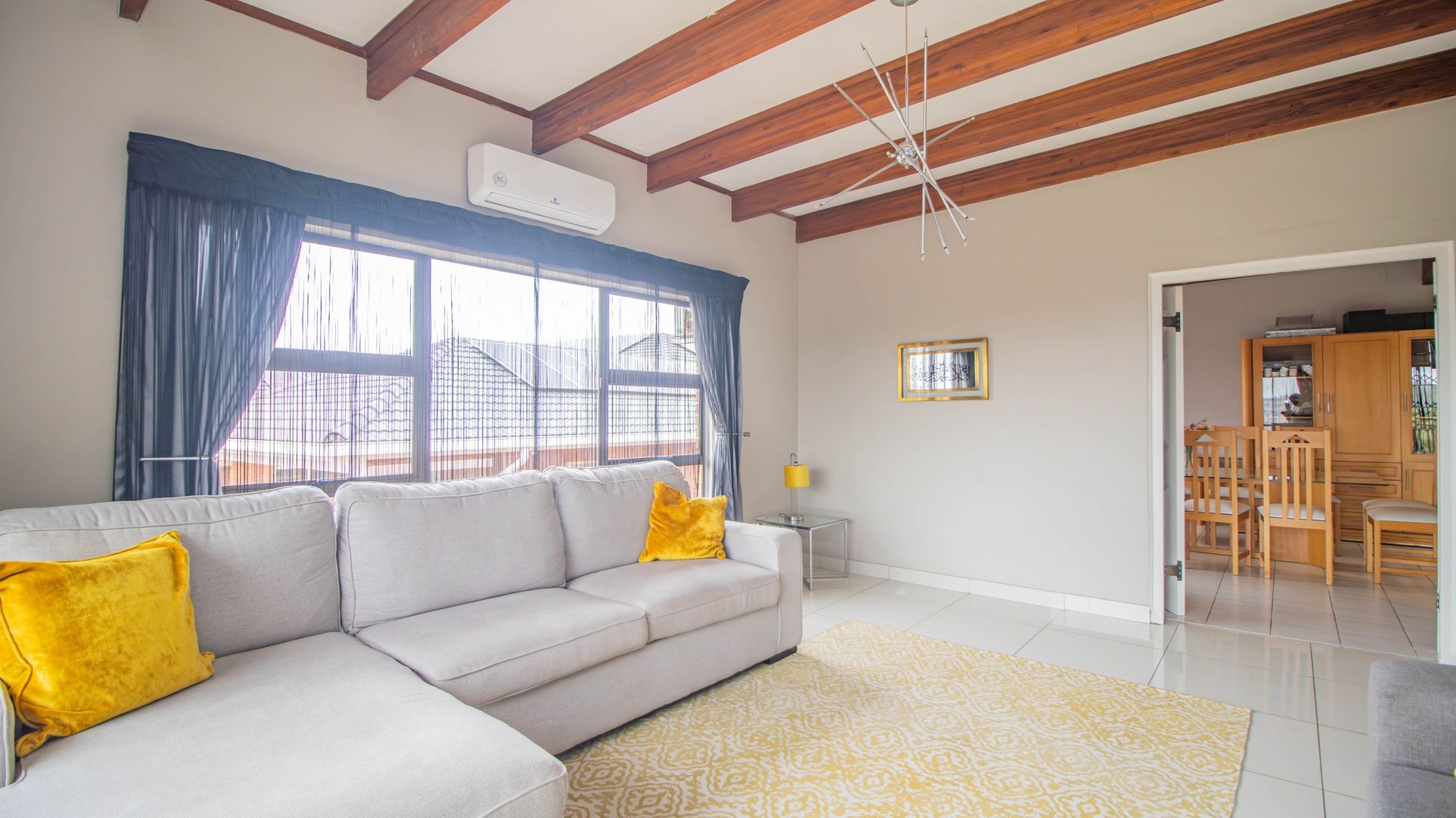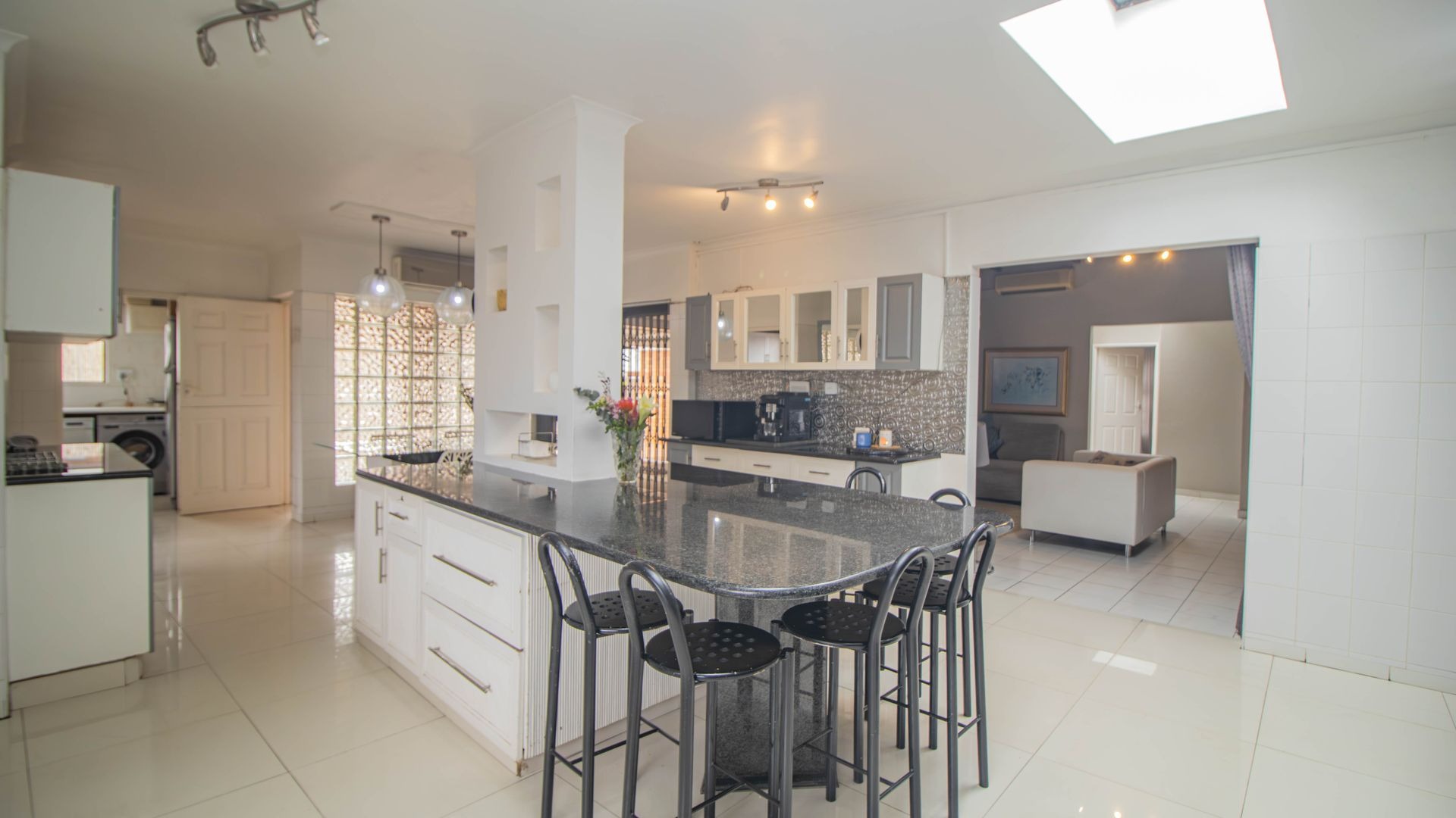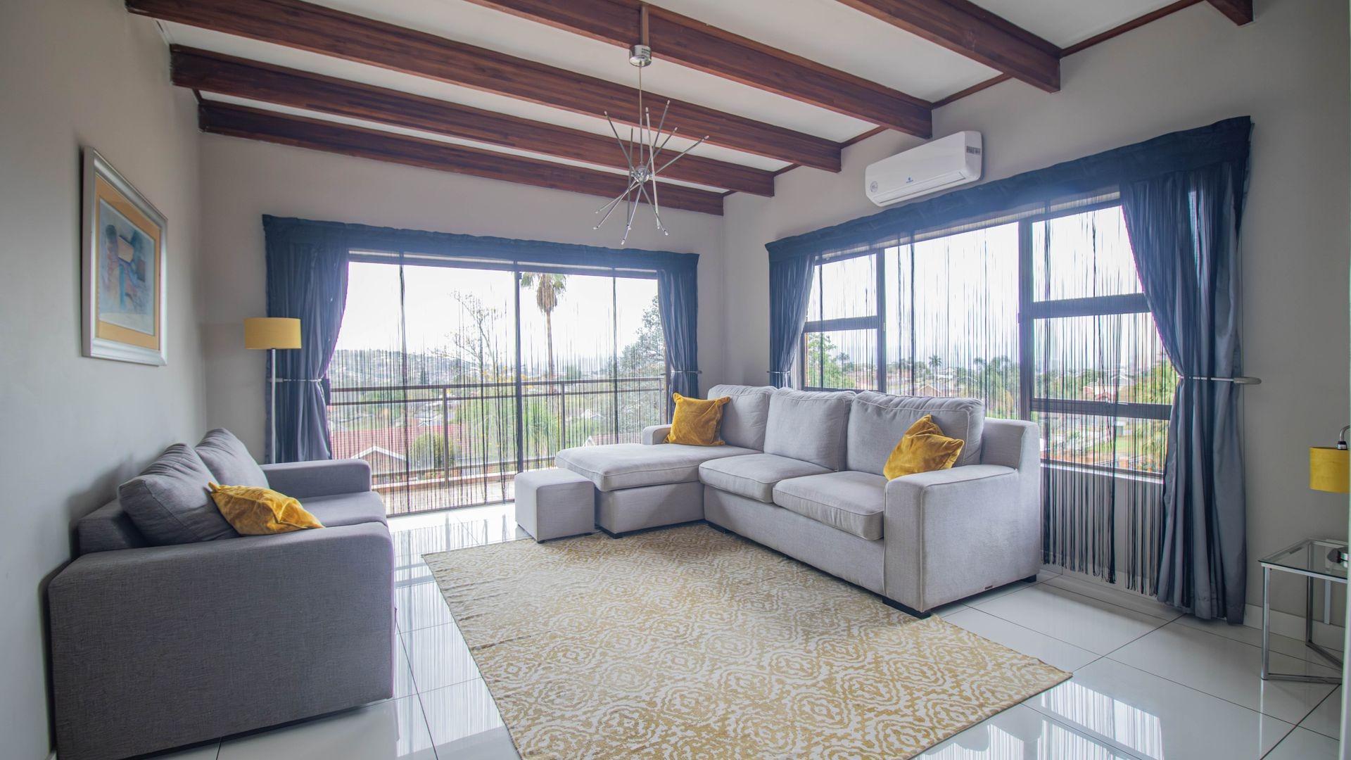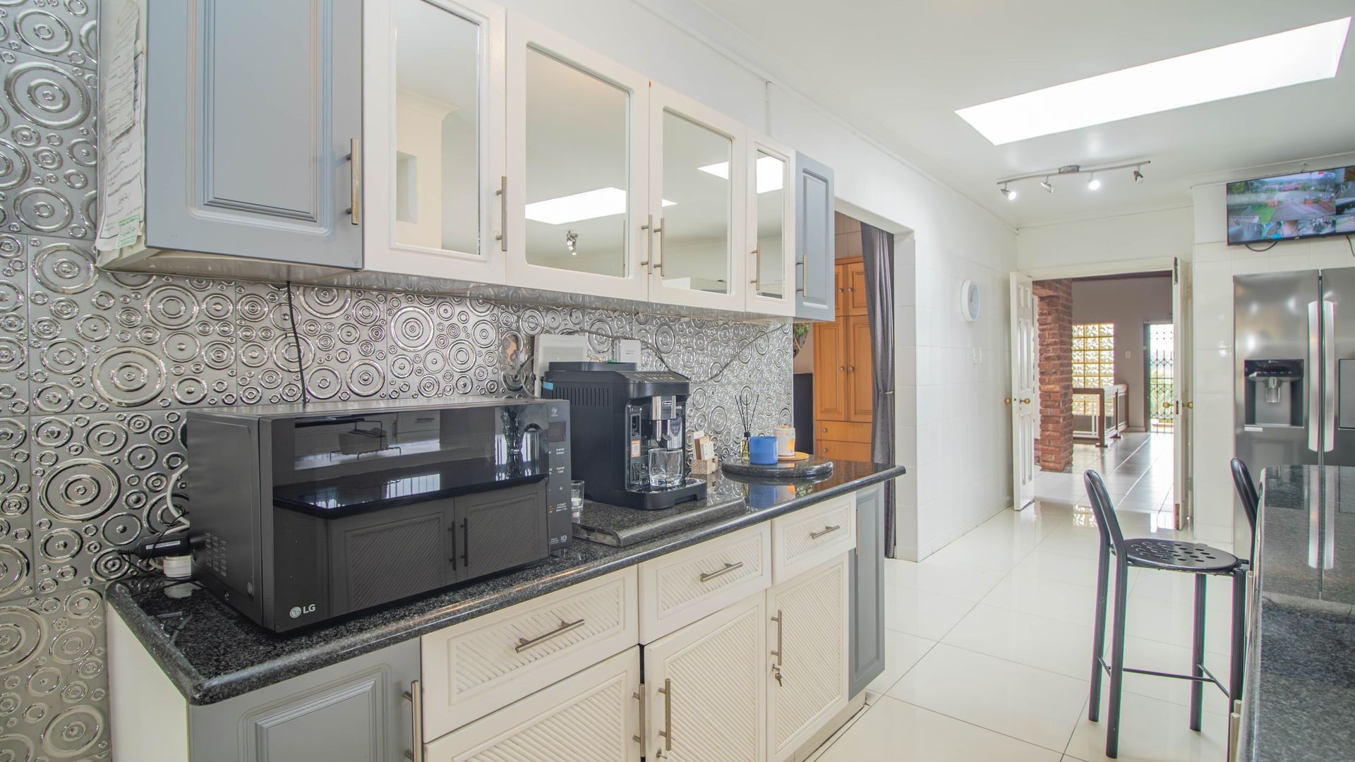 The double-storey facebrick Main Front House features a wrap-around Balcony, Double Garage, Double Carport, and space for 20 vehicles. Inside, there's a large basement room with an en-suite, luxurious living spaces, Indoor Zen Garden, TV Lounge with fireplace, and a gourmet Kitchen with granite tops. The Main House boasts 5 bedrooms (3 en-suite) and a guest loo.