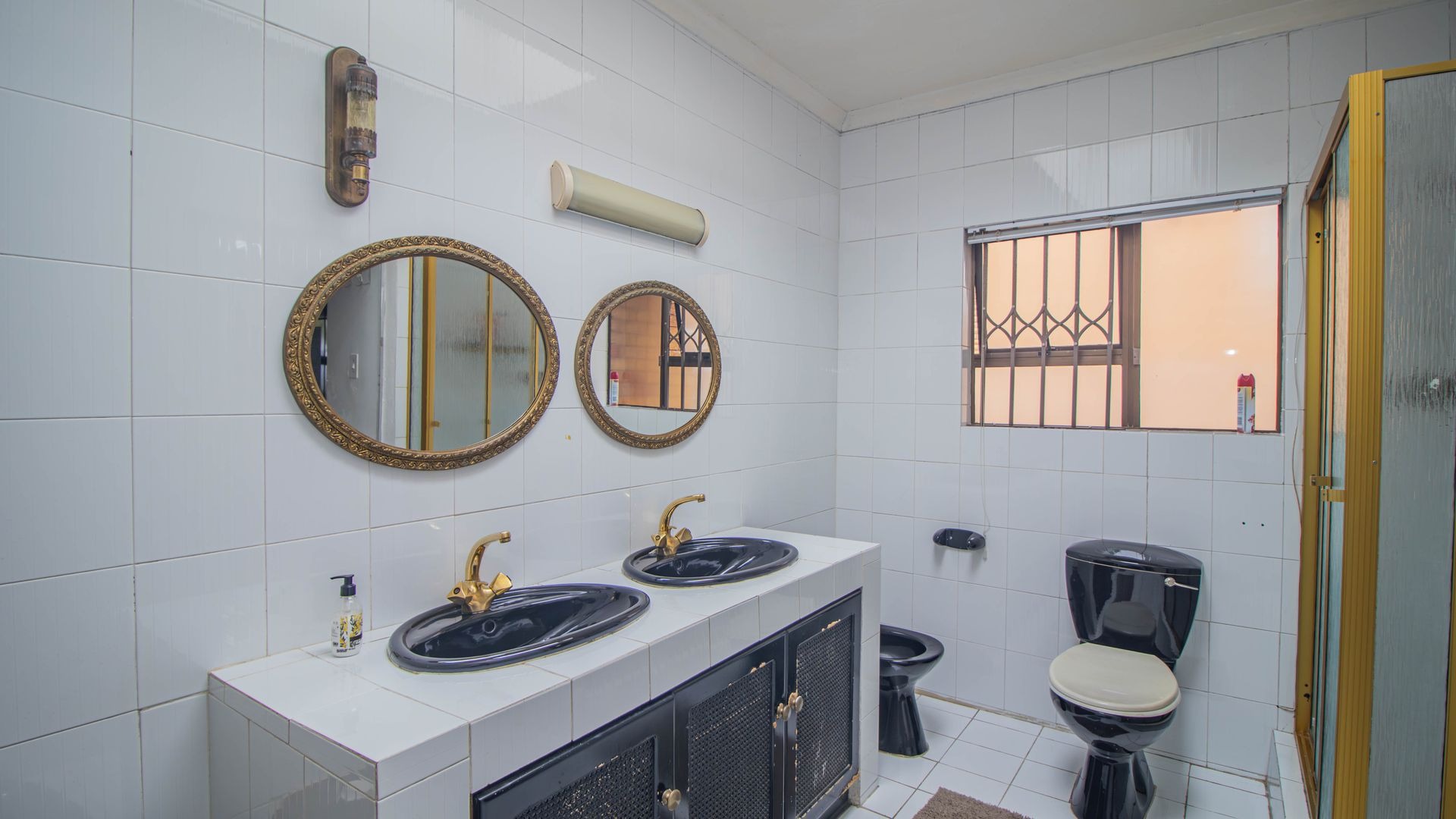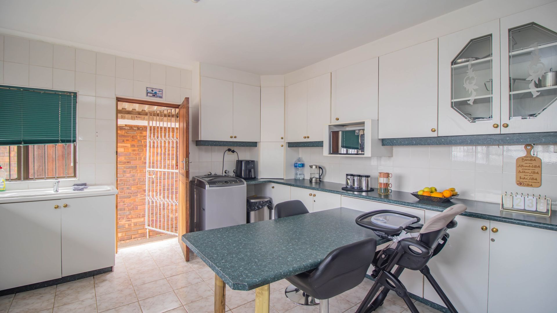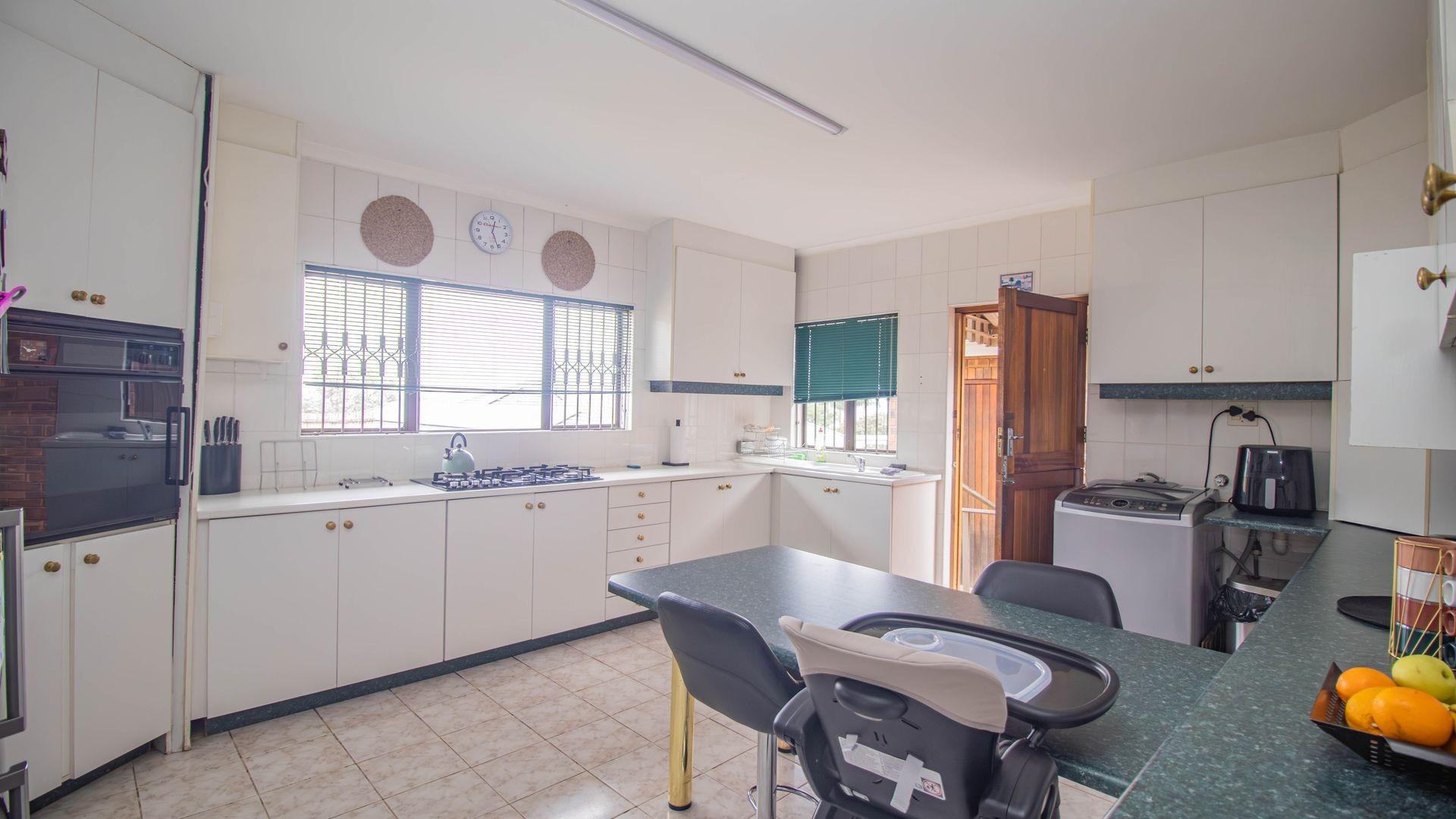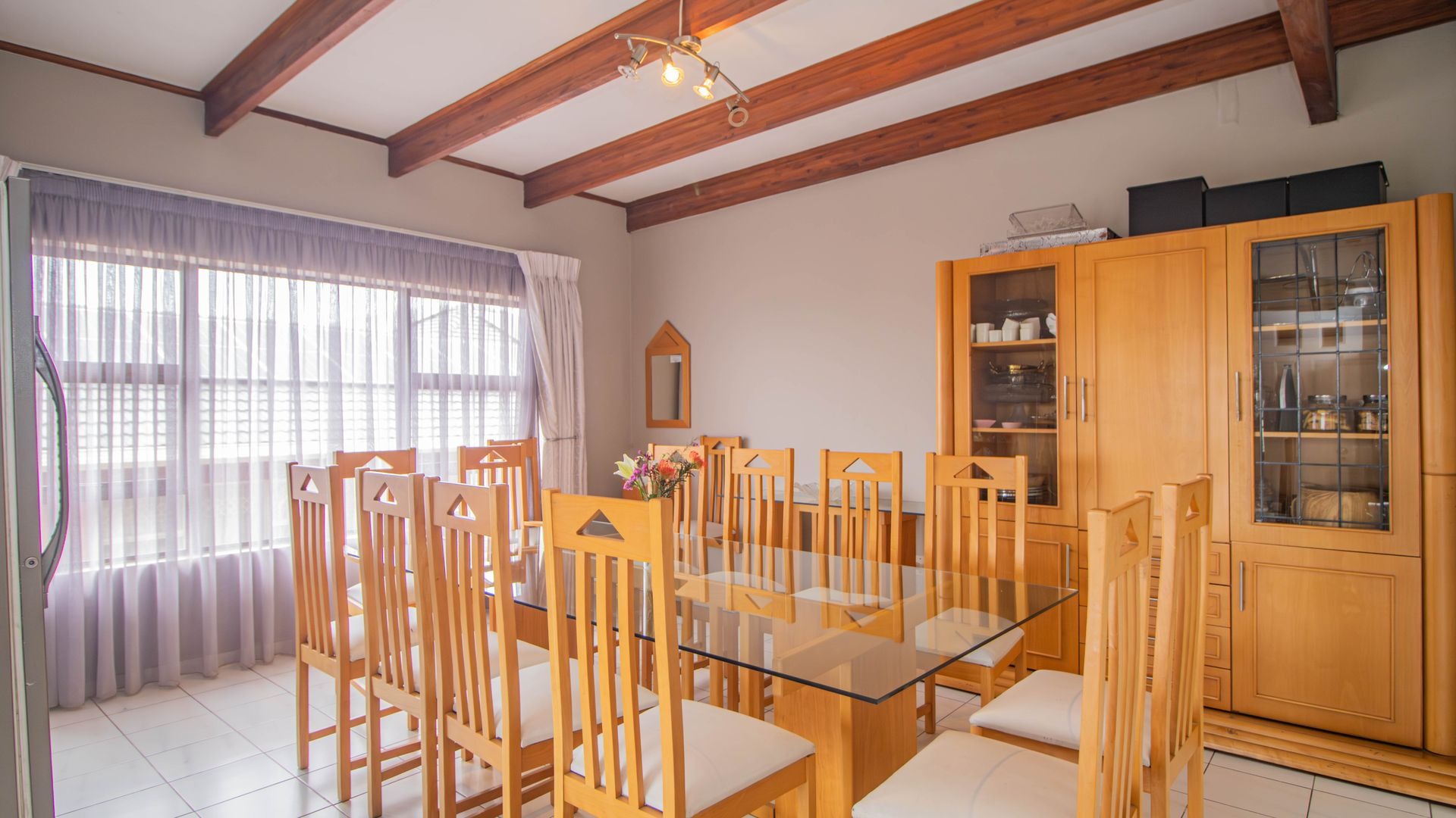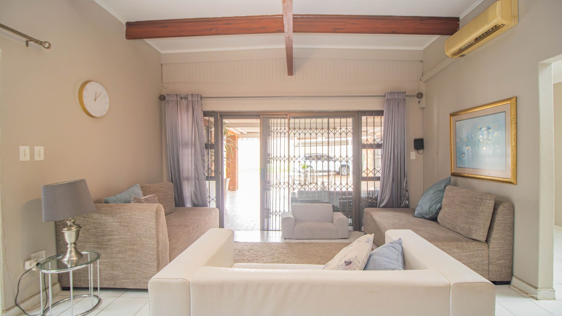 The double-storey facebrick Main Front House features a wrap-around Balcony, Double Garage, Double Carport, and space for 20 vehicles. Inside, there's a large basement room with an en-suite, luxurious living spaces, Indoor Zen Garden, TV Lounge with fireplace, and a gourmet Kitchen with granite tops. The Main House boasts 5 bedrooms (3 en-suite) and a guest loo.