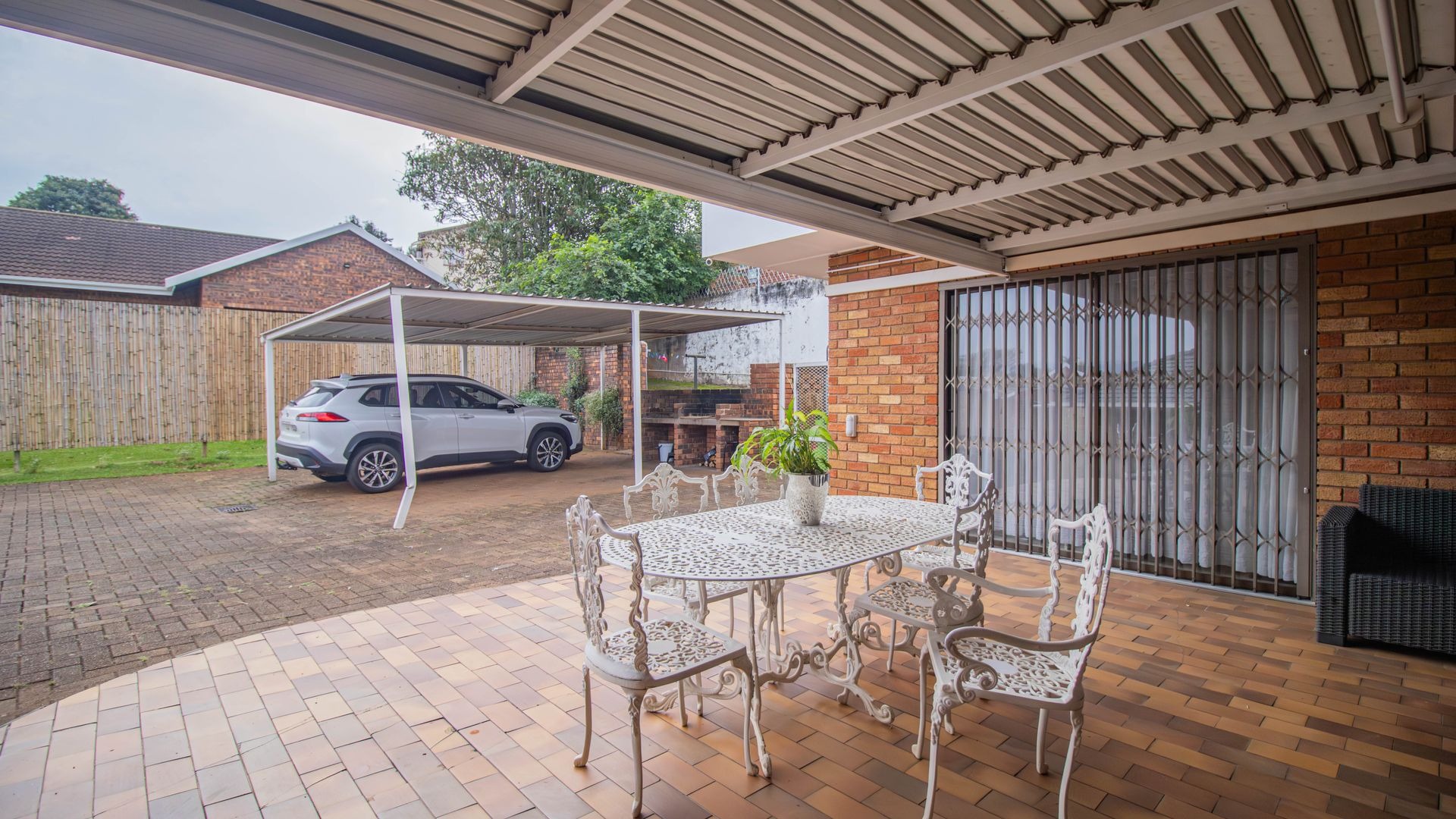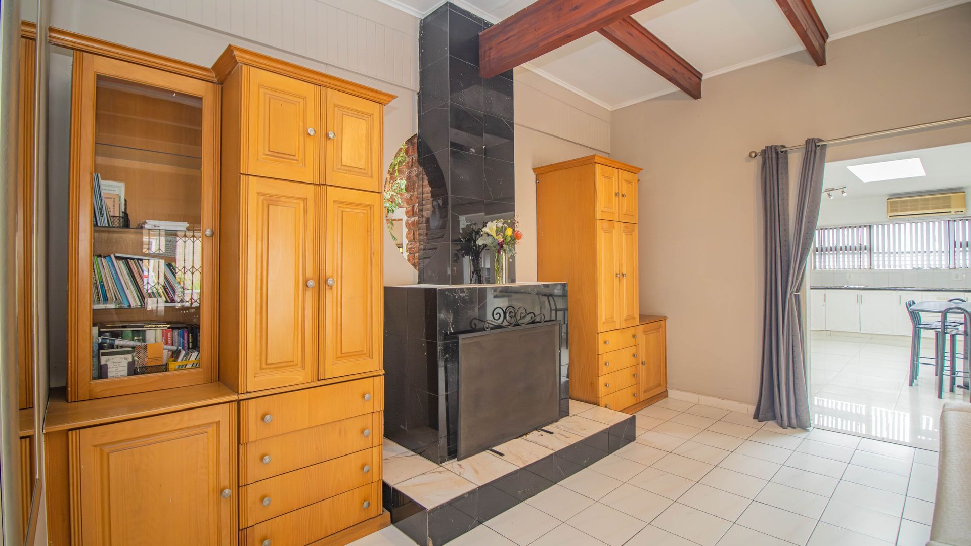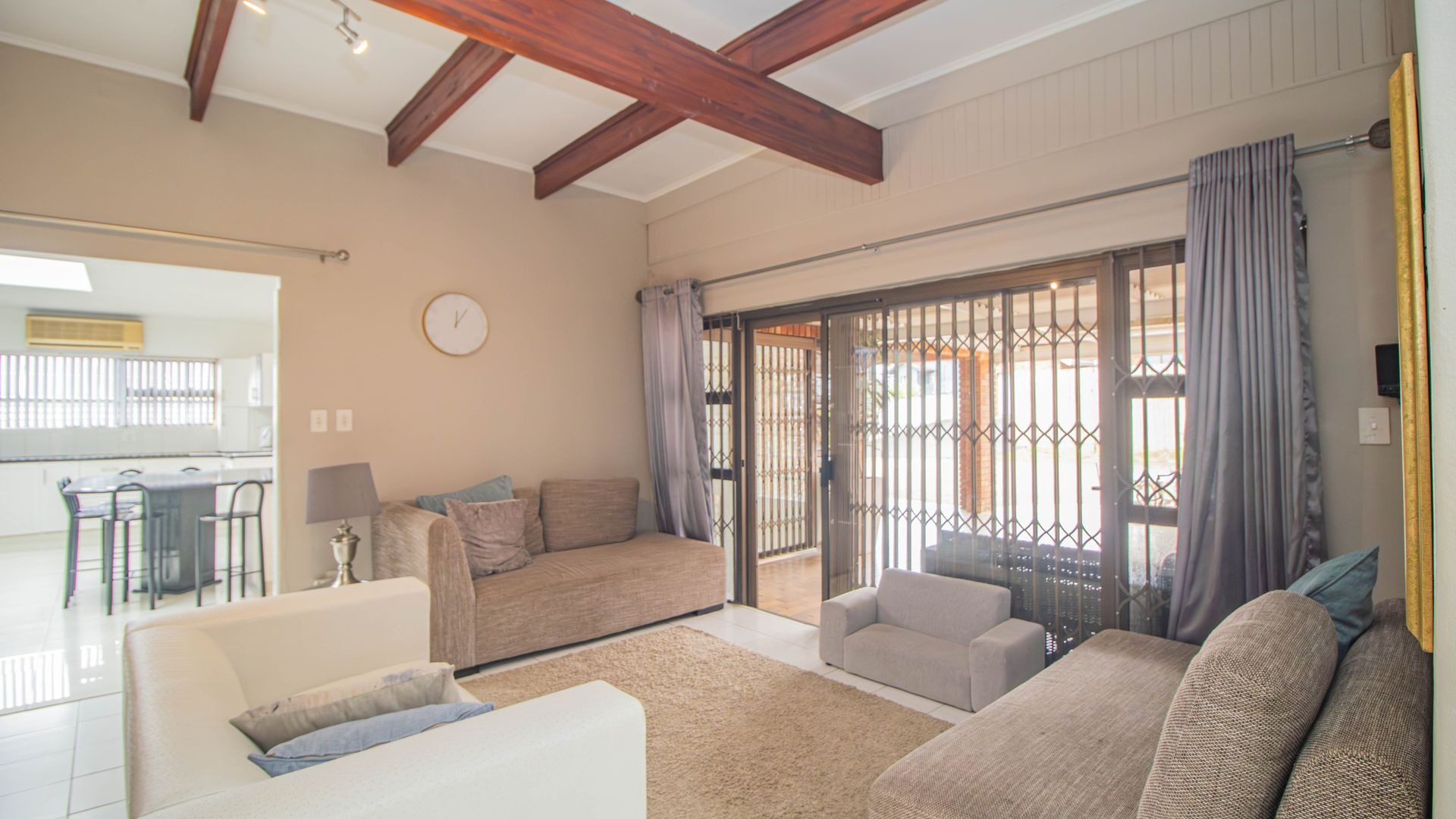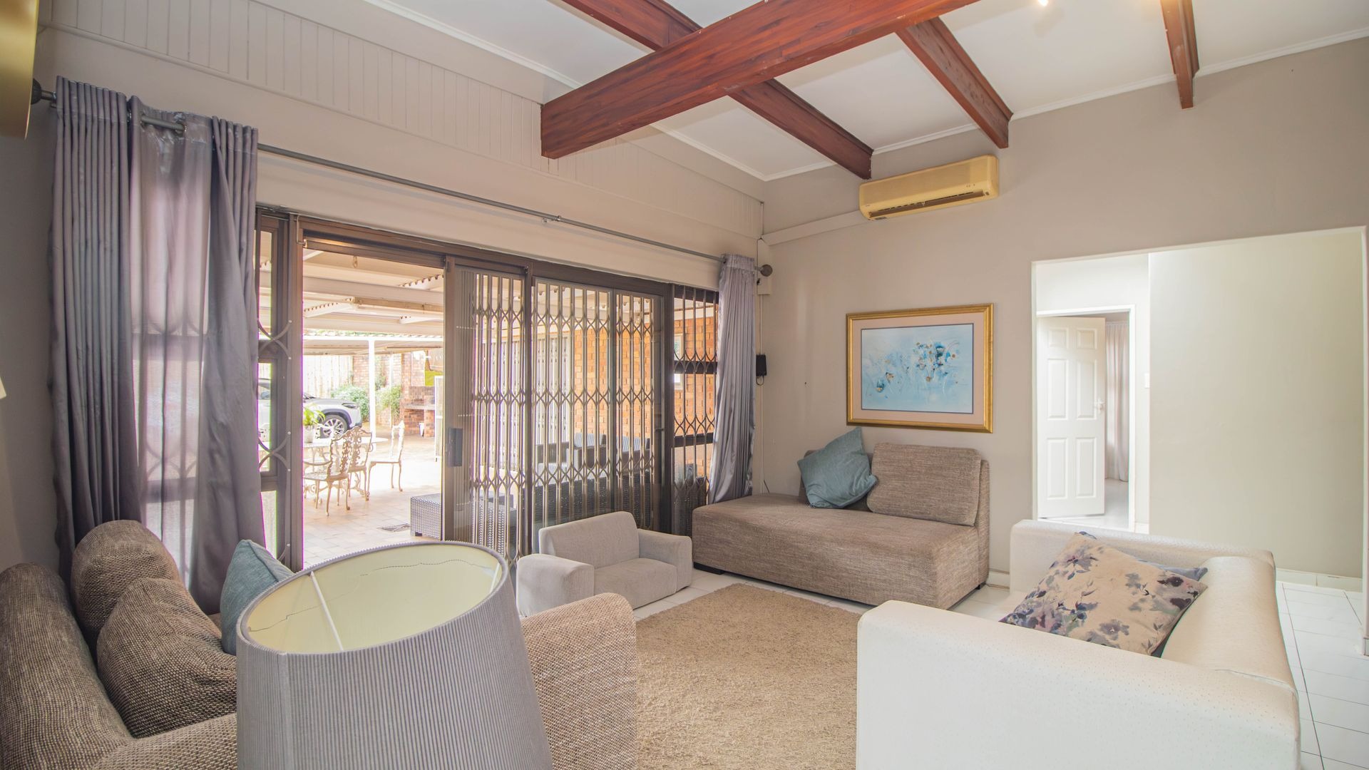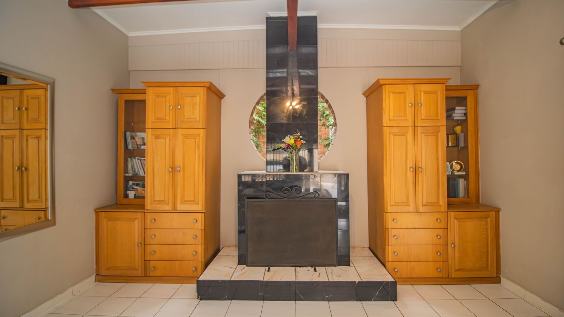 The double-storey facebrick Main Front House features a wrap-around Balcony, Double Garage, Double Carport, and space for 20 vehicles. Inside, there's a large basement room with an en-suite, luxurious living spaces, Indoor Zen Garden, TV Lounge with fireplace, and a gourmet Kitchen with granite tops. The Main House boasts 5 bedrooms (3 en-suite) and a guest loo.