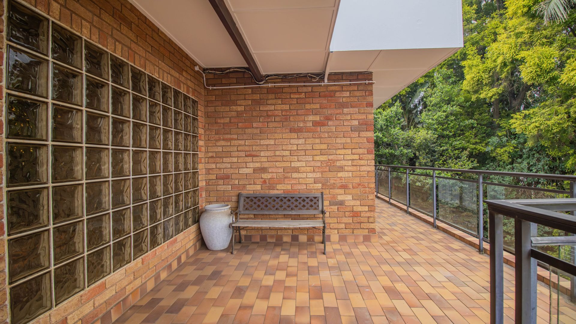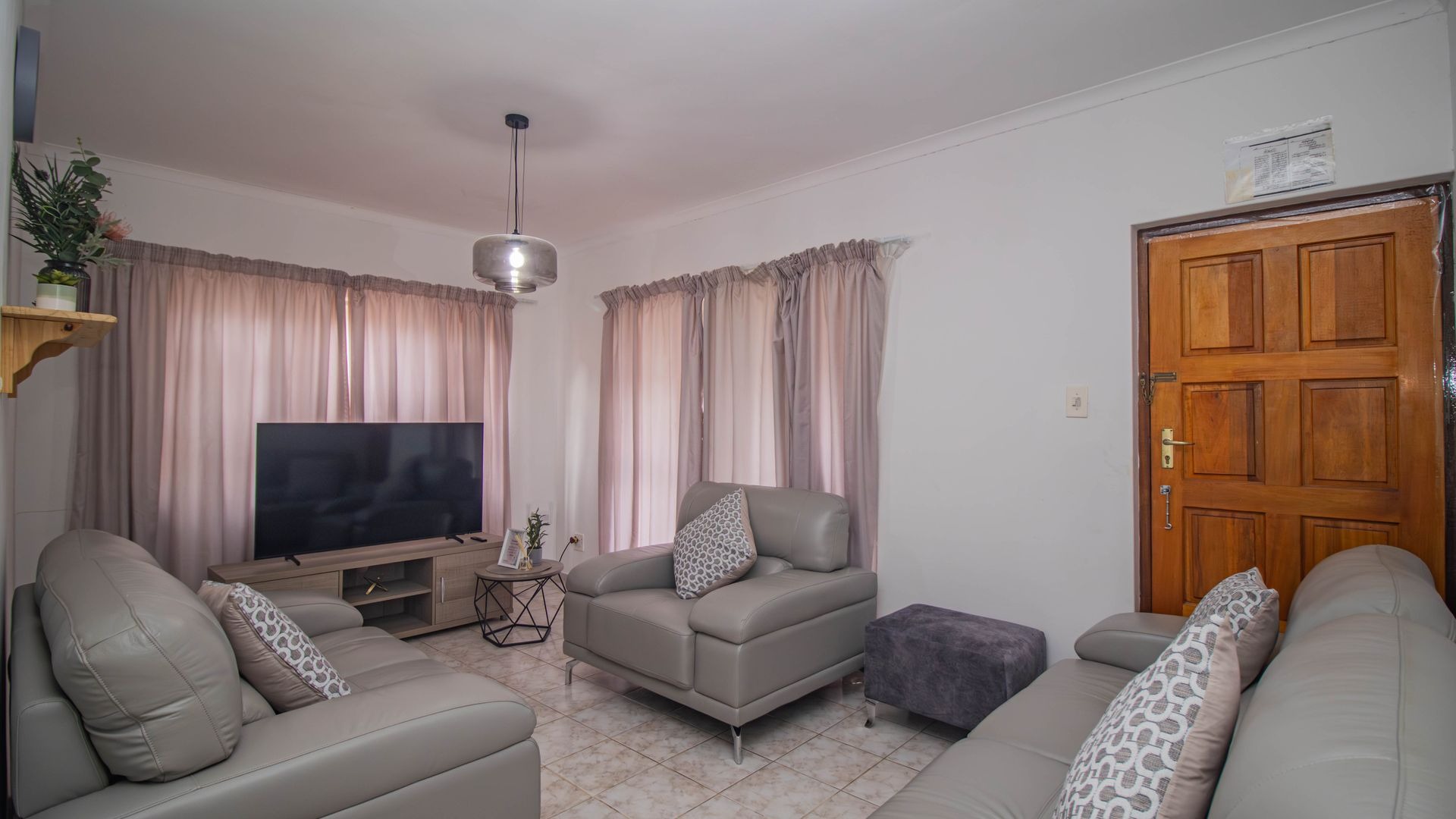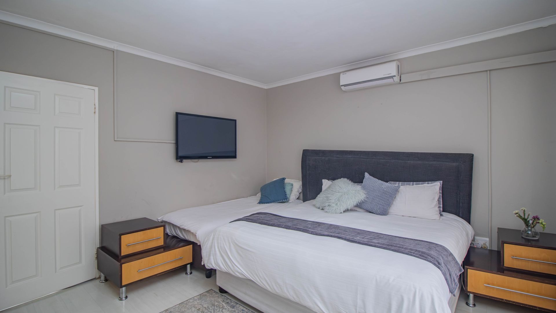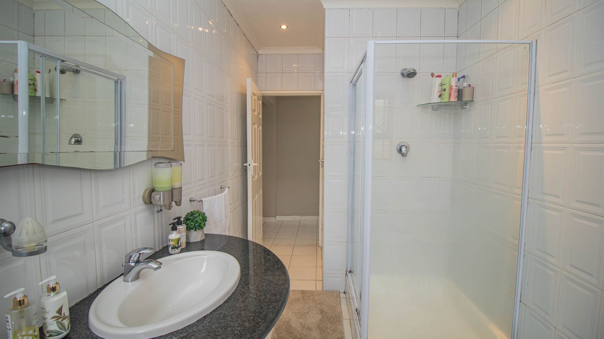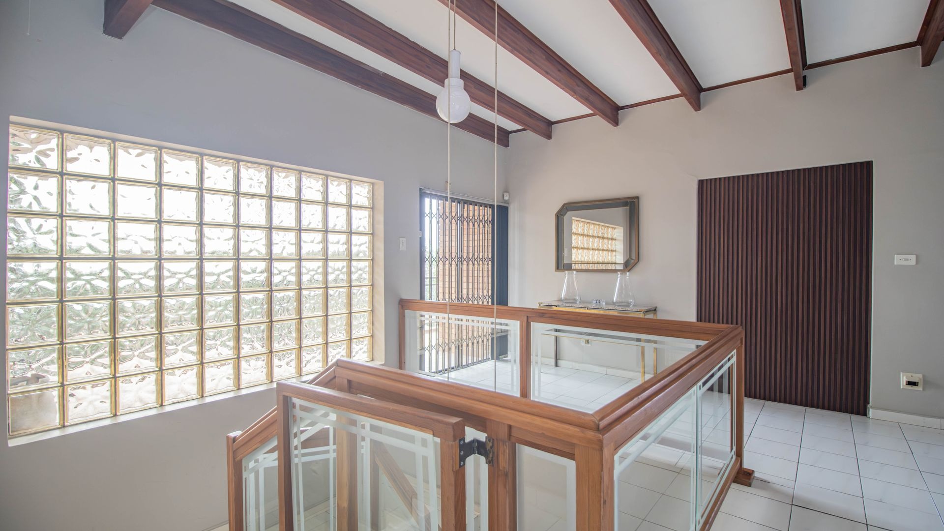 The double-storey facebrick Main Front House features a wrap-around Balcony, Double Garage, Double Carport, and space for 20 vehicles. Inside, there's a large basement room with an en-suite, luxurious living spaces, Indoor Zen Garden, TV Lounge with fireplace, and a gourmet Kitchen with granite tops. The Main House boasts 5 bedrooms (3 en-suite) and a guest loo.