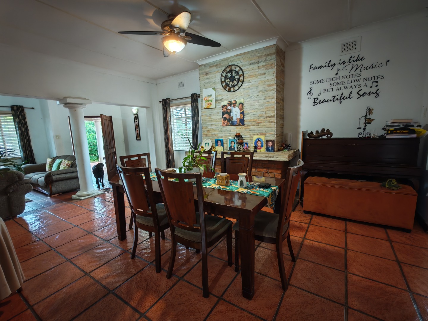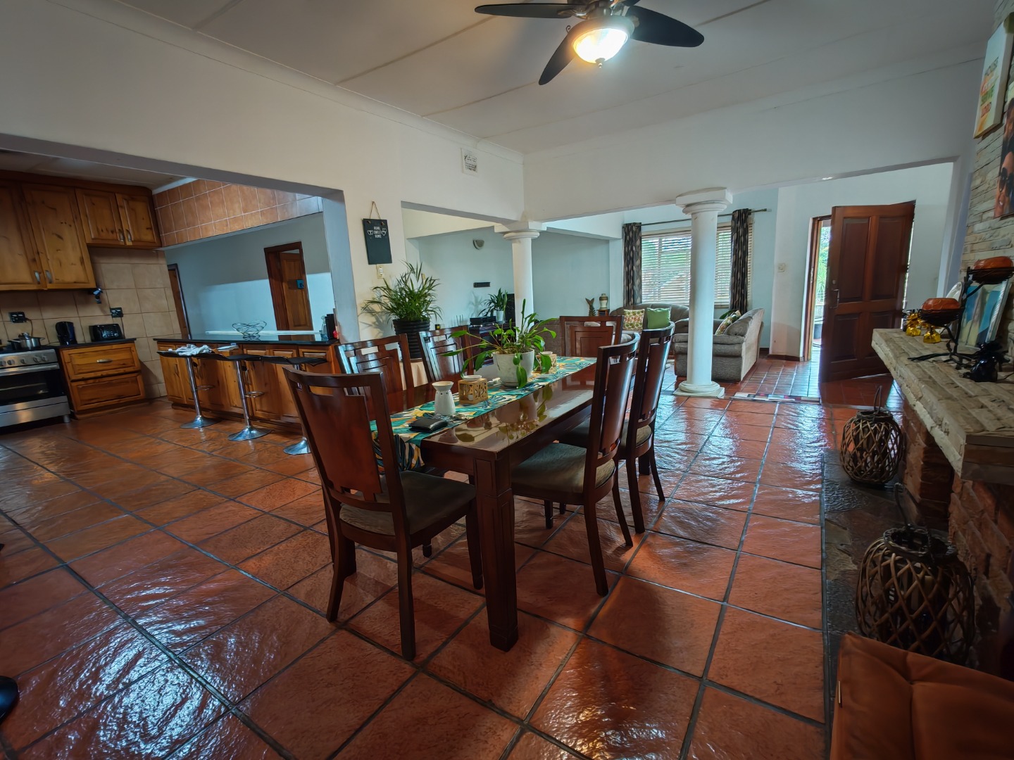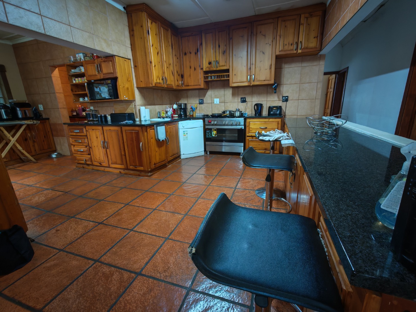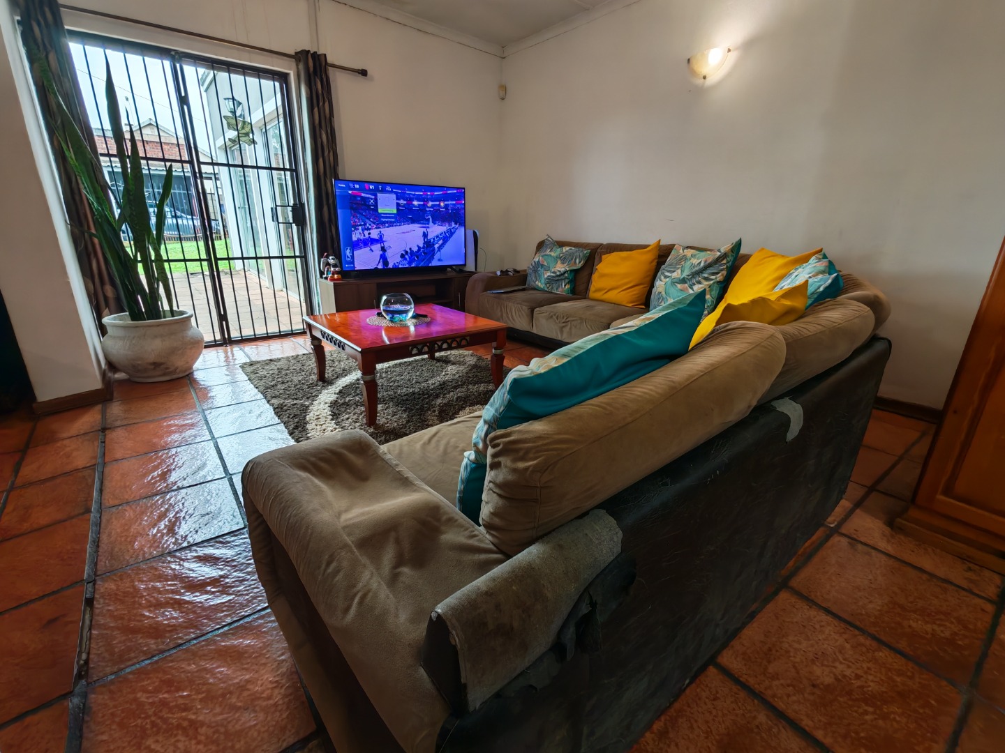The home welcomes you with a lovely open-plan layout, including a sizeable lounge, a well-fitted kitchen with elegant built-in cupboards and granite countertops, a separate scullery, and a dining area complete with a charming fireplace—perfect for cozy winter evenings. In addition, there is a separate TV lounge, providing ample space for relaxation and entertainment.