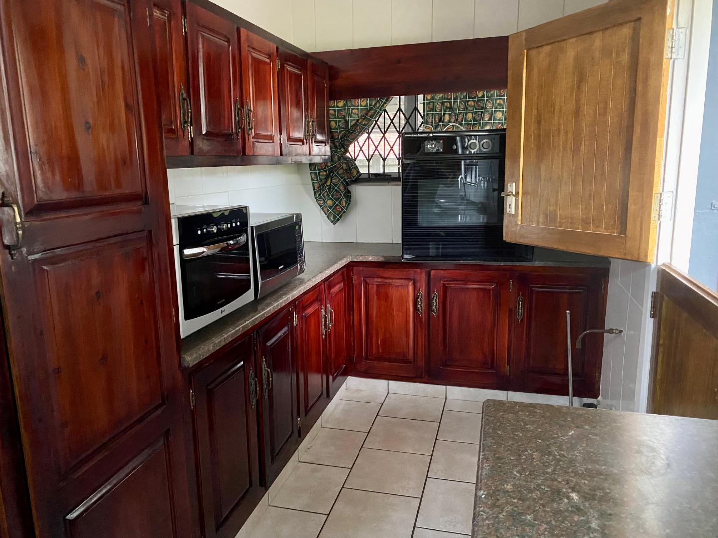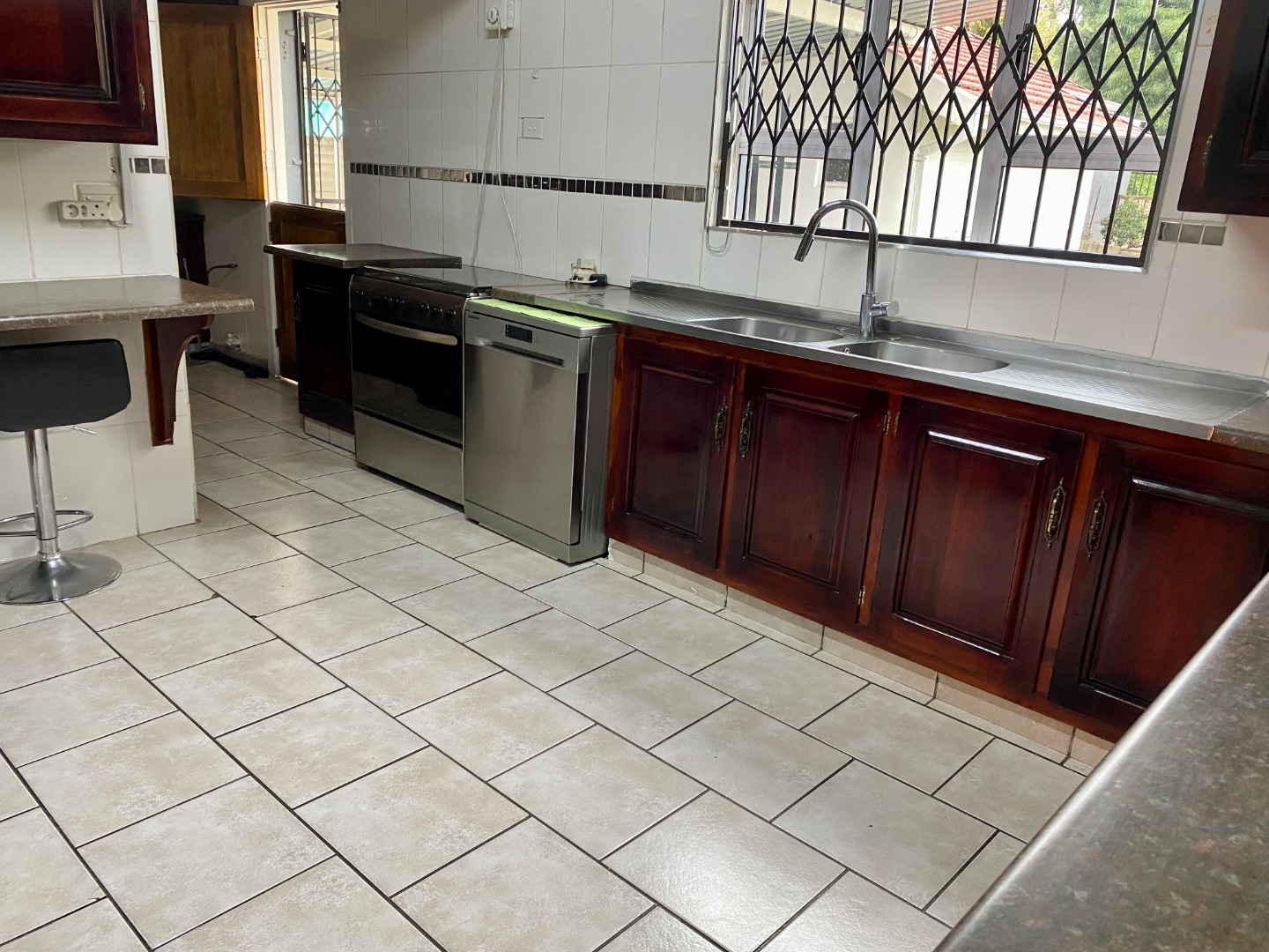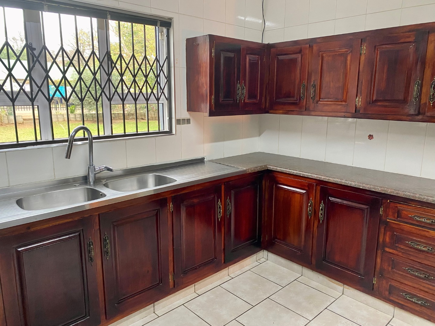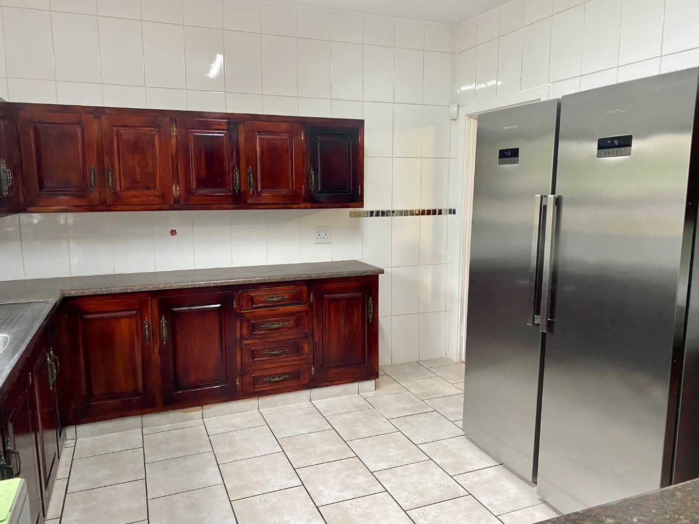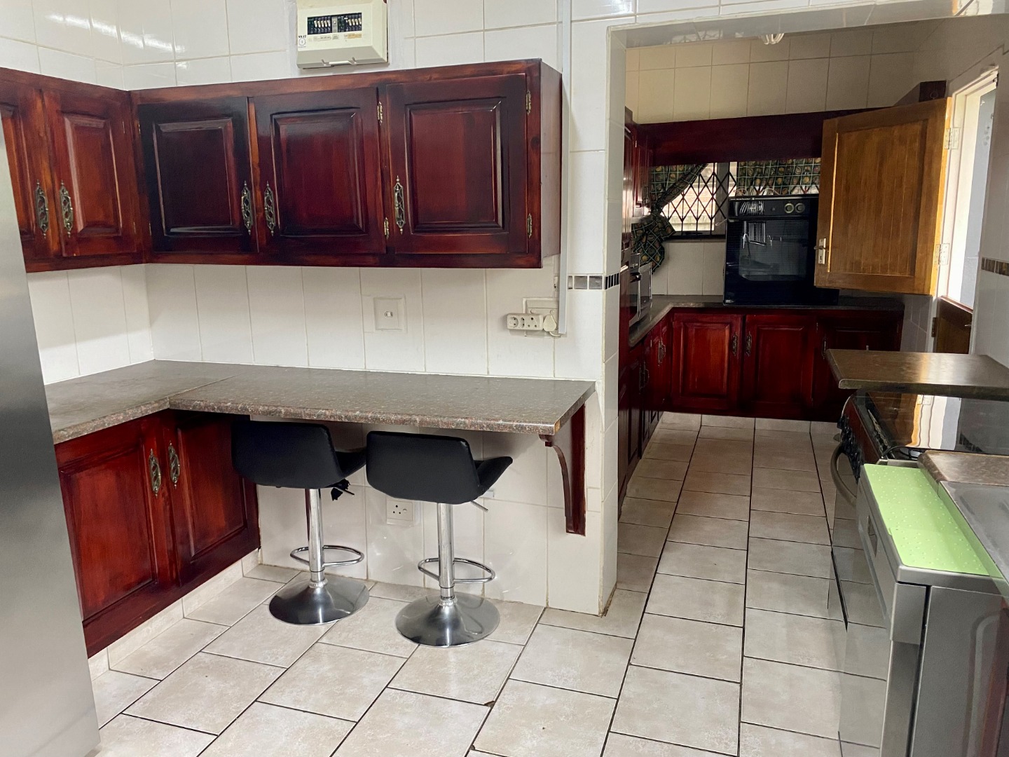 The kitchen is well-appointed with fitted cupboards, a double sink and space for a double door fridge, adjacent to a practical separate dining and living zone that leads to an inviting covered verandah by the pool.