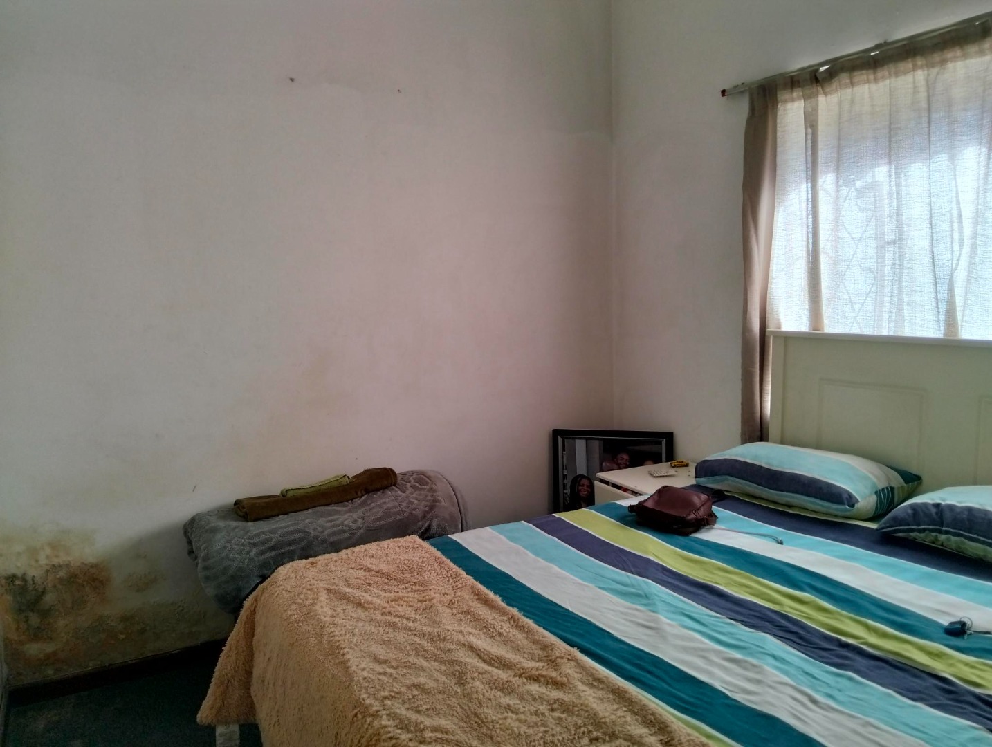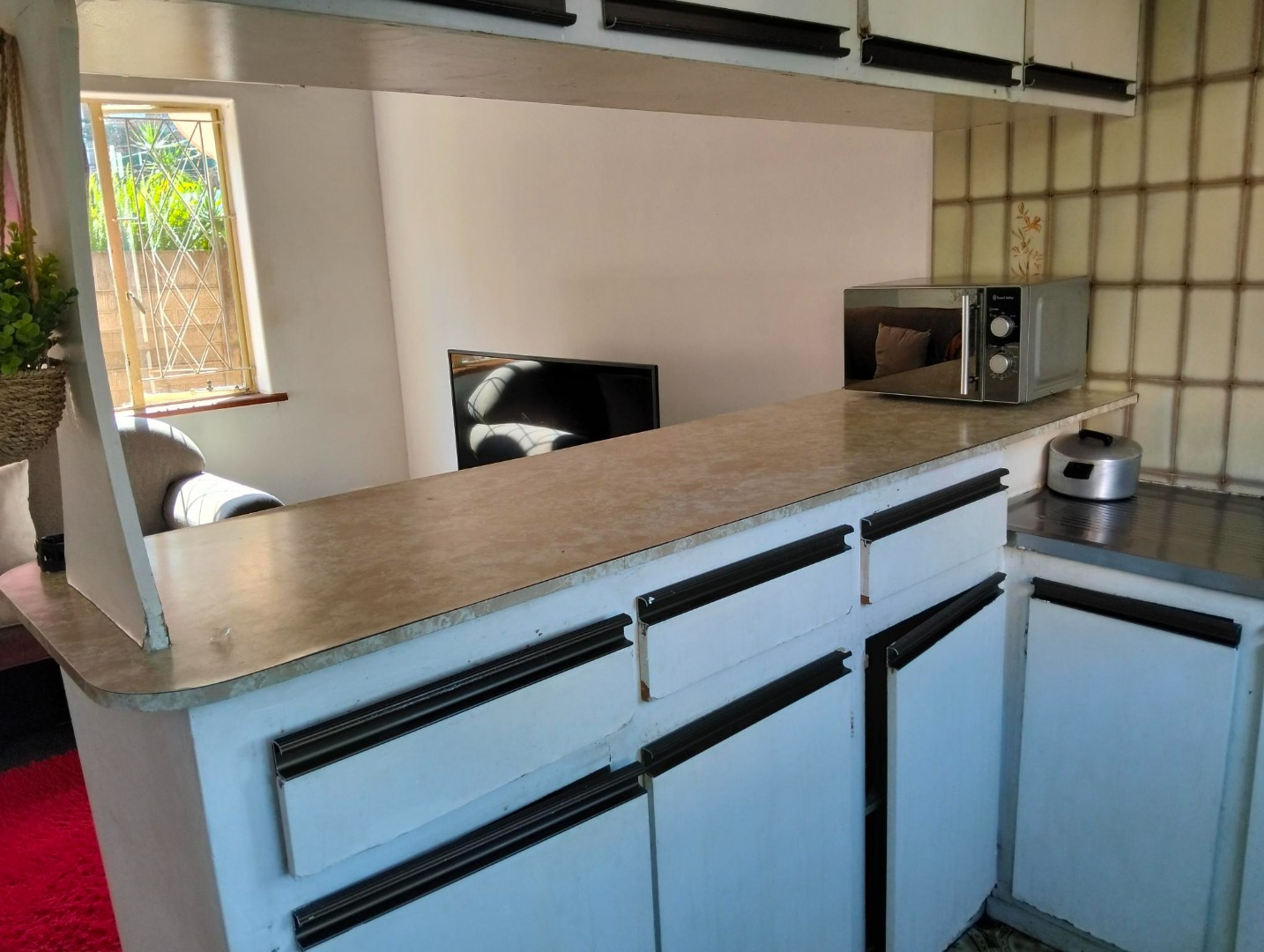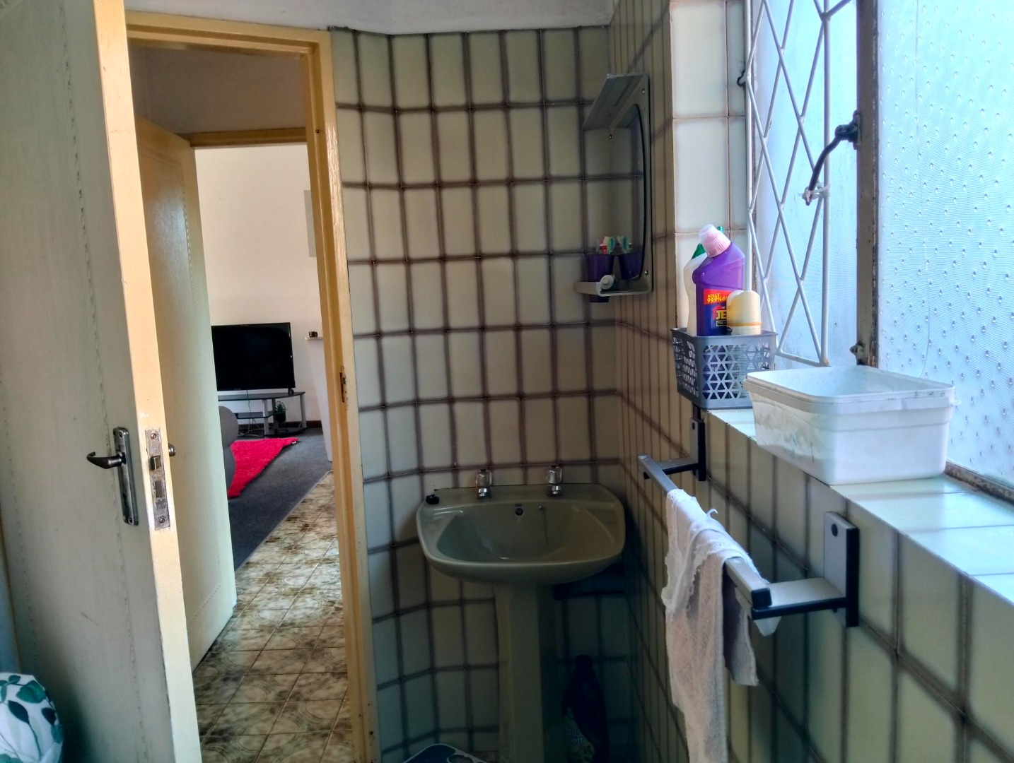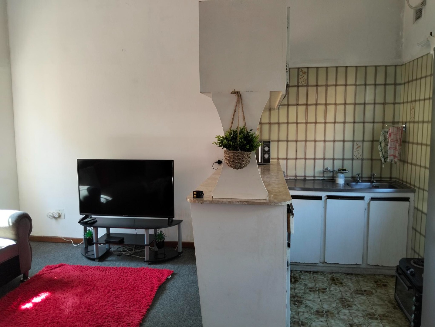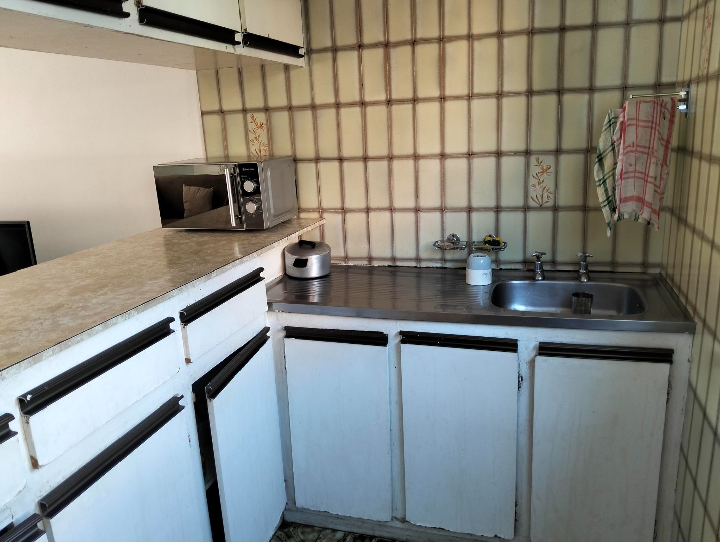 Ground floor 1-bedroom flat for sale in central town. This tiled unit features a fitted kitchen, a bedroom with built-in cupboards, and a bathroom with a bath, basin, toilet, and shower over the bath.