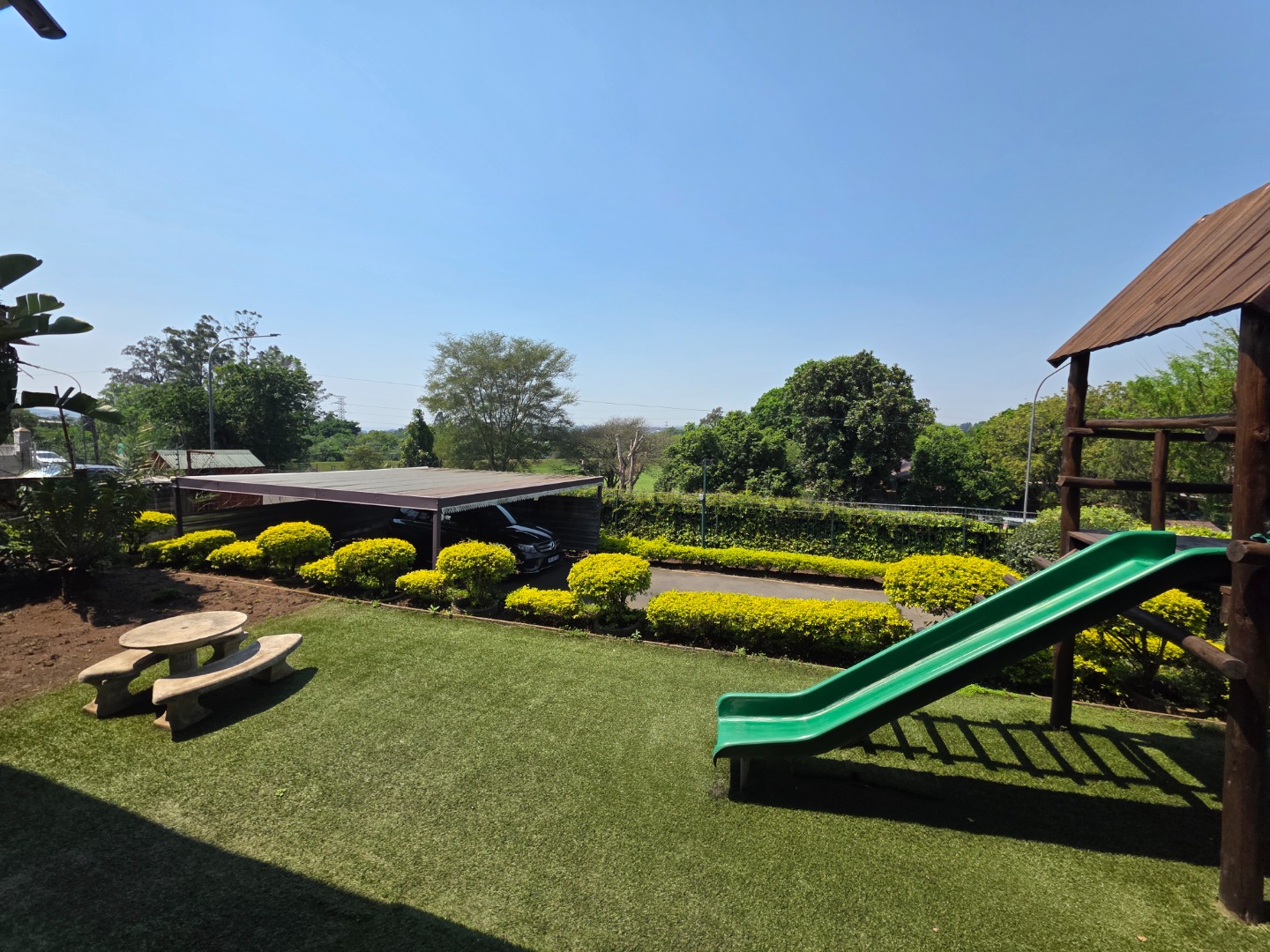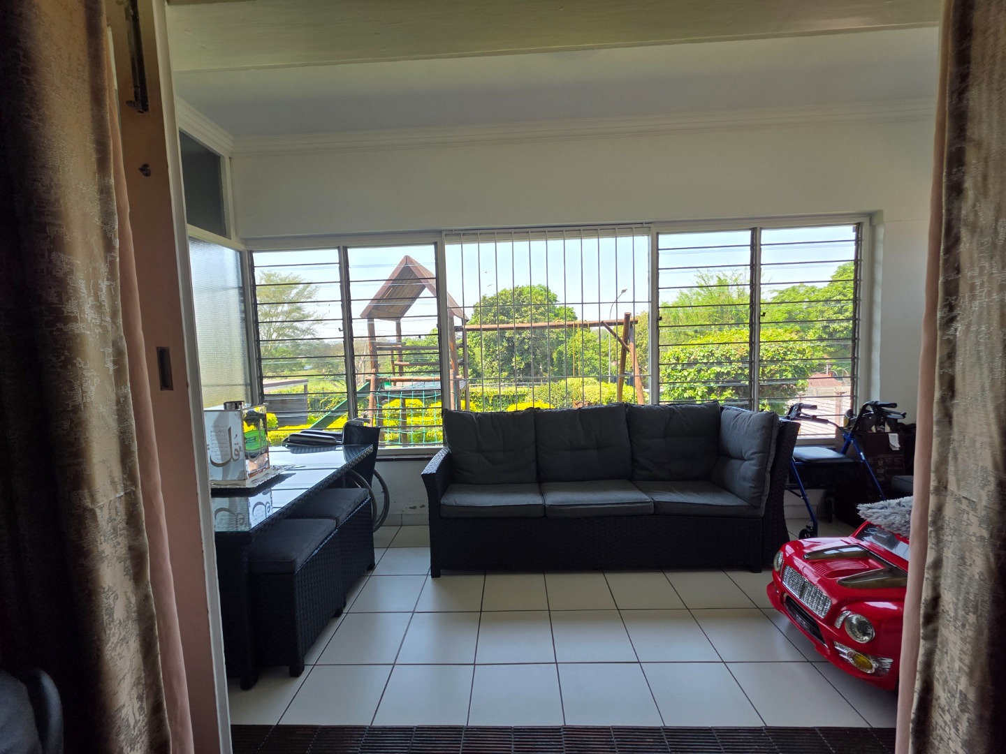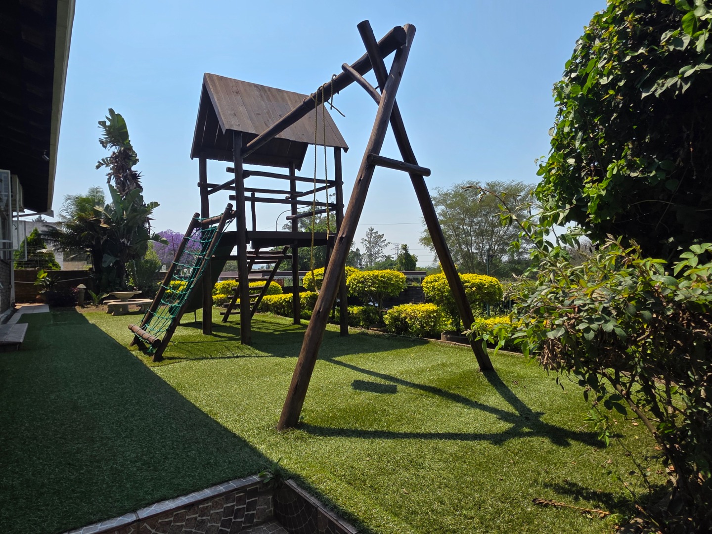 The family-friendly lounge/TV room opens to a secure outdoor area with a jungle gym - perfect for kids.