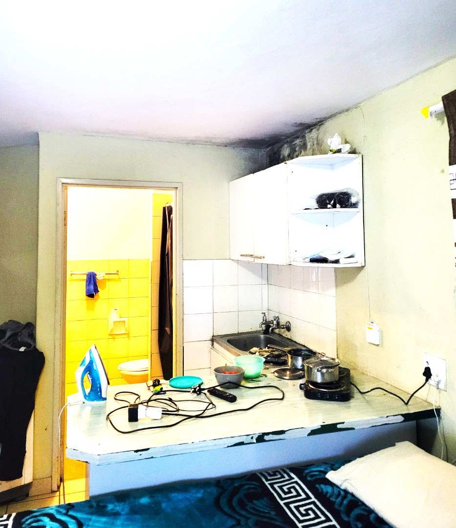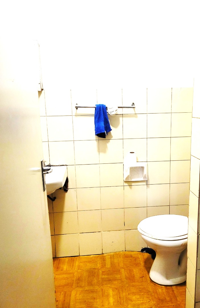 This one-bedroom flat comes with a tall wardrobe and a bathroom with a toilet and basin. It’s a little dated but has good potential if you’d like to modernize it.